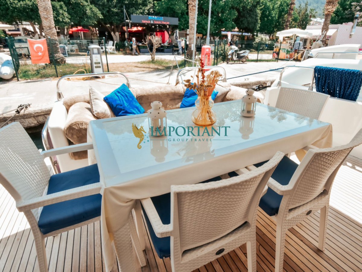 Göcek'te kiralık motor yatımız ile yaşayacağınız bu eşsiz deneyimde hem evinizdeki gibi rahat hissedebilir hem de Ege' nin göz alıcı maviliklerinde özgürlüğün tadını çıkarabilirsiniz.