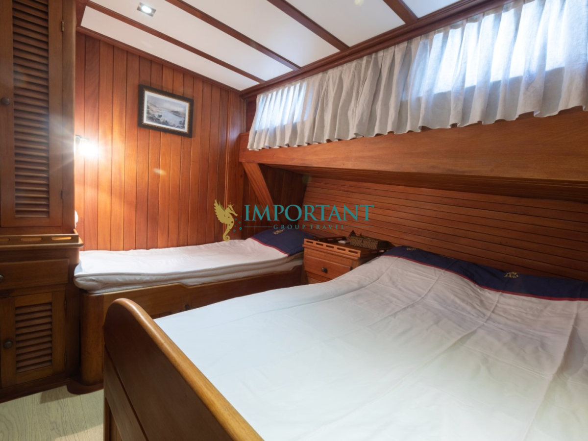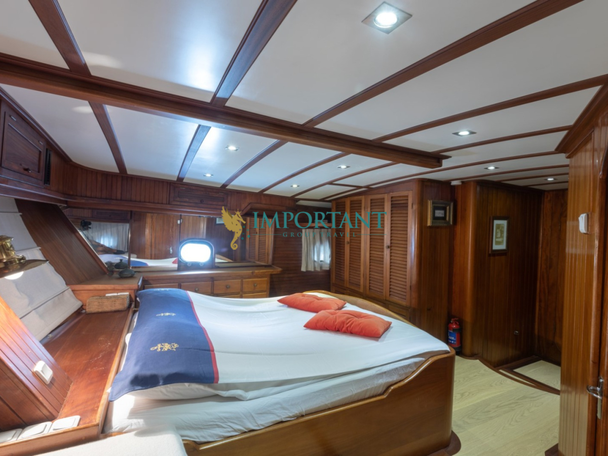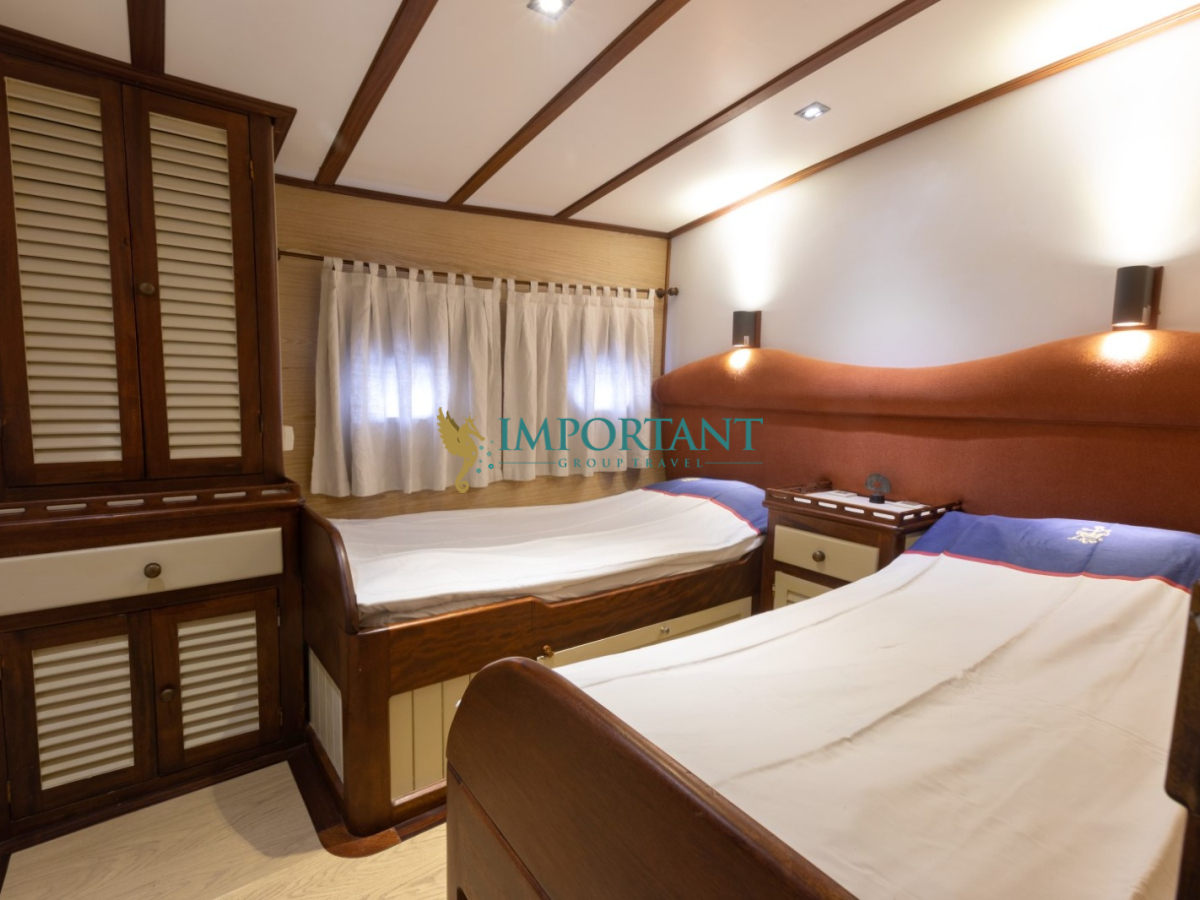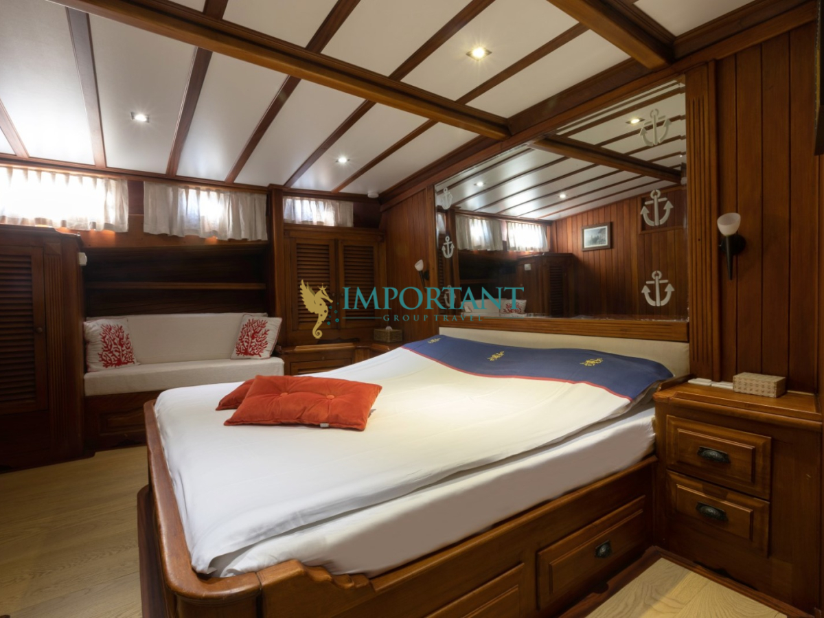 27 metre uzunluğundaki bu lüks gulet, Bodrum çıkışlı olarak Ege Denizi’nin büyüleyici koylarını ve masmavi sularını keşfetmeniz için eşsiz bir fırsat sunuyor. 2 adet master, 2 adet double ve 1 adet hem tek kişilik hem de çift kişilik yataklı Triple kabini ile toplamda 11 kişilik konaklama kapasitesine sahip olan teknemiz, konfor ve lüksü bir arada sunmak üzere tasarlanmıştır.