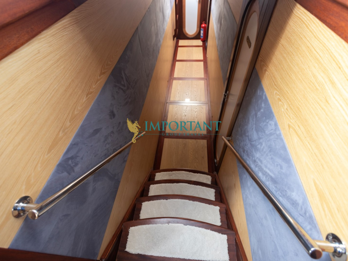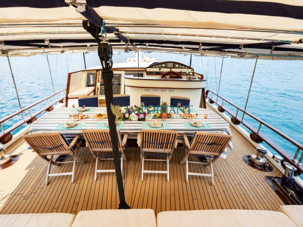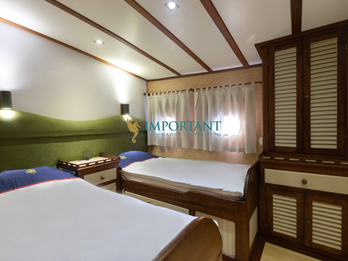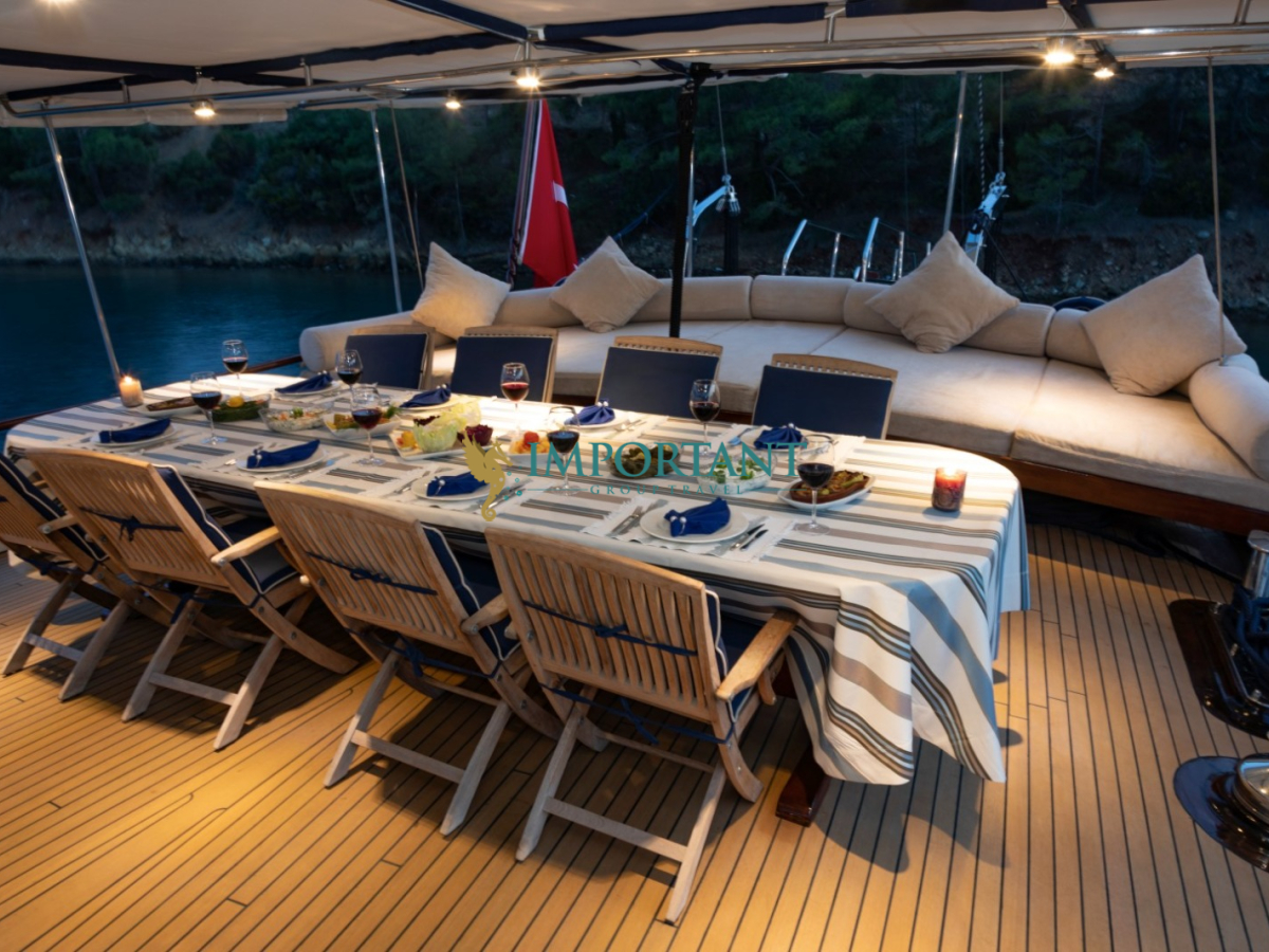27 metre uzunluğundaki bu lüks gulet, Bodrum çıkışlı olarak Ege Denizi’nin büyüleyici koylarını ve masmavi sularını keşfetmeniz için eşsiz bir fırsat sunuyor. 2 adet master, 2 adet double ve 1 adet hem tek kişilik hem de çift kişilik yataklı Triple kabini ile toplamda 11 kişilik konaklama kapasitesine sahip olan teknemiz, konfor ve lüksü bir arada sunmak üzere tasarlanmıştır.