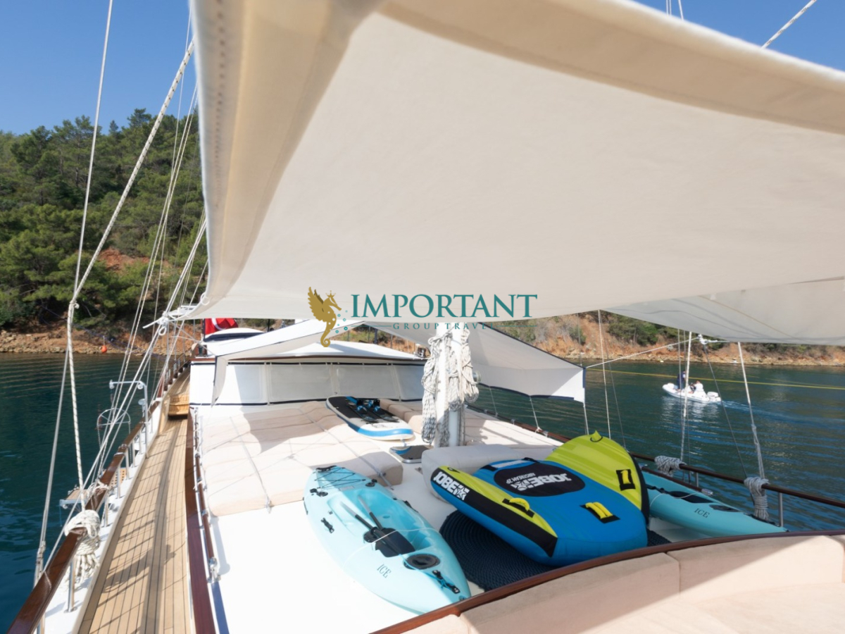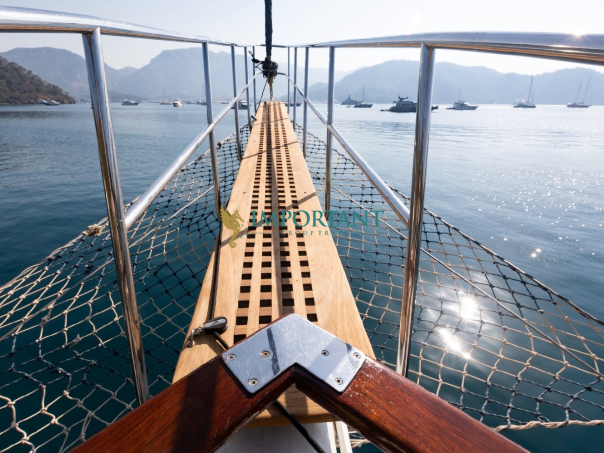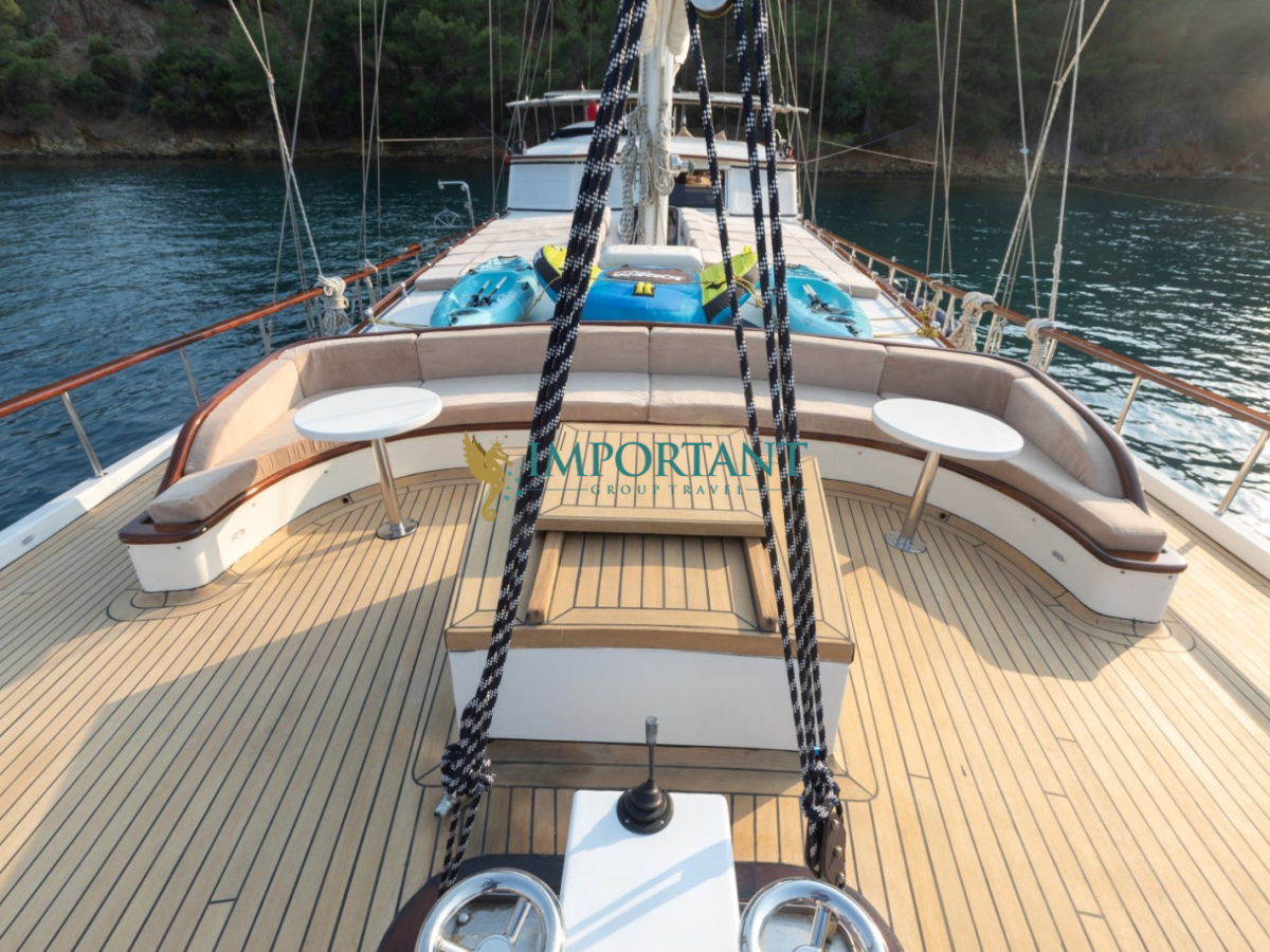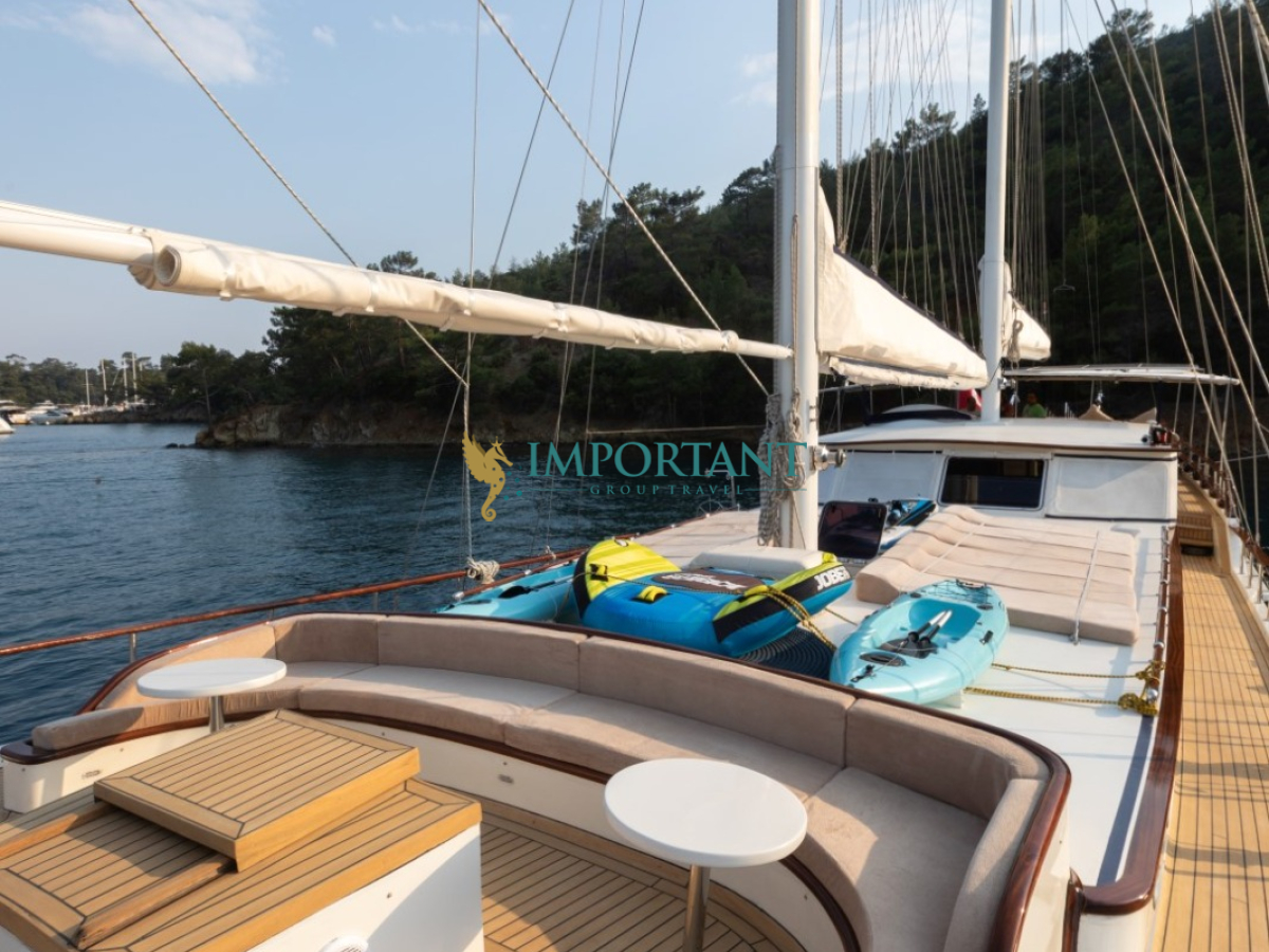 Bodrum çıkışlı bu lüks guletimizle unutulmaz bir mavi yolculuğa çıkabilirsiniz. Farklı destinasyonları tercih eden misafirlerimiz için Marmaris'in eşsiz doğal güzelliklerinin tadını çıkarabilir, Göcek’in gizli cennetlerini ziyaret edebilir veya Fethiye'nin kristal berraklığındaki sularında yüzebilir, Bozburun’un bozulmamış güzelliklerinde de zaman geçirebilirsiniz; ayrıca maceranızı Yunan Adaları’na kadar uzatabilirsiniz (Yunan Adaları için ekstra ücretler hakkında bilgi almak için bizimle iletişime geçin). Bu unutulmaz deneyimde hem evinizdeymiş gibi huzurlu hissedecek hem de Ege’nin masmavi sularında özgürlüğün tadını çıkaracaksınız.