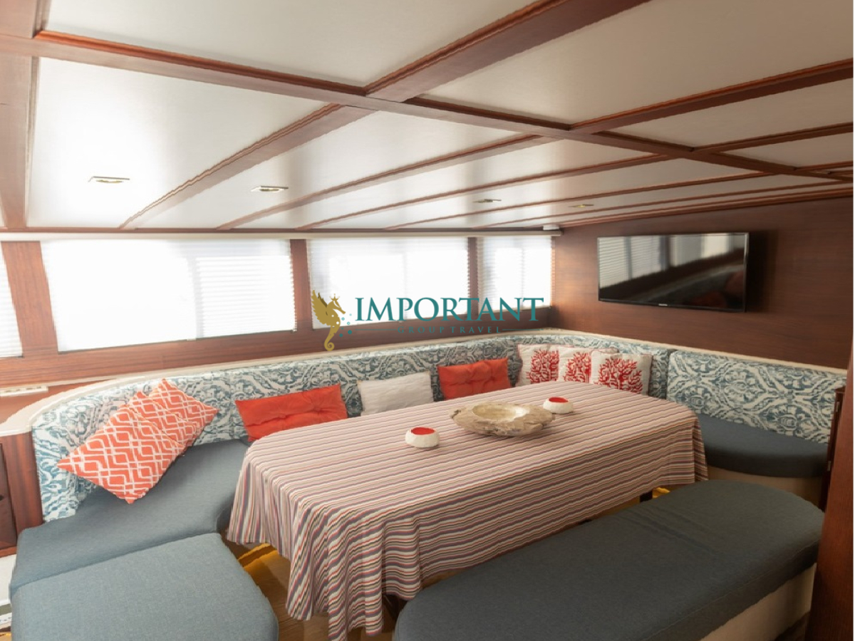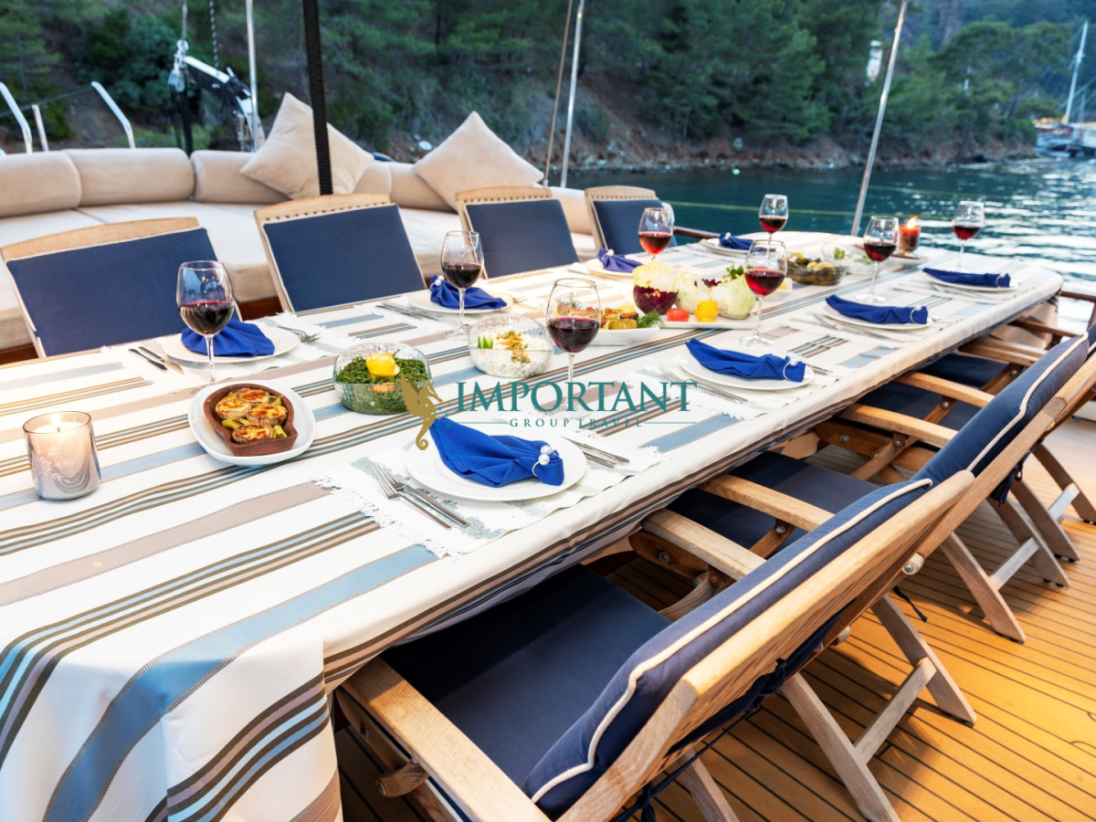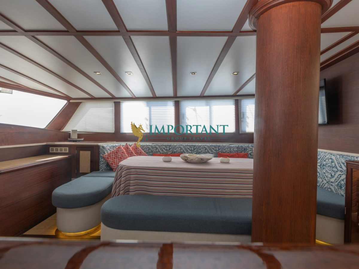 İç dizaynı, misafirlerimizin ihtiyaçlarını karşılamak üzere özenle dekore edilmiştir. Geniş salonunda ve güvertesinde yer alan yemek masaları, sevdiklerinizle birlikte keyifli yemekler yiyebileceğiniz alanlar sunmaktadır. Tam donanımlı mutfağı, teknede geçirdiğiniz süre boyunca tüm gereksinimlerinizi karşılar. Her kabinde duş, wc ve klima bulunmaktadır; böylece denizde bile evinizin rahatlığını hissedebilirsiniz.