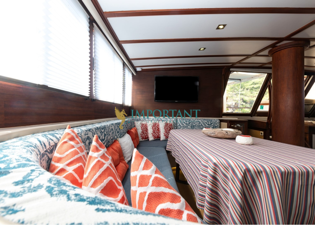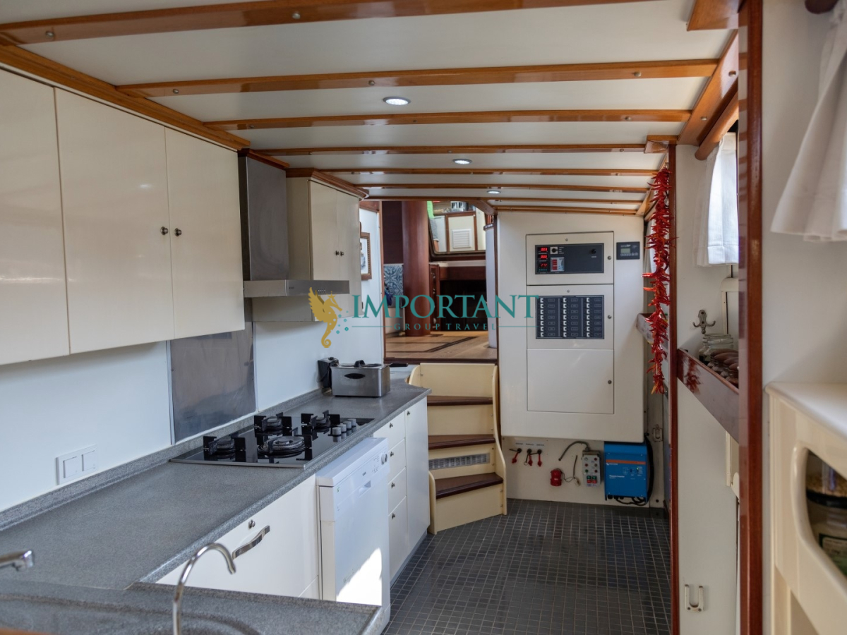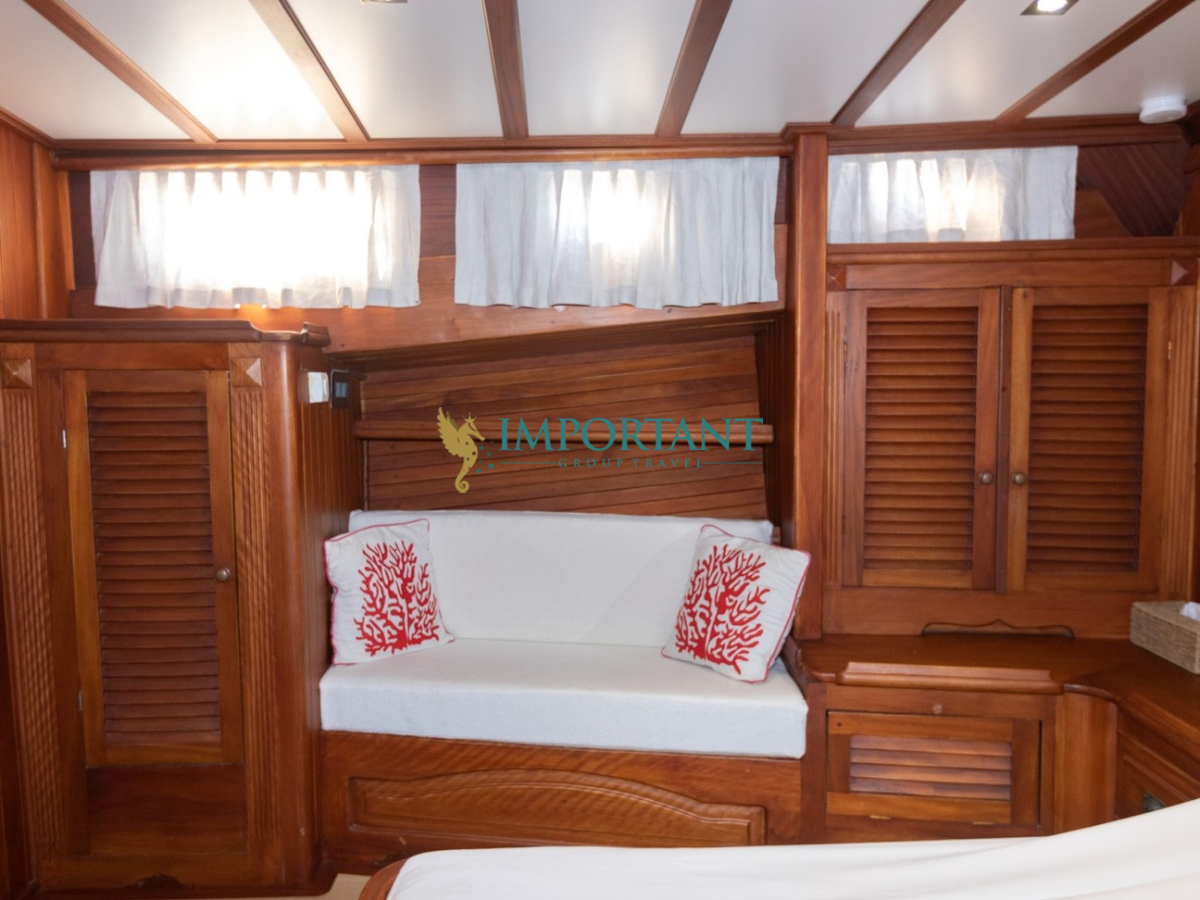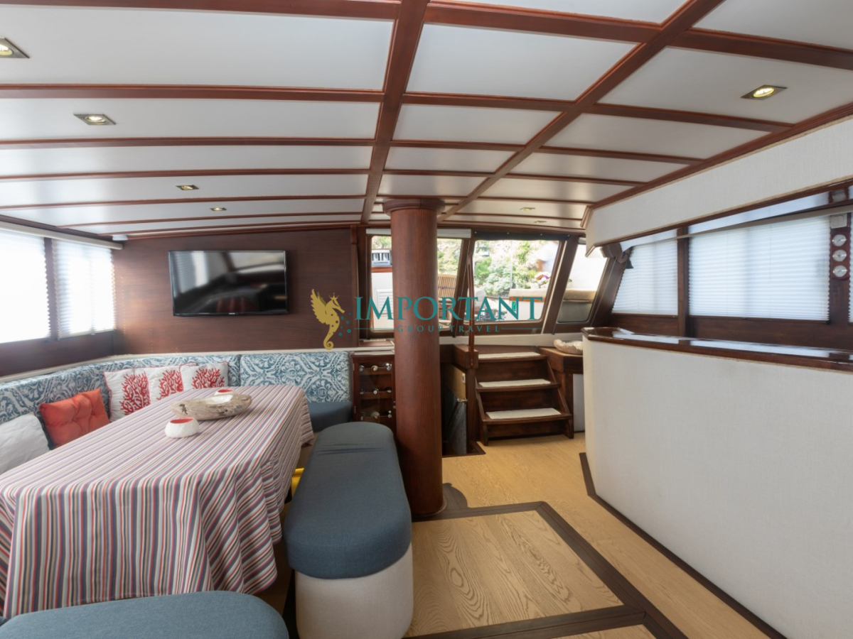 İç dizaynı, misafirlerimizin ihtiyaçlarını karşılamak üzere özenle dekore edilmiştir. Geniş salonunda ve güvertesinde yer alan yemek masaları, sevdiklerinizle birlikte keyifli yemekler yiyebileceğiniz alanlar sunmaktadır. Tam donanımlı mutfağı, teknede geçirdiğiniz süre boyunca tüm gereksinimlerinizi karşılar. Her kabinde duş, wc ve klima bulunmaktadır; böylece denizde bile evinizin rahatlığını hissedebilirsiniz.