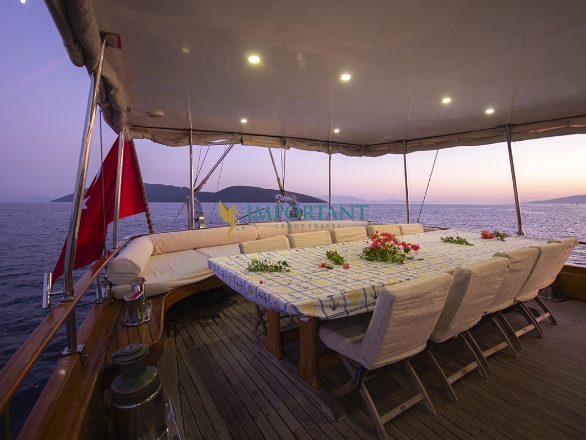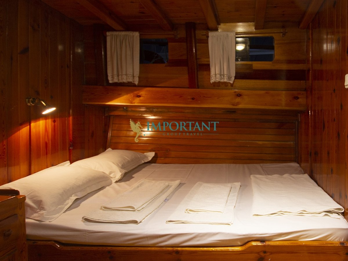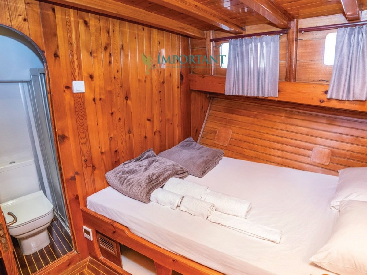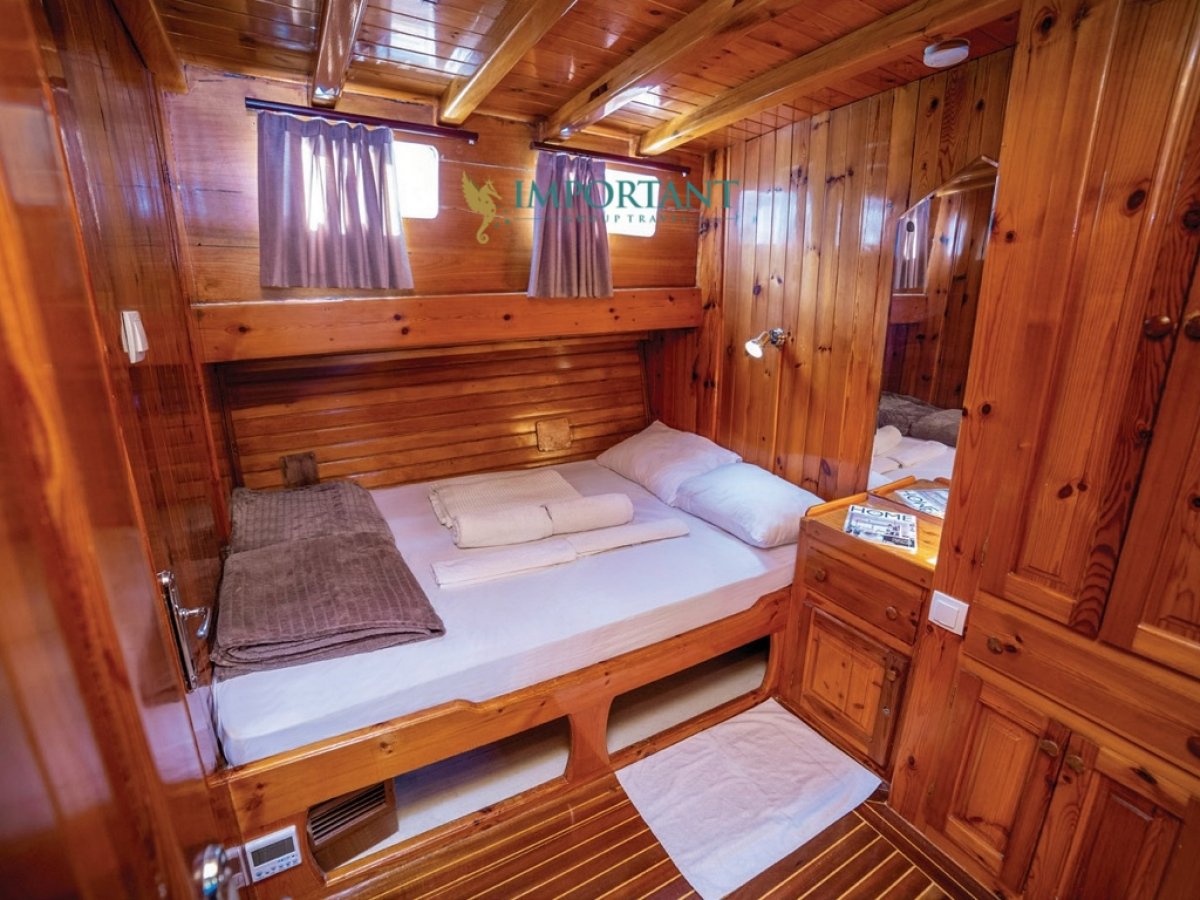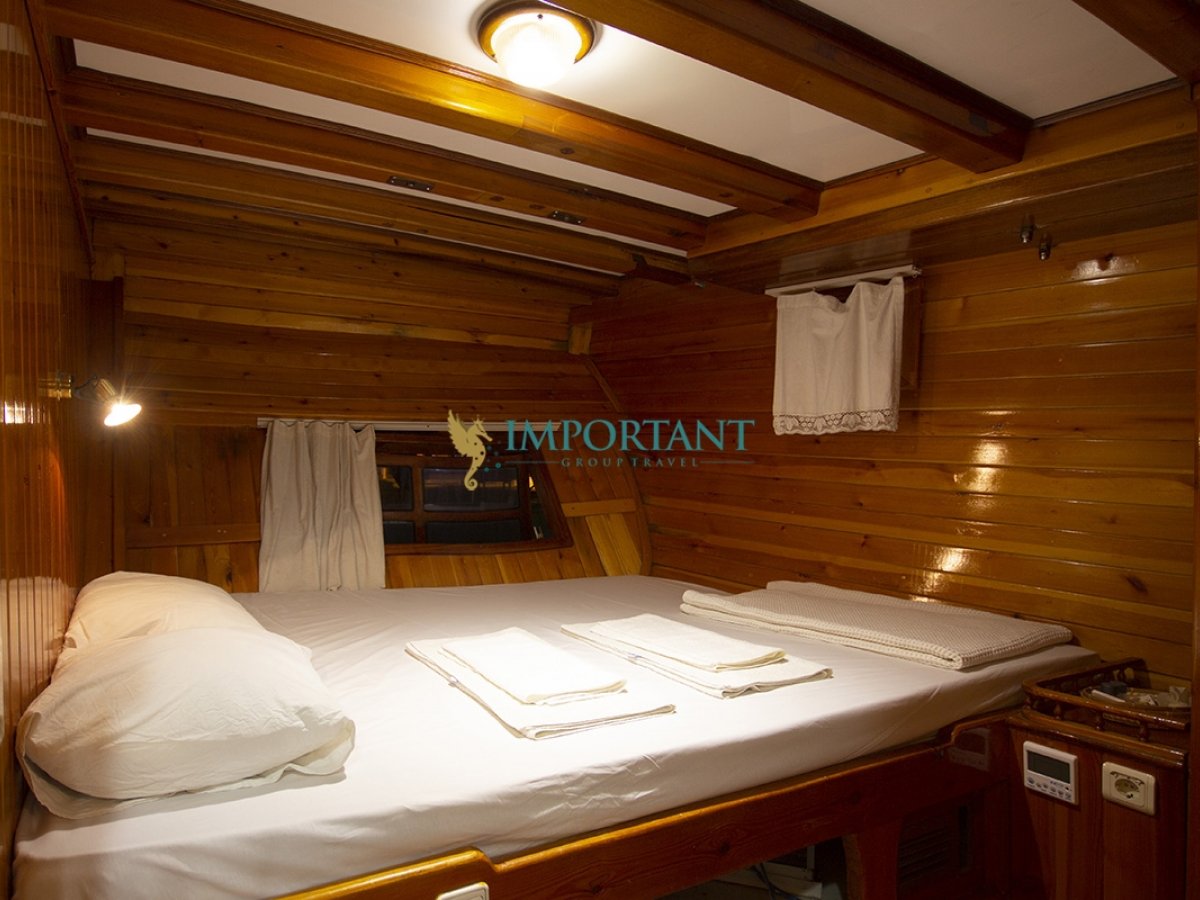 İç dizaynı, misafirlerimizin ihtiyaçlarını karşılamak üzere sade ve konforlu bir şekilde düzenlenmiştir. Geniş salonu ve güvertesinde yer alan yemek masaları ile sevdiklerinizle birlikte keyifli vakit geçirebileceğiniz alanlar sunmaktadır. Tam donanımlı mutfağımız, teknede geçirdiğiniz süre boyunca tüm gereksinimlerinizi karşılar. Her kabinde duş, wc ve klima bulunmaktadır. Bodrum çıkışlı bu guletimizle unutulmaz bir mavi yolculuğa çıkabilir, denizde de olsa evinizin rahatlığını hissedebilirsiniz.