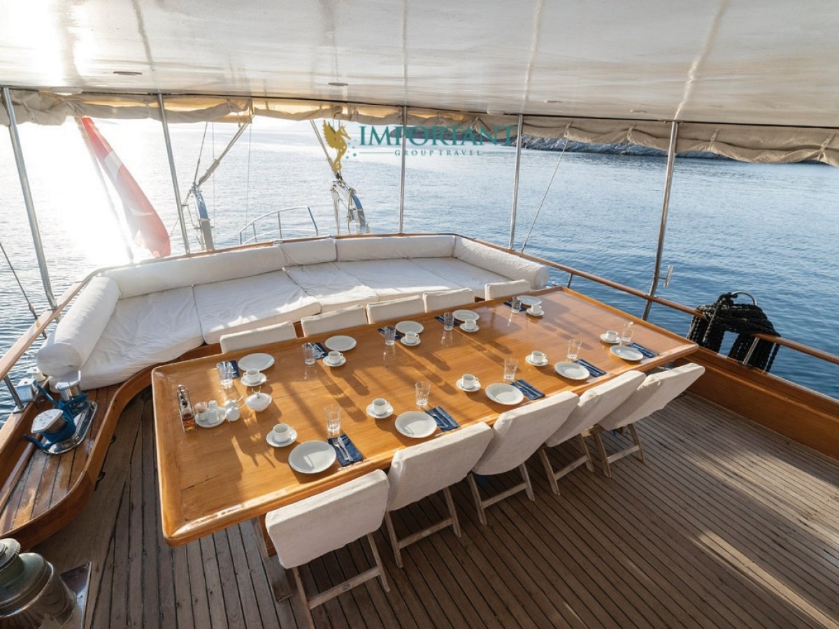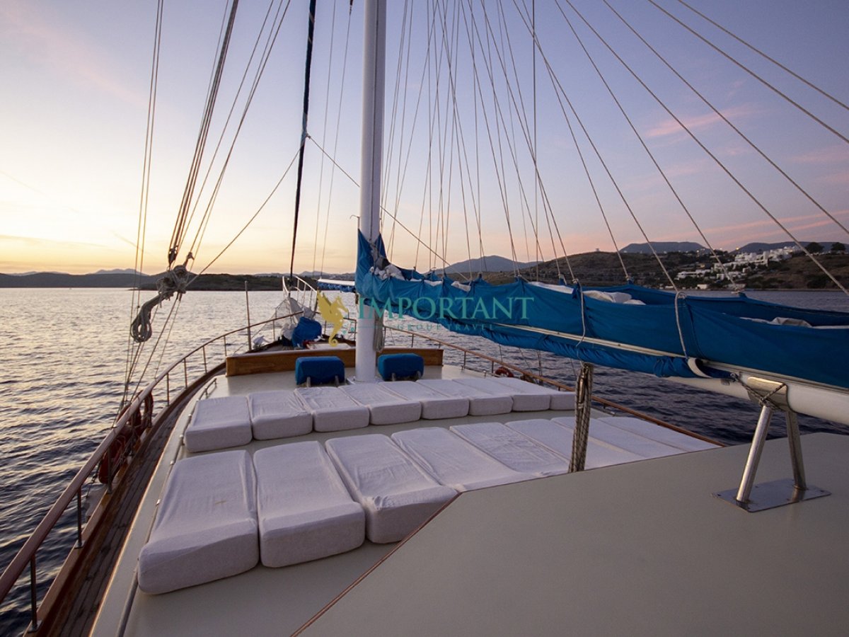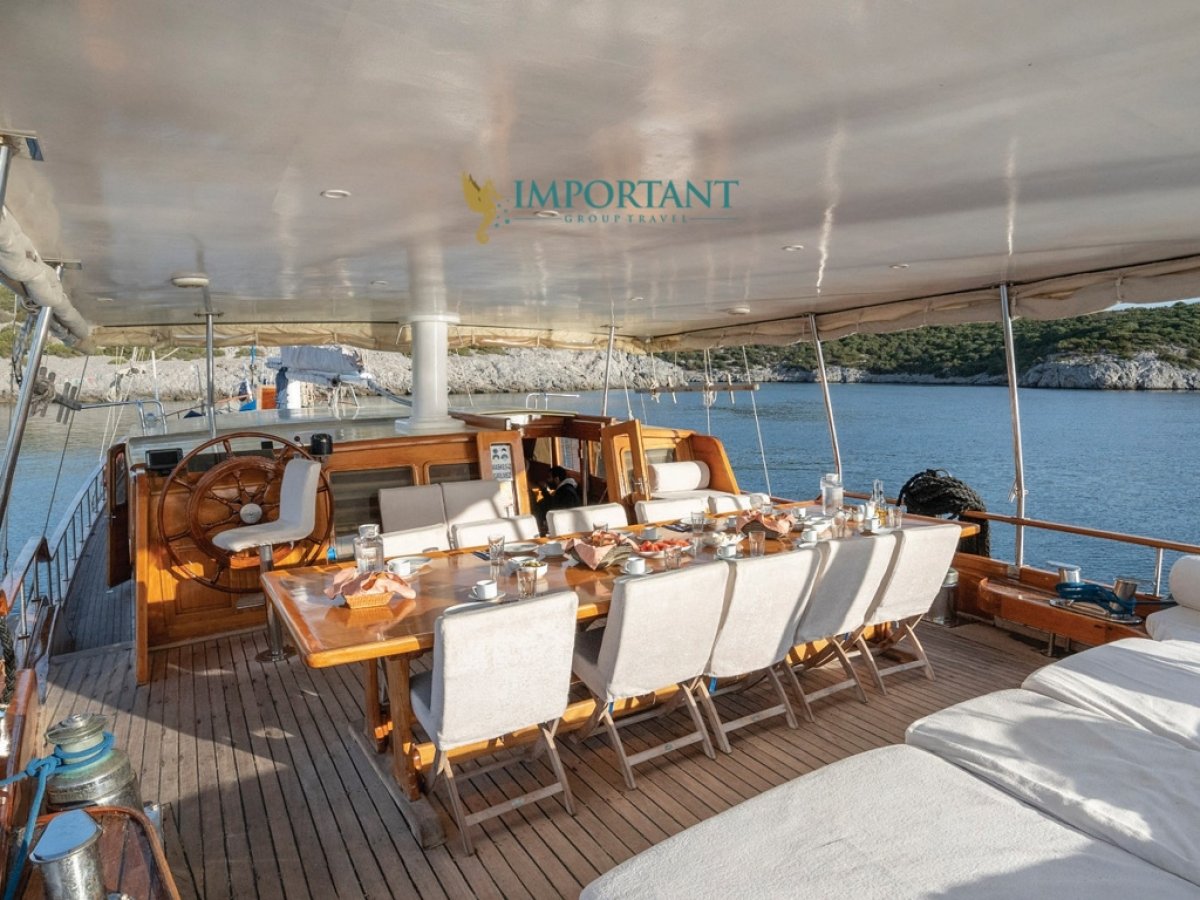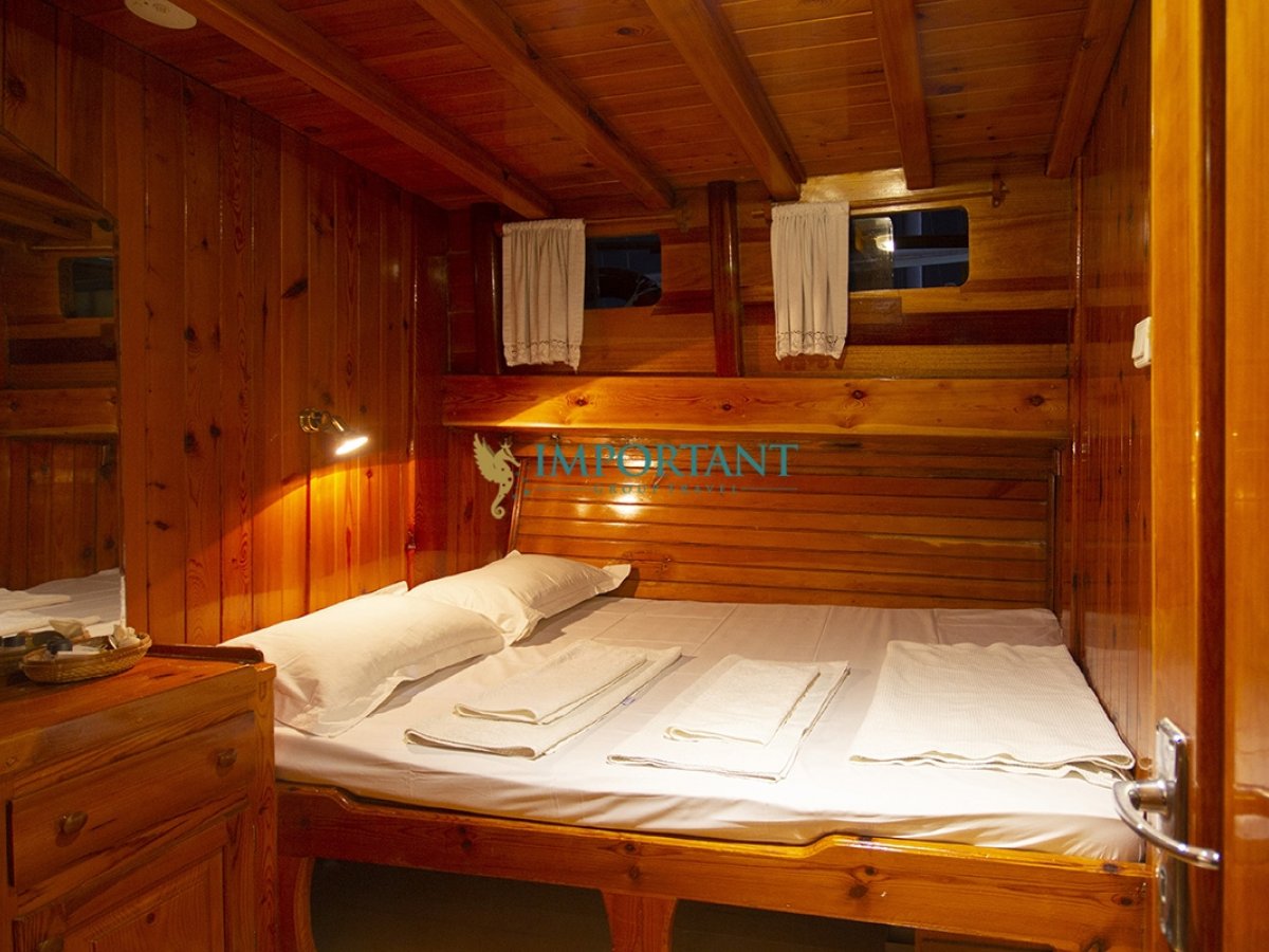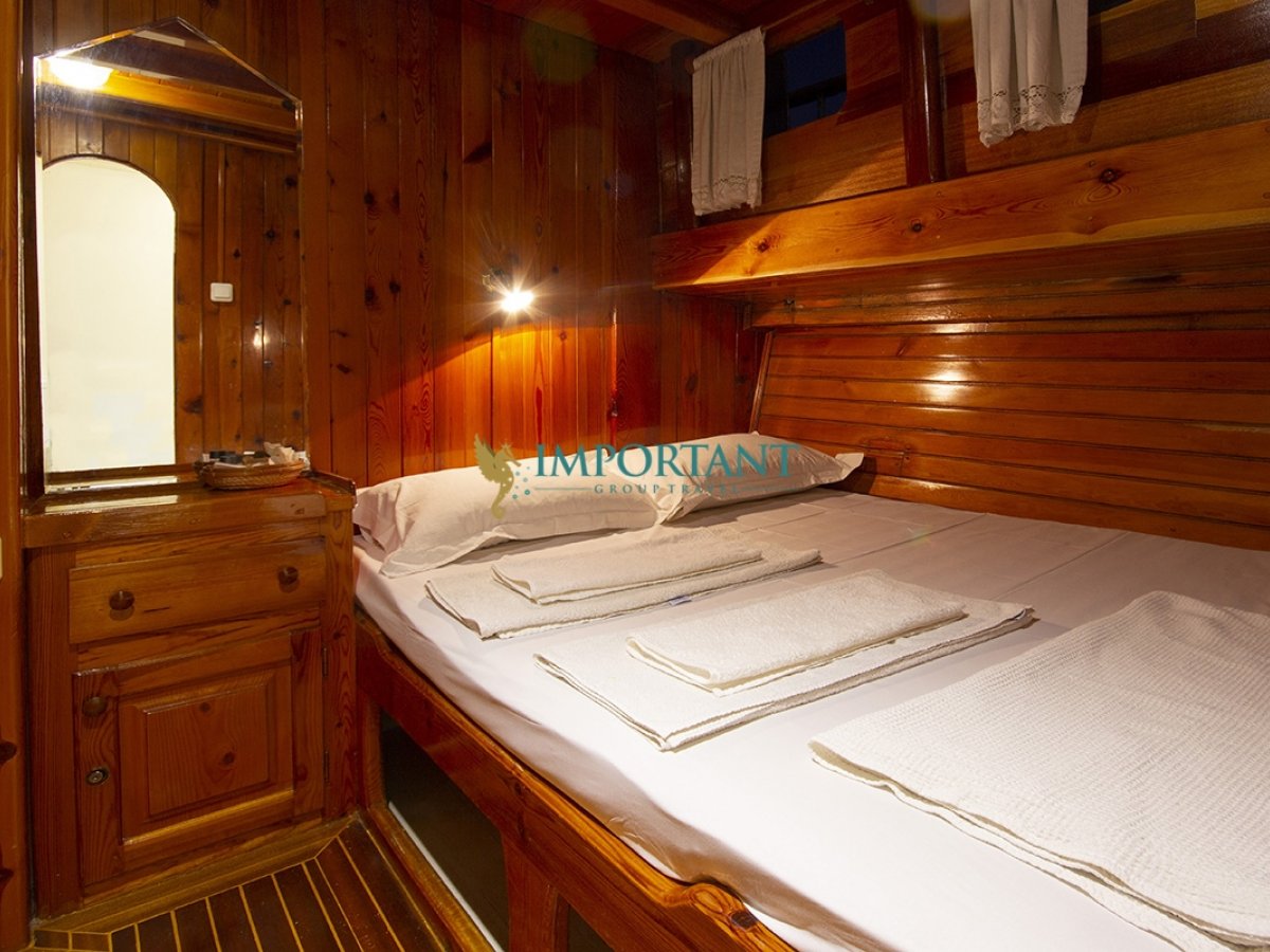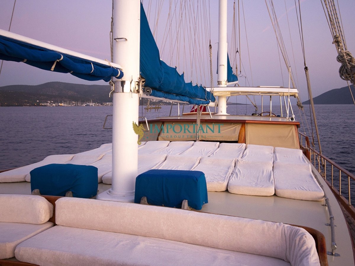 İç dizaynı, misafirlerimizin ihtiyaçlarını karşılamak üzere sade ve konforlu bir şekilde düzenlenmiştir. Geniş salonu ve güvertesinde yer alan yemek masaları ile sevdiklerinizle birlikte keyifli vakit geçirebileceğiniz alanlar sunmaktadır. Tam donanımlı mutfağımız, teknede geçirdiğiniz süre boyunca tüm gereksinimlerinizi karşılar. Her kabinde duş, wc ve klima bulunmaktadır. Bodrum çıkışlı bu guletimizle unutulmaz bir mavi yolculuğa çıkabilir, denizde de olsa evinizin rahatlığını hissedebilirsiniz.
