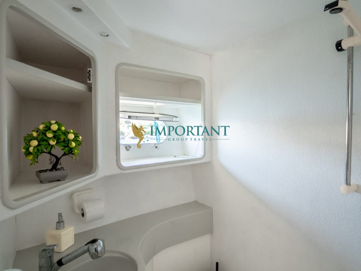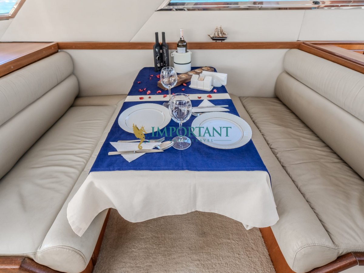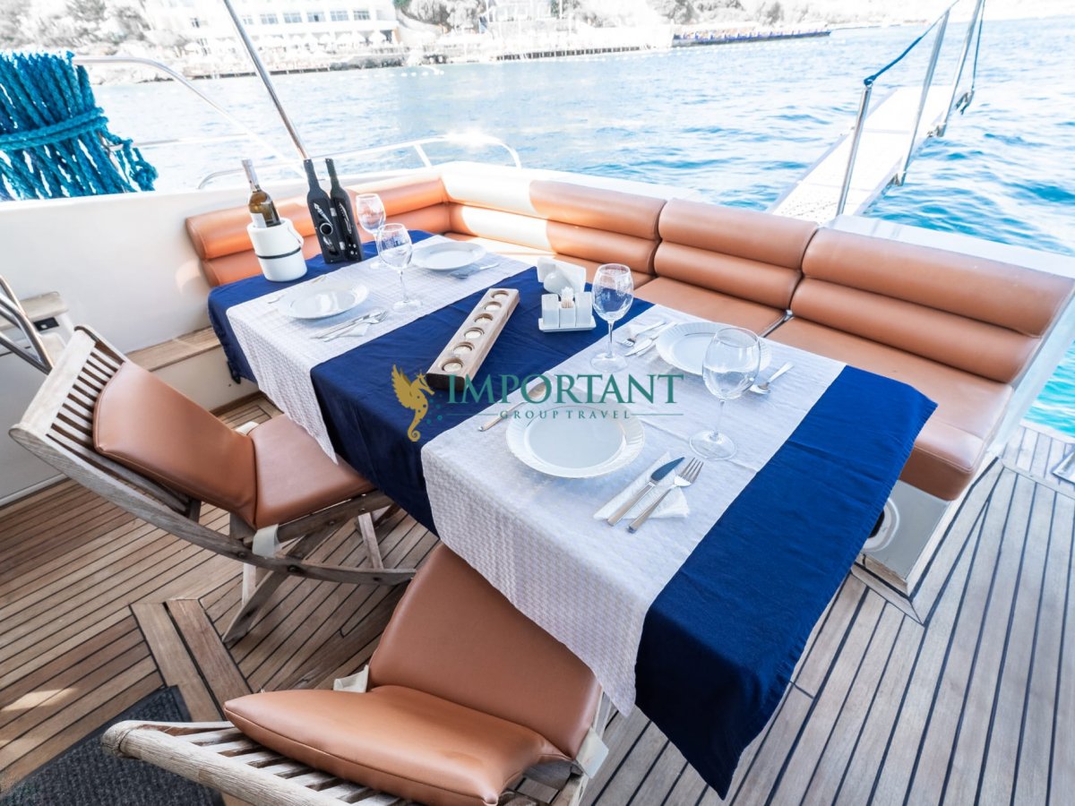 Yatımızın iç dizaynı misafirlerimizin tüm ihtiyacını karşılayacak şekilde dekore edilmiş olup, salonda ve güvertede yemek masalarına ve tam teşekküllü bir mutfağa sahiptir. Ayrıca her kabinimizde wc, duş ve klima mevcuttur.