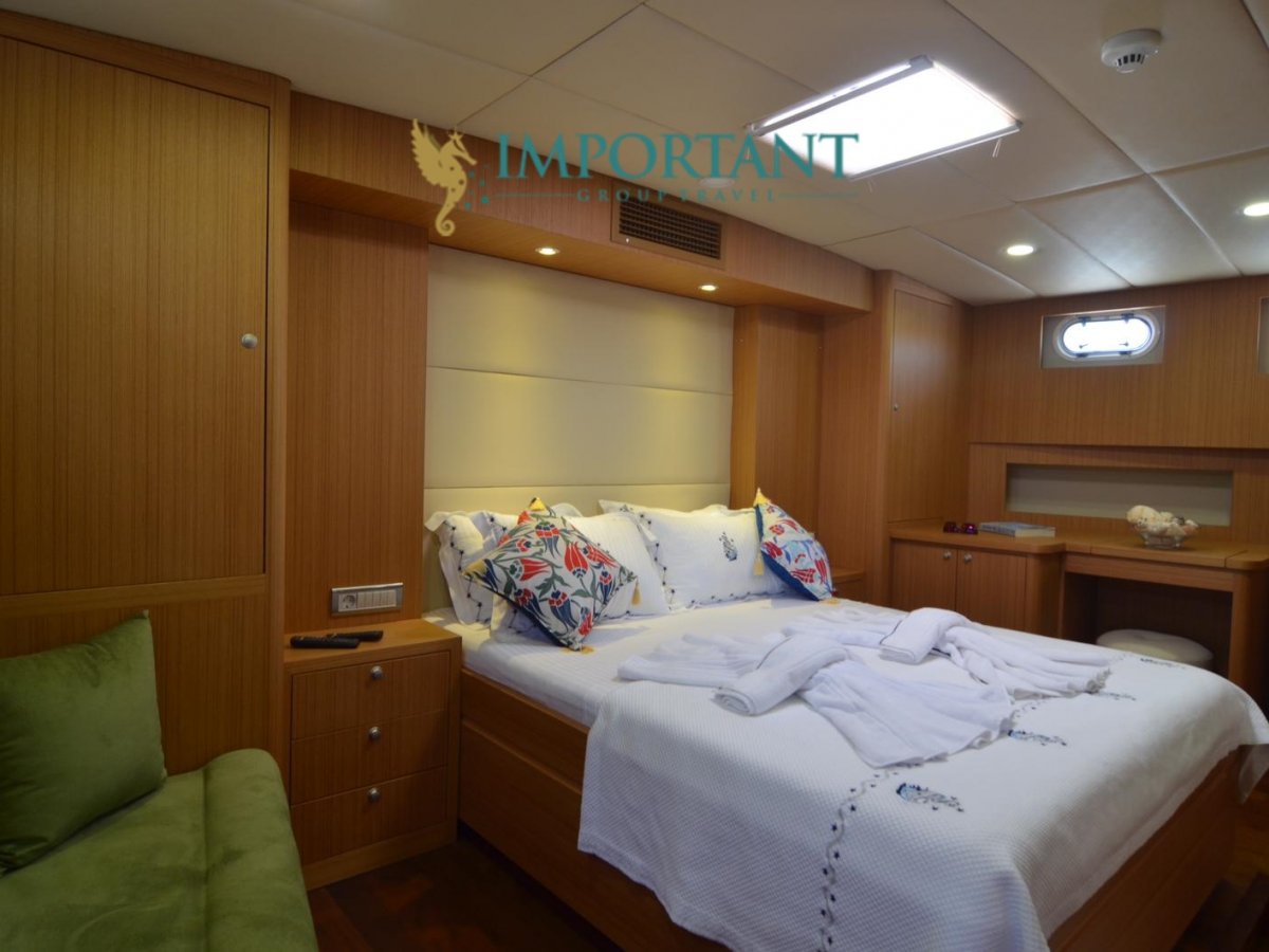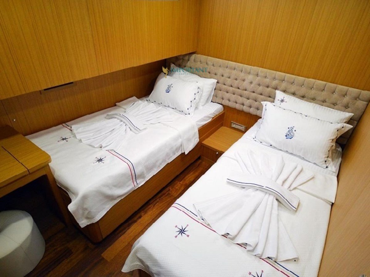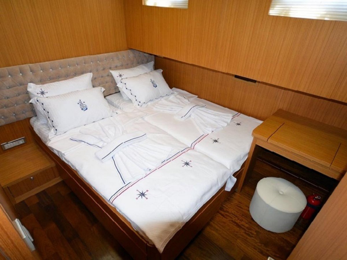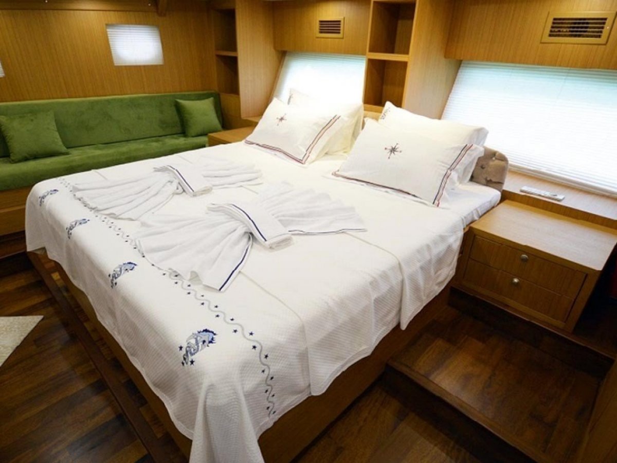 Bodrum çıkışlı 24 metre uzunluğundaki kiralık guletimiz, Ege Denizi’nin büyüleyici koylarını keşfetmeniz için harika bir fırsat sunuyor. Teknemiz, toplamda 8 kişilik konaklama kapasitesine sahip olup, 2 adet çift kişilik yataklı Master, 2 adet çift kişilik yataklı Double (Ayrılabilir yatak) kabin ile donatılmıştır.