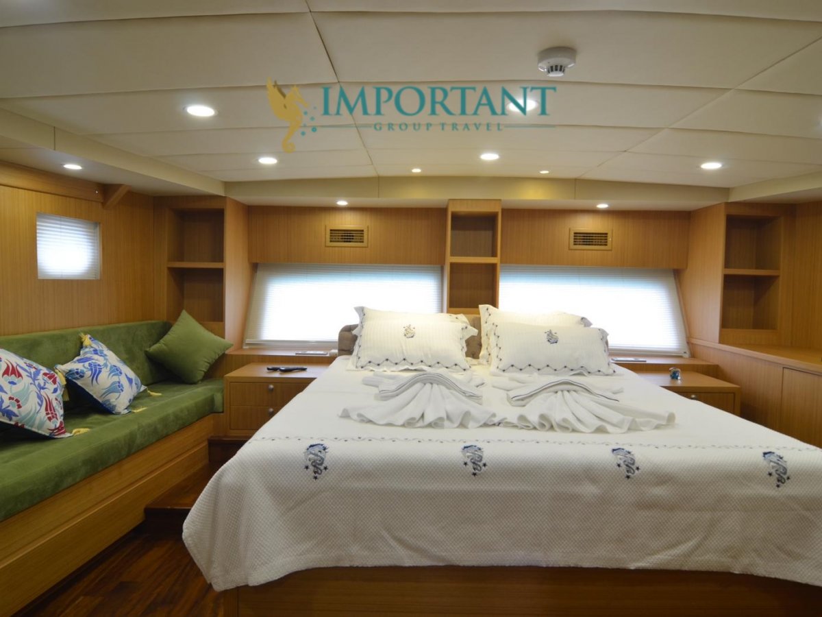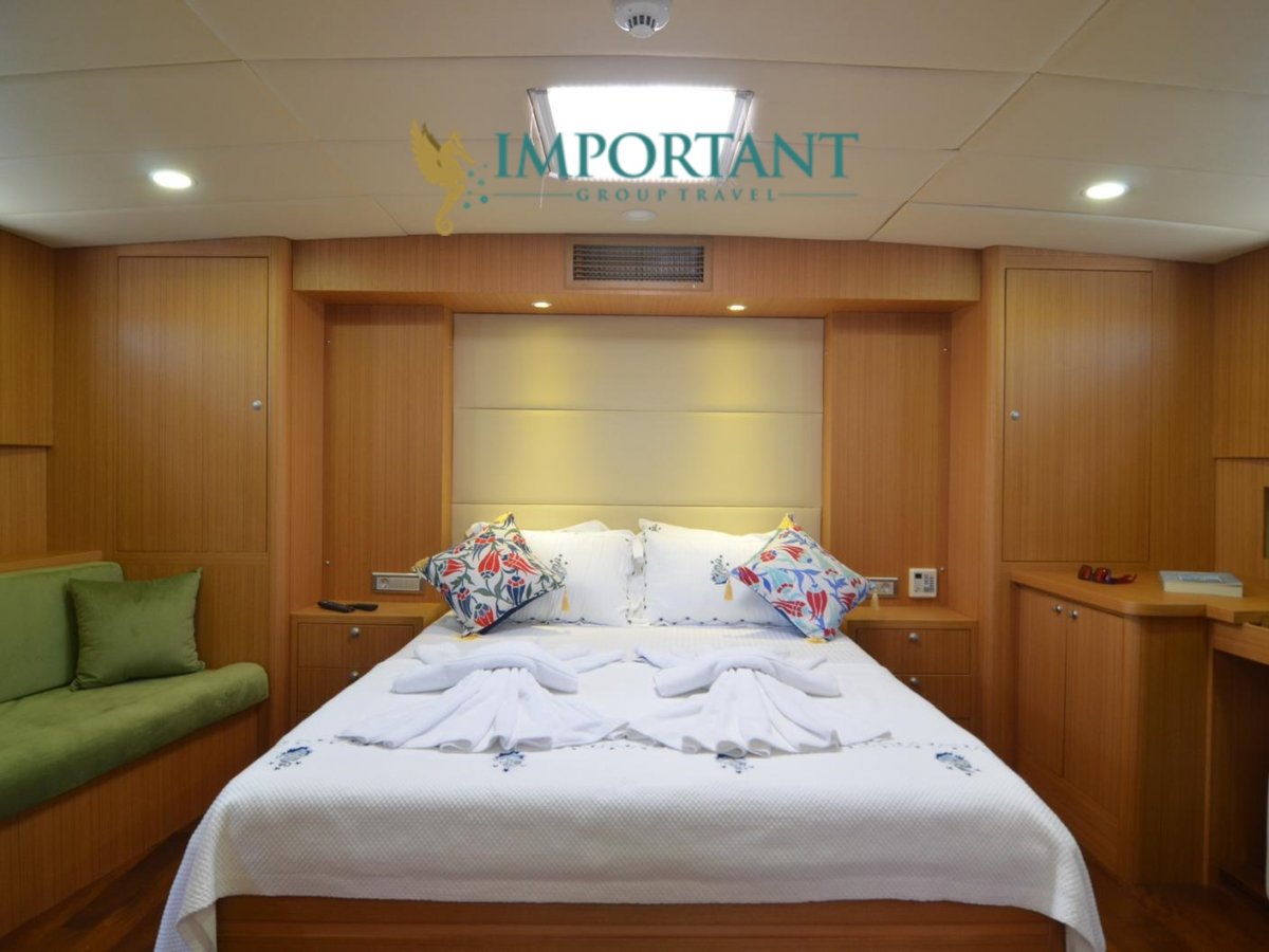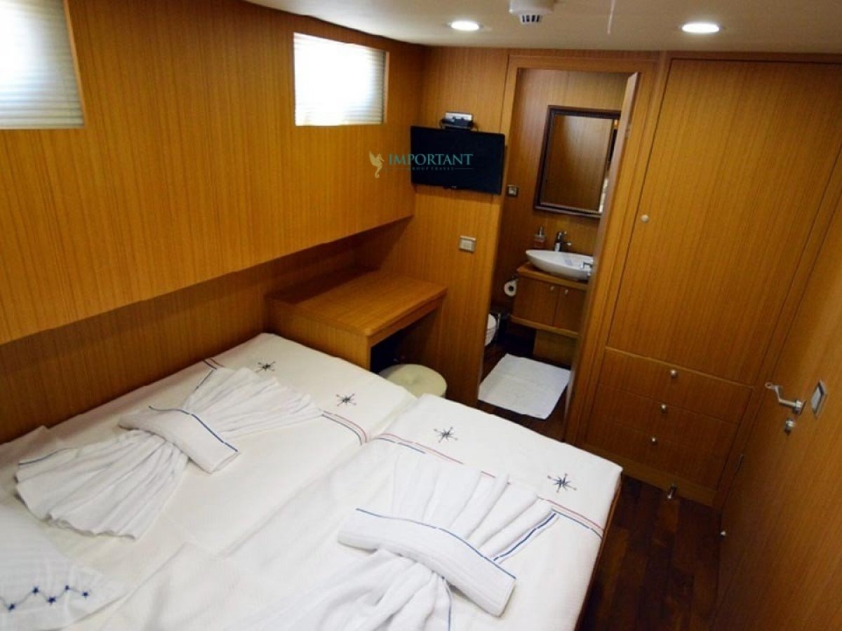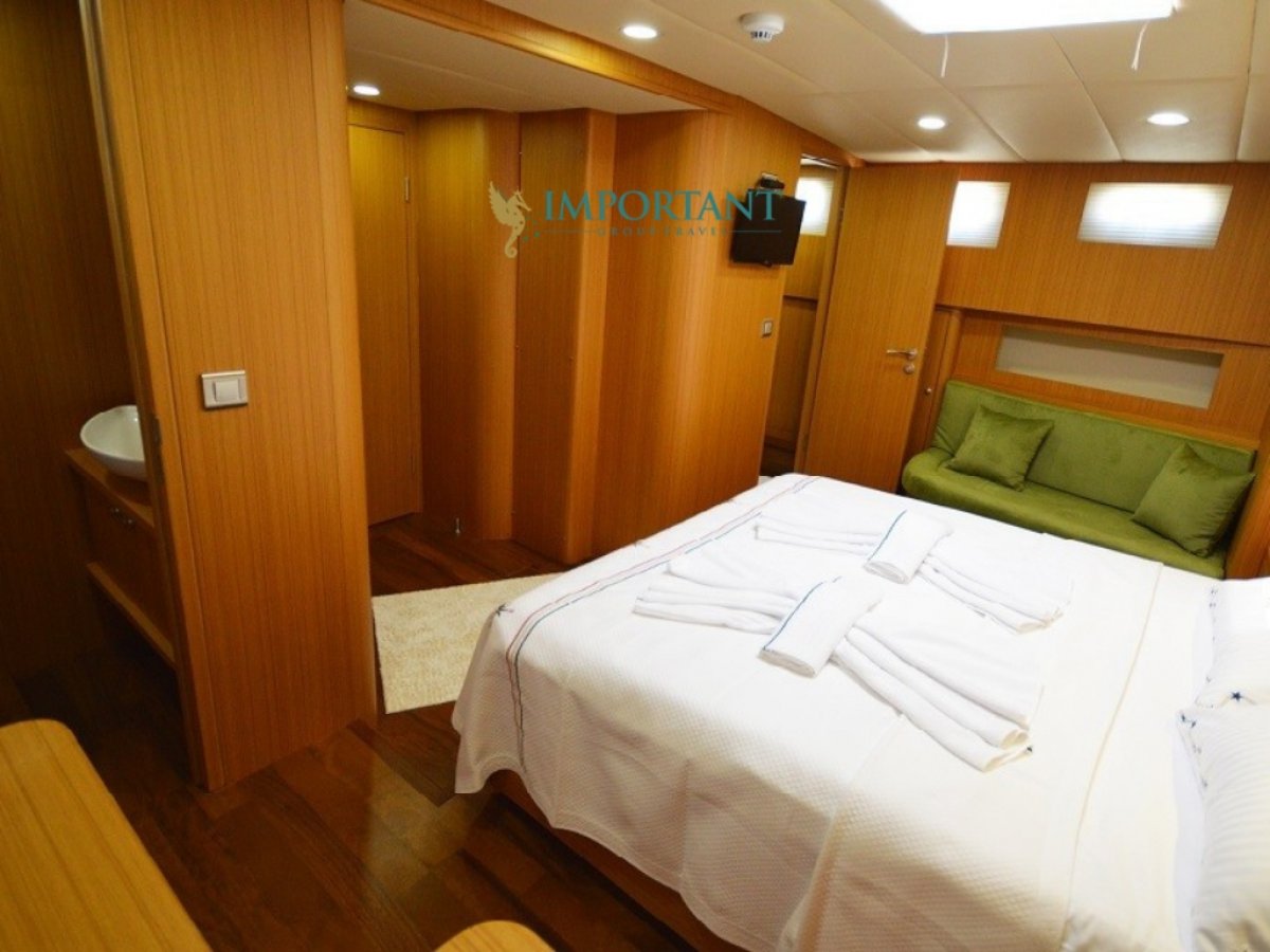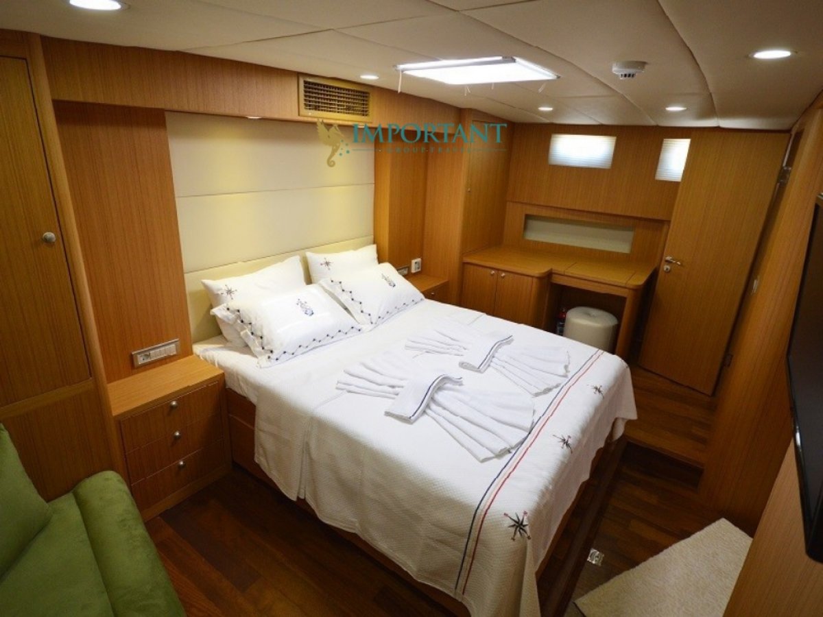 Bodrum çıkışlı 24 metre uzunluğundaki kiralık guletimiz, Ege Denizi’nin büyüleyici koylarını keşfetmeniz için harika bir fırsat sunuyor. Teknemiz, toplamda 8 kişilik konaklama kapasitesine sahip olup, 2 adet çift kişilik yataklı Master, 2 adet çift kişilik yataklı Double (Ayrılabilir yatak) kabin ile donatılmıştır.