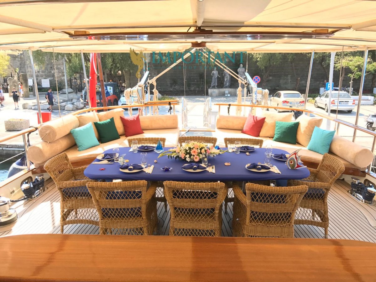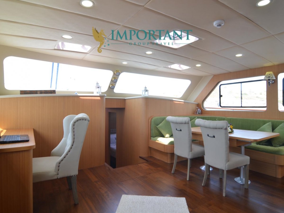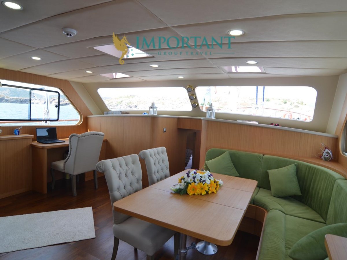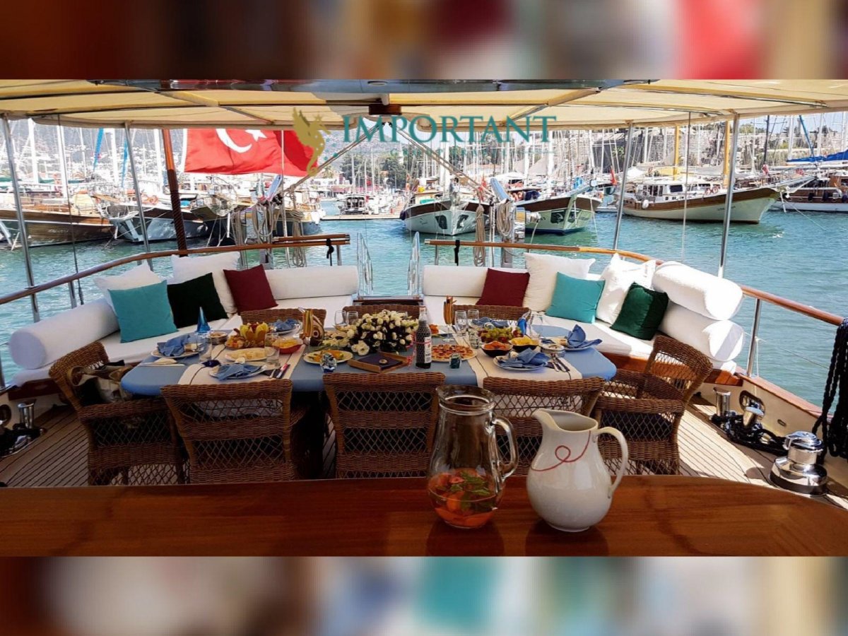 İç dizaynı, misafirlerimizin ihtiyaçlarını karşılamak üzere sade ve konforlu bir şekilde düzenlenmiştir. Geniş salonu ve güvertesinde yer alan yemek masaları ile sevdiklerinizle birlikte keyifli vakit geçirebileceğiniz alanlar sunmaktadır. Tam donanımlı mutfağımız, teknede geçirdiğiniz süre boyunca tüm gereksinimlerinizi karşılar. Her kabinde duş, wc ve klima bulunmaktadır. Bodrum çıkışlı bu guletimizle unutulmaz bir mavi yolculuğa çıkabilir, denizde de olsa evinizin rahatlığını hissedebilirsiniz.