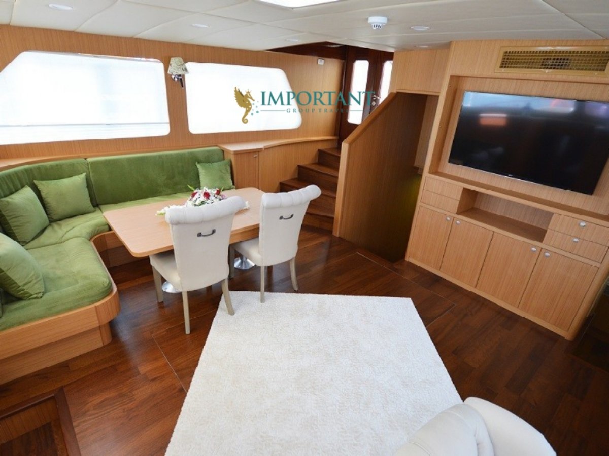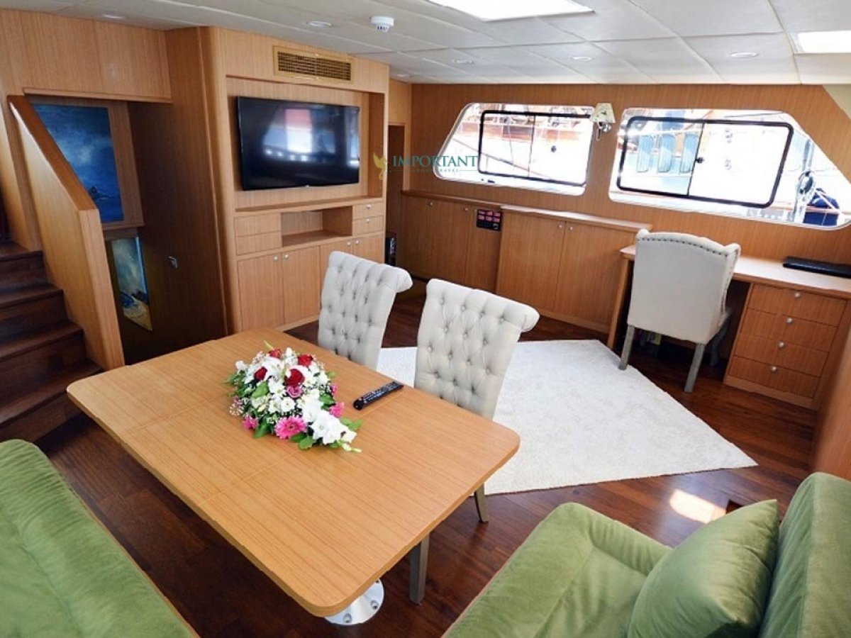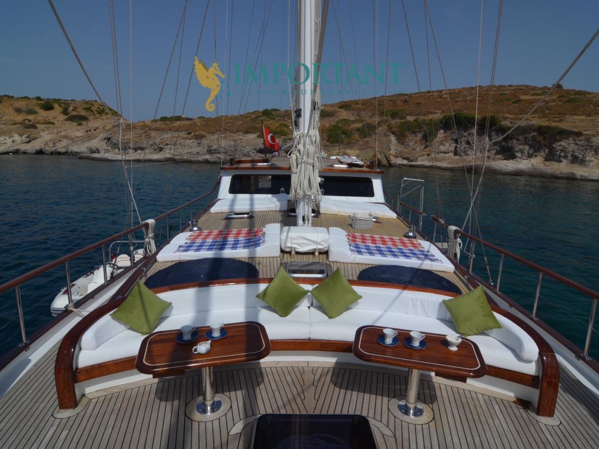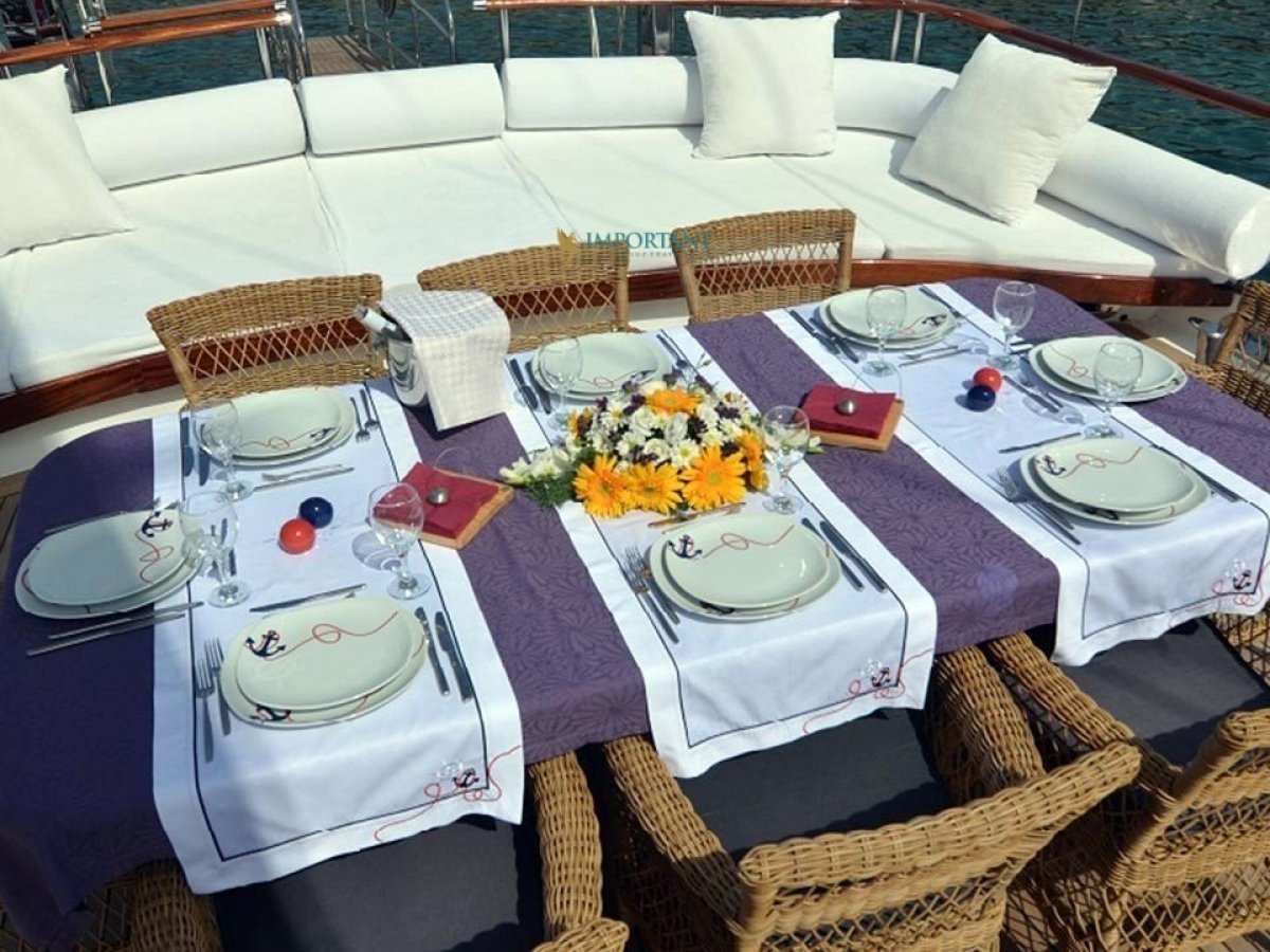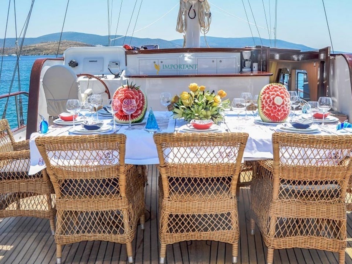 İç dizaynı, misafirlerimizin ihtiyaçlarını karşılamak üzere sade ve konforlu bir şekilde düzenlenmiştir. Geniş salonu ve güvertesinde yer alan yemek masaları ile sevdiklerinizle birlikte keyifli vakit geçirebileceğiniz alanlar sunmaktadır. Tam donanımlı mutfağımız, teknede geçirdiğiniz süre boyunca tüm gereksinimlerinizi karşılar. Her kabinde duş, wc ve klima bulunmaktadır. Bodrum çıkışlı bu guletimizle unutulmaz bir mavi yolculuğa çıkabilir, denizde de olsa evinizin rahatlığını hissedebilirsiniz.
