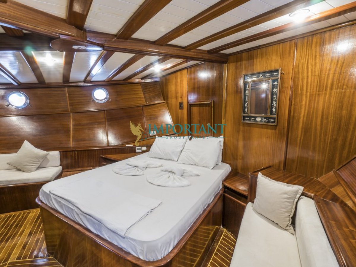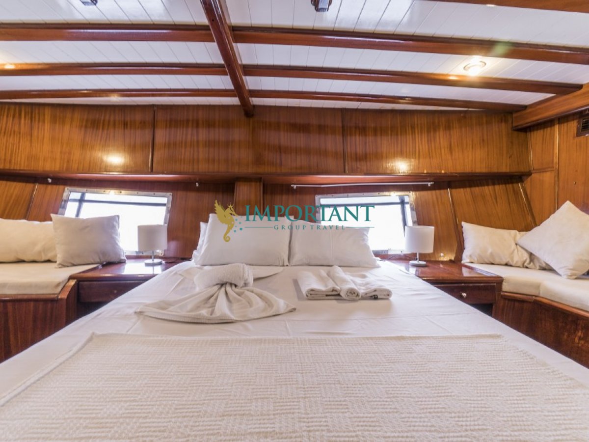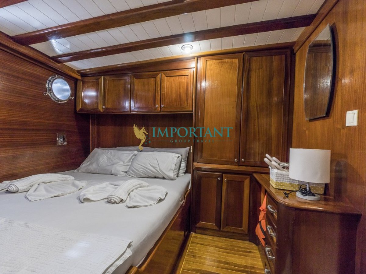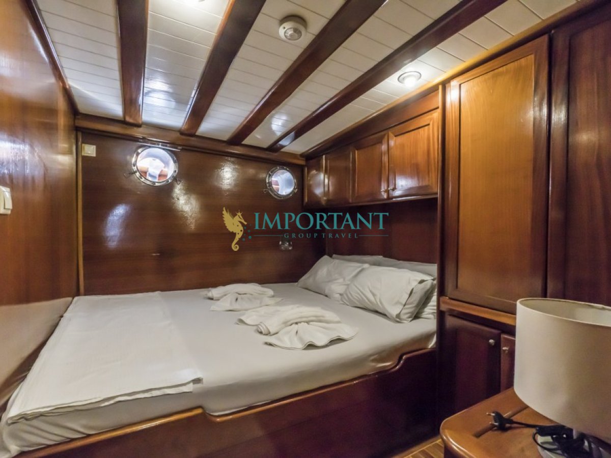 Bodrum çıkışlı 24 metre uzunluğundaki kiralık guletimiz, Ege Denizi’nin büyüleyici koylarını keşfetmeniz için harika bir fırsat sunuyor. Teknemiz, toplamda 8 kişilik konaklama kapasitesine sahip olup, 2 adet çift kişilik yataklı Master ve 2 adet twin kabin ile donatılmıştır.
