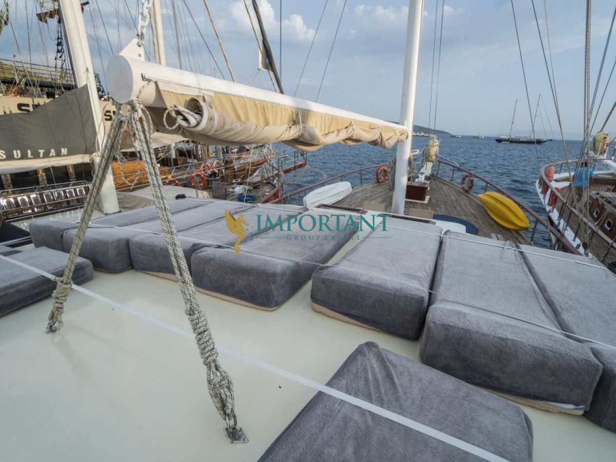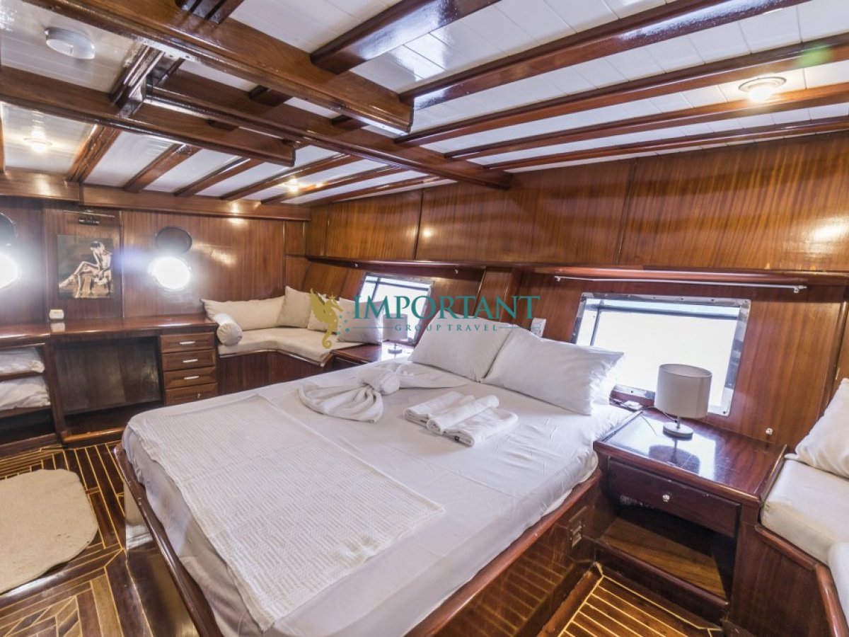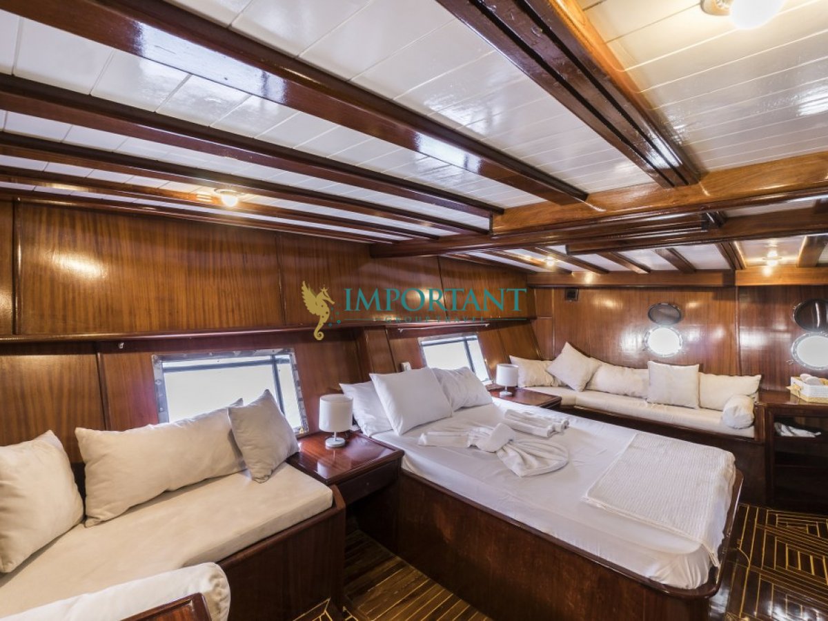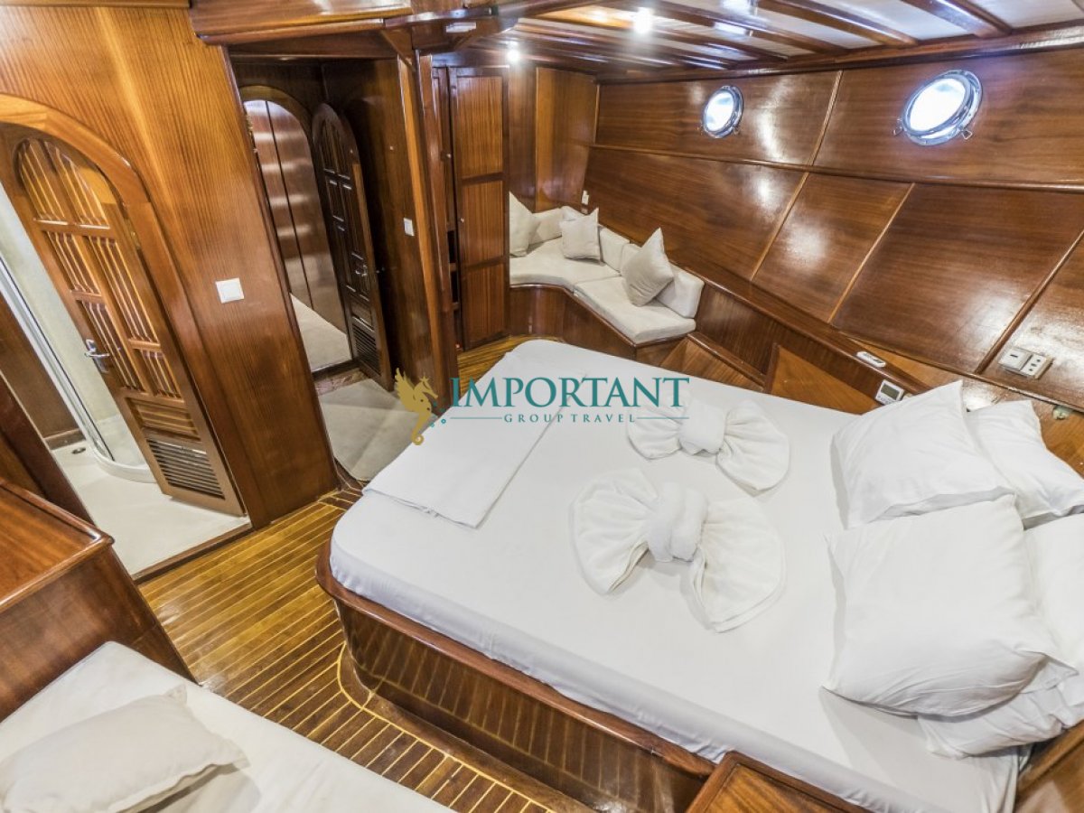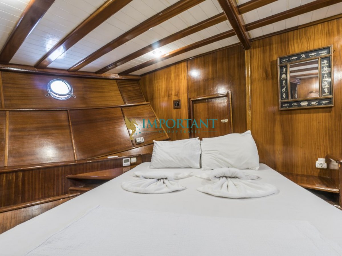 Bodrum çıkışlı 24 metre uzunluğundaki kiralık guletimiz, Ege Denizi’nin büyüleyici koylarını keşfetmeniz için harika bir fırsat sunuyor. Teknemiz, toplamda 8 kişilik konaklama kapasitesine sahip olup, 2 adet çift kişilik yataklı Master ve 2 adet twin kabin ile donatılmıştır.