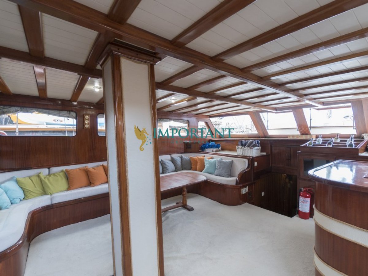 İç dizaynı, misafirlerimizin ihtiyaçlarını karşılamak üzere sade ve konforlu bir şekilde düzenlenmiştir. Geniş salonu ve güvertesinde yer alan yemek masaları ile sevdiklerinizle birlikte keyifli vakit geçirebileceğiniz alanlar sunmaktadır. Tam donanımlı mutfağımız, teknede geçirdiğiniz süre boyunca tüm gereksinimlerinizi karşılar. Her kabinde duş, wc ve klima (8 saat kullanım) bulunmaktadır. Bodrum çıkışlı bu guletimizle unutulmaz bir mavi yolculuğa çıkabilir, denizde de olsa evinizin rahatlığını hissedebilirsiniz.