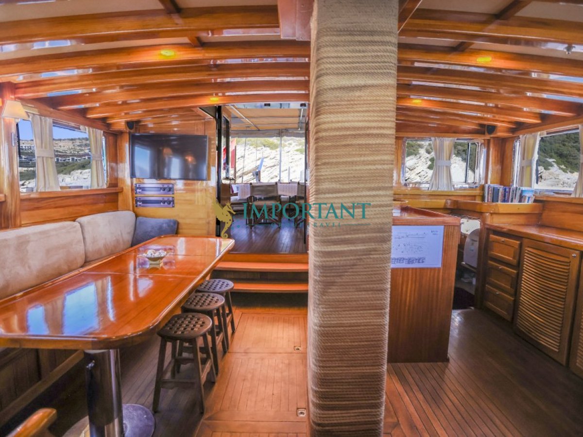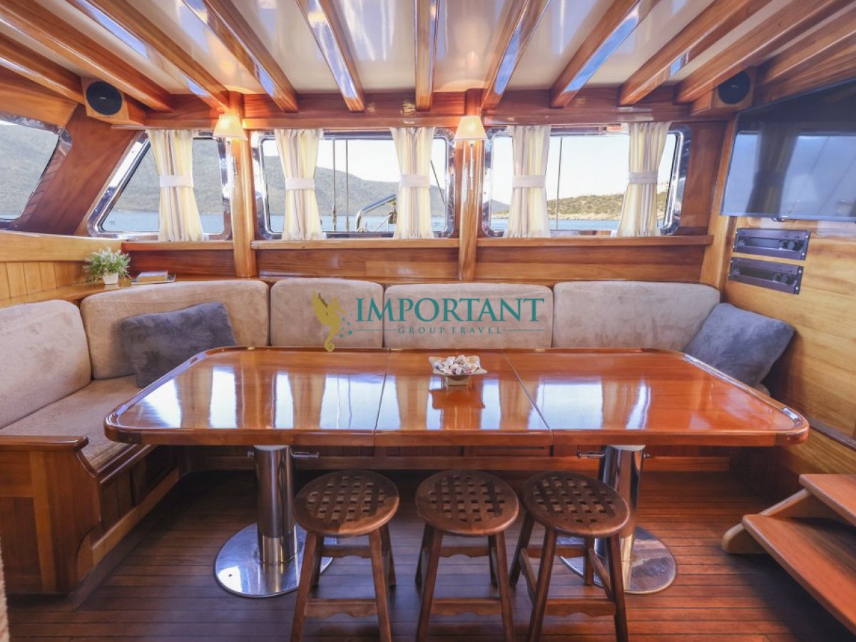 İç dizaynı, misafirlerimizin ihtiyaçlarını karşılamak üzere sade ve konforlu bir şekilde düzenlenmiştir. Geniş salonu ve güvertesinde yer alan yemek masaları ile sevdiklerinizle birlikte keyifli vakit geçirebileceğiniz alanlar sunmaktadır. Tam donanımlı mutfağımız, teknede geçirdiğiniz süre boyunca tüm gereksinimlerinizi karşılar. Her kabinde duş, wc ve klima bulunmaktadır. Bodrum çıkışlı bu guletimizle unutulmaz bir mavi yolculuğa çıkabilir, denizde de olsa evinizin rahatlığını hissedebilirsiniz.