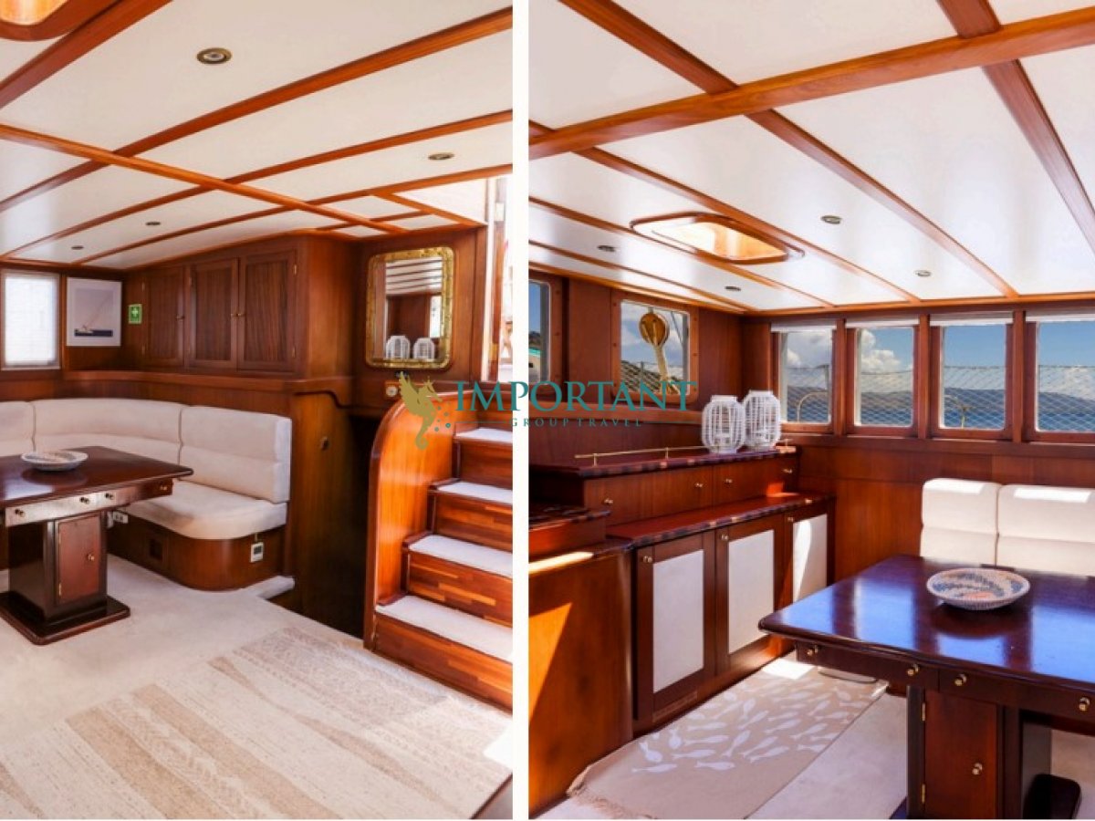 İç dizaynı, misafirlerimizin ihtiyaçlarını karşılamak üzere sade ve konforlu bir şekilde düzenlenmiştir. Geniş salonu ve güvertesinde yer alan yemek masaları ile sevdiklerinizle birlikte keyifli vakit geçirebileceğiniz alanlar sunmaktadır. Tam donanımlı mutfağımız, teknede geçirdiğiniz süre boyunca tüm gereksinimlerinizi karşılar. Her kabinde duş, wc, tv ve klima bulunmaktadır. Bodrum çıkışlı bu guletimizle unutulmaz bir mavi yolculuğa çıkabilir, denizde de olsa evinizin rahatlığını hissedebilirsiniz.