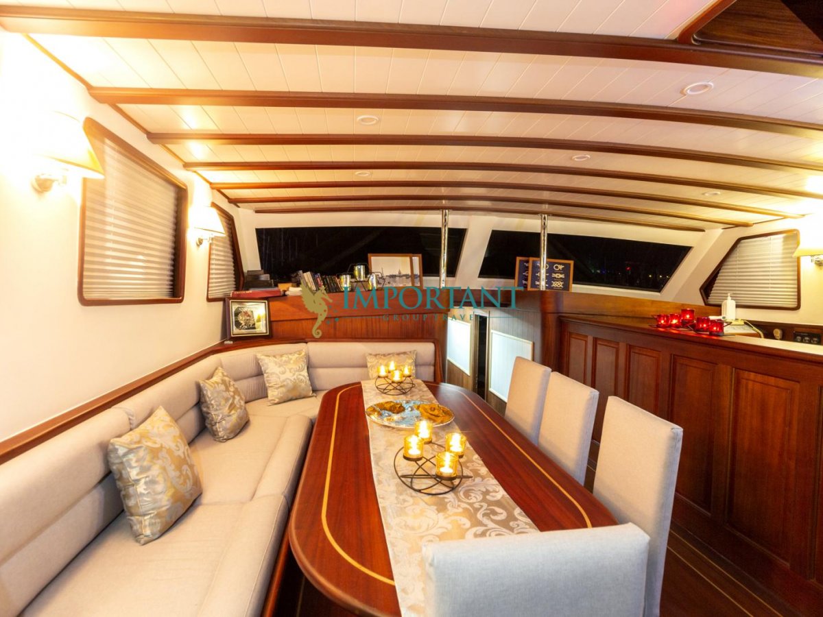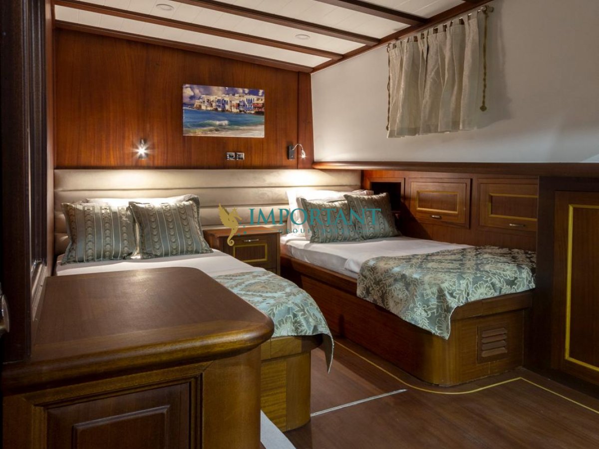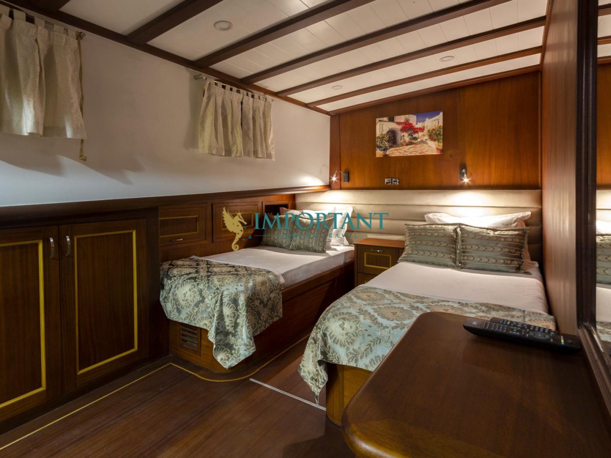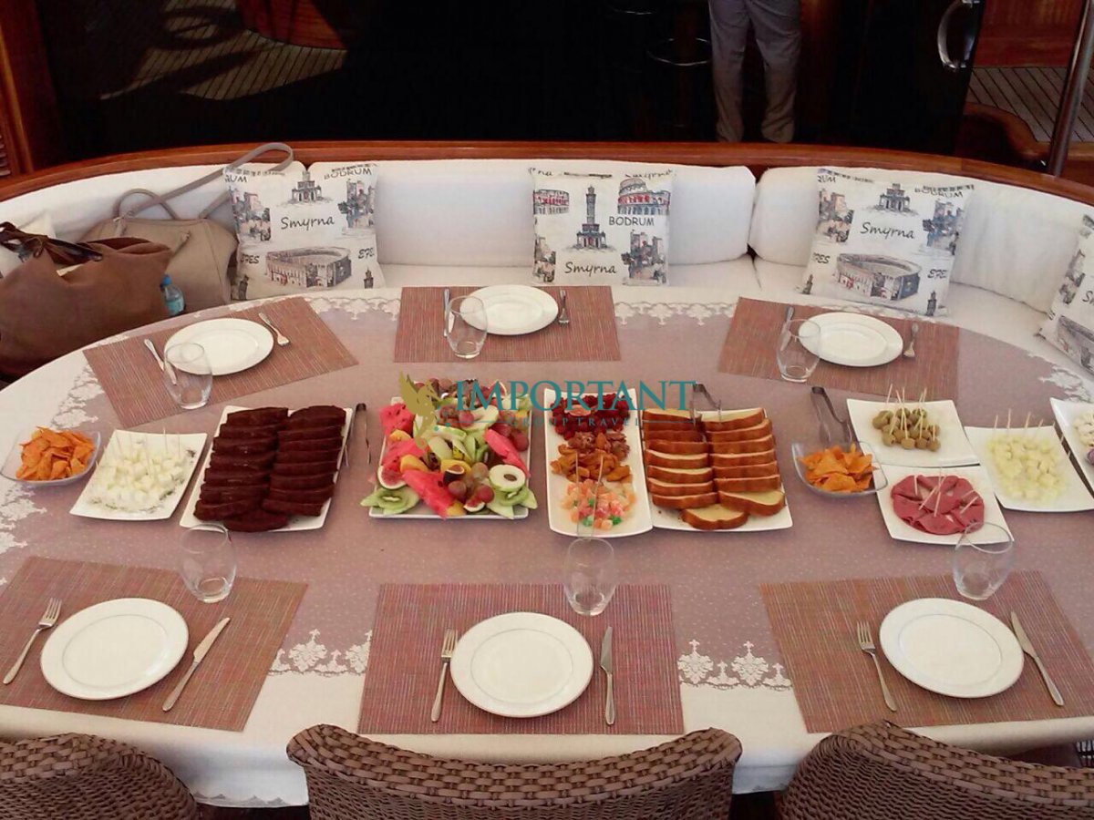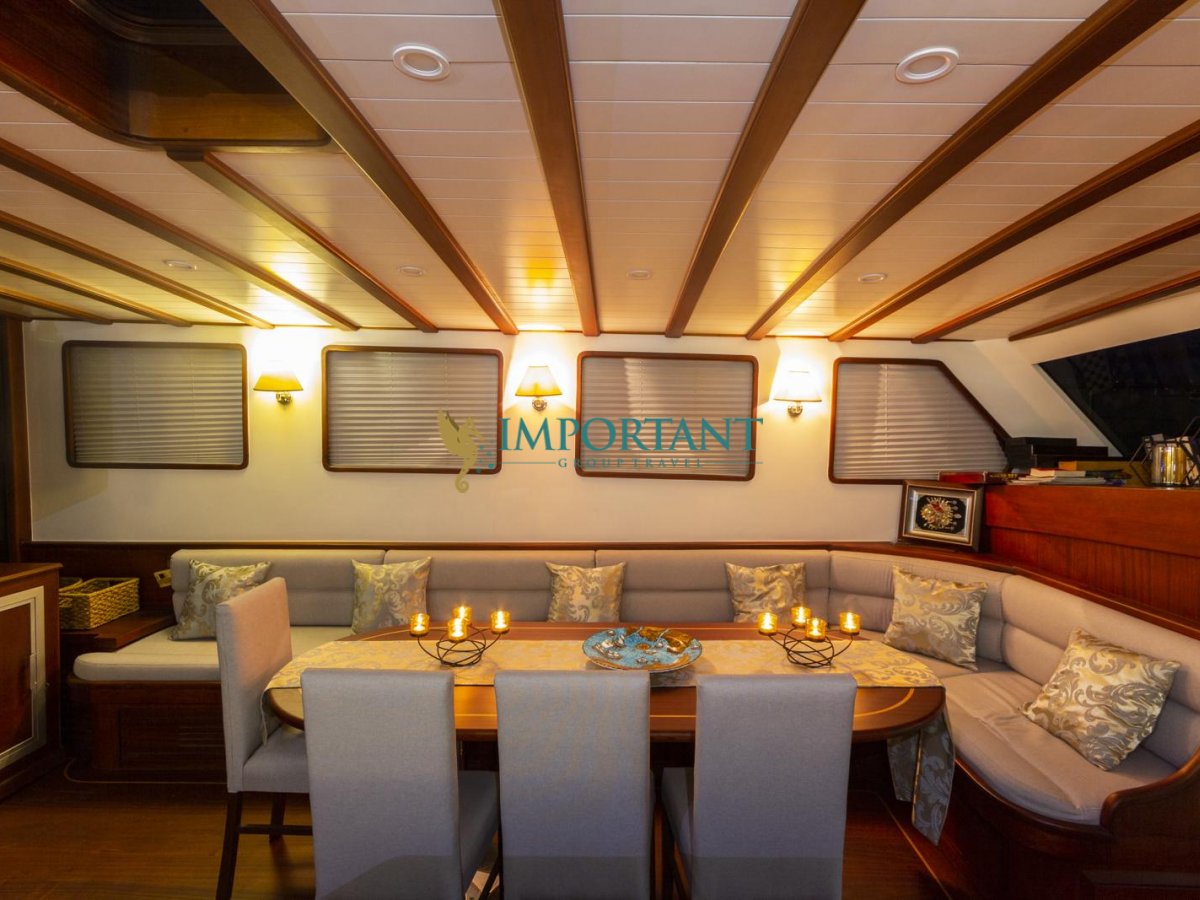 İç dizaynı, misafirlerimizin ihtiyaçlarını karşılamak üzere özenle dekore edilmiştir. Geniş salonunda ve güvertesinde yer alan yemek masaları, sevdiklerinizle birlikte keyifli yemekler yiyebileceğiniz alanlar sunmaktadır. Tam donanımlı mutfağı, teknede geçirdiğiniz süre boyunca tüm gereksinimlerinizi karşılar. Her kabinde duş, wc ve klima bulunmaktadır; böylece denizde bile evinizin rahatlığını hissedebilirsiniz.