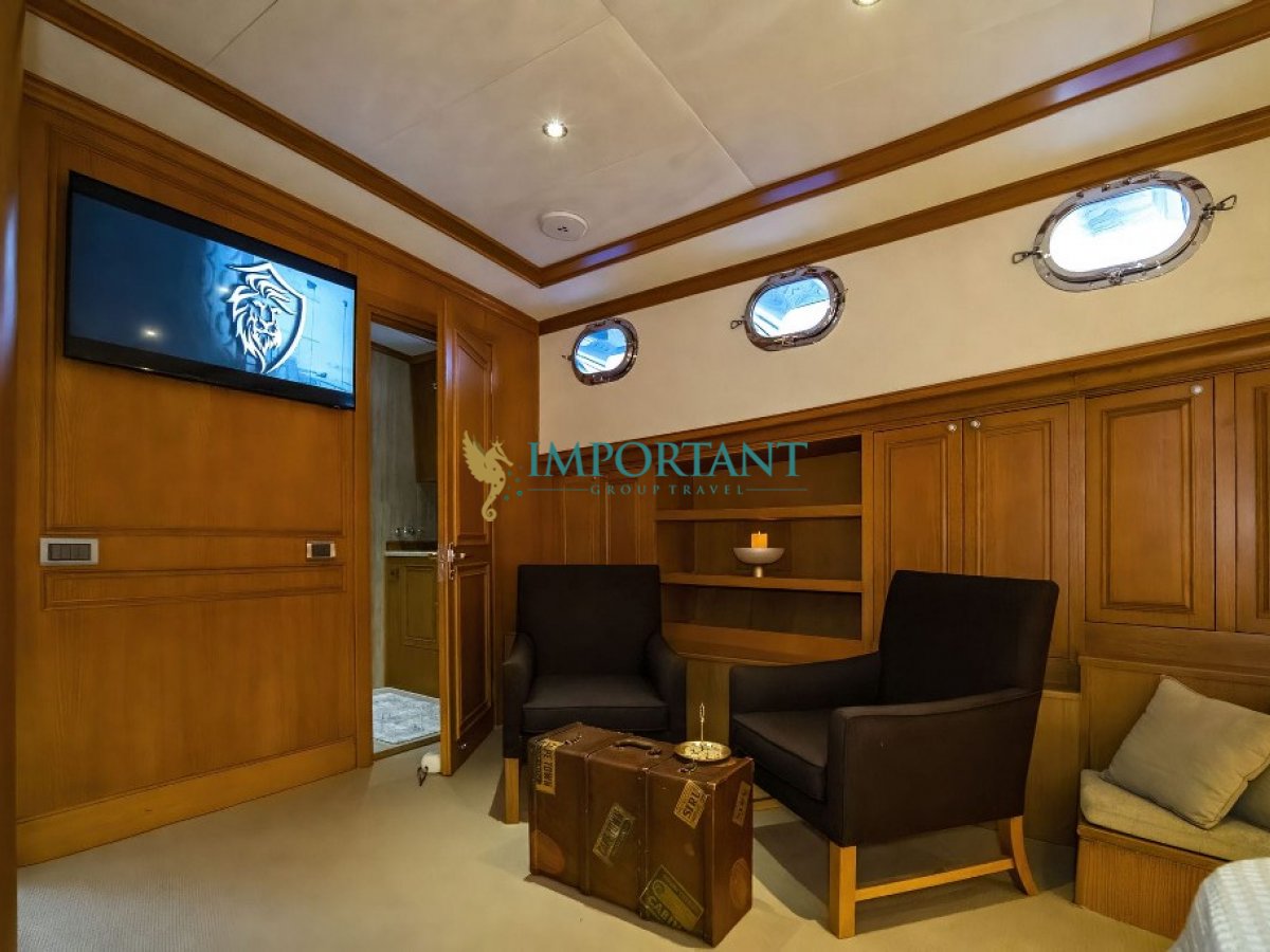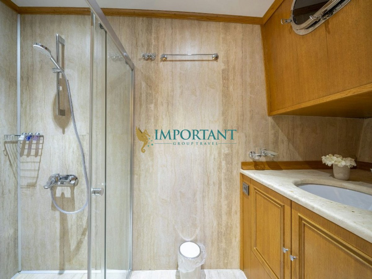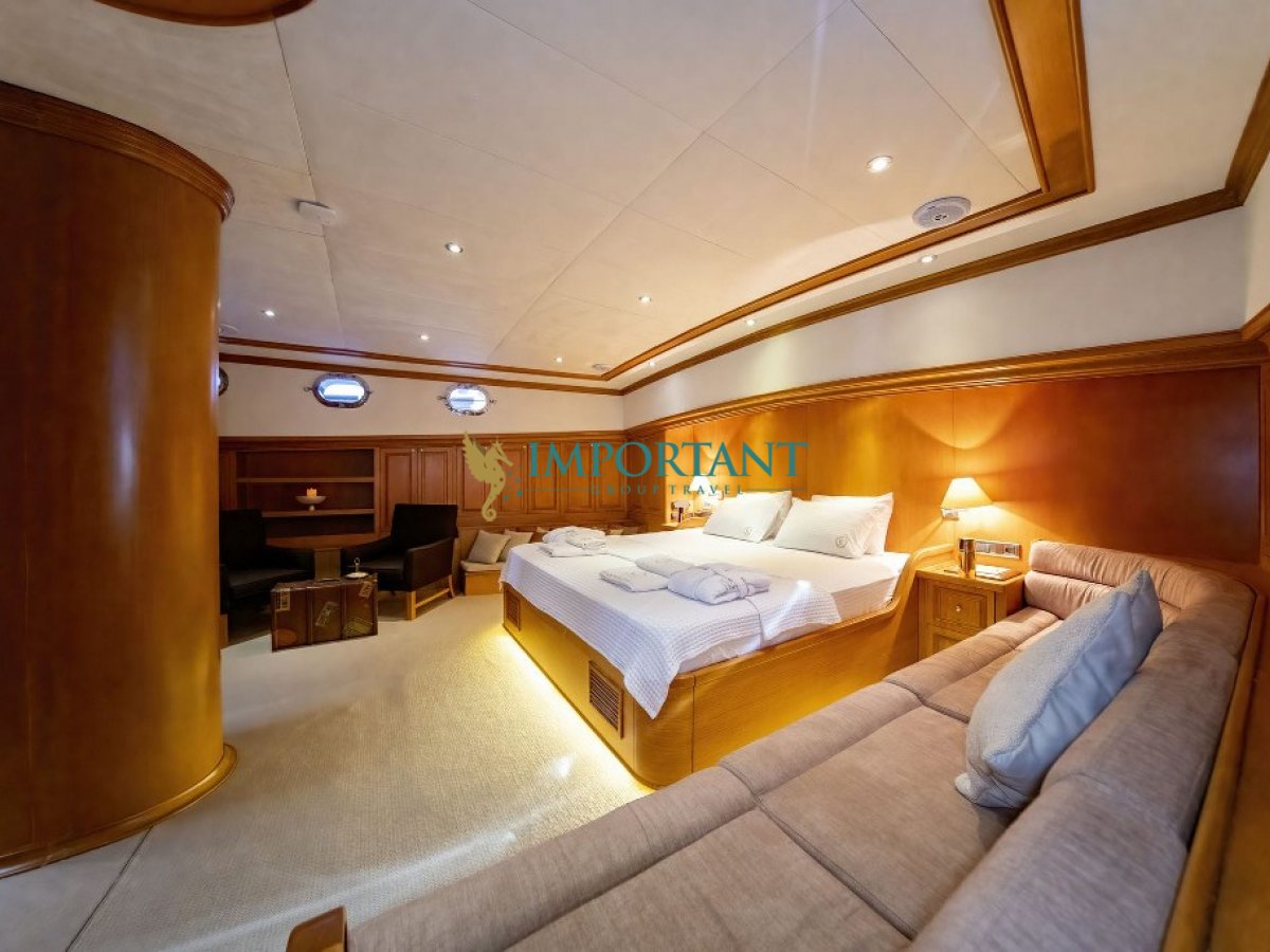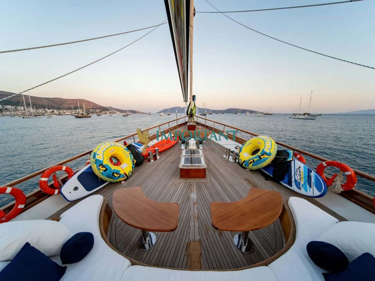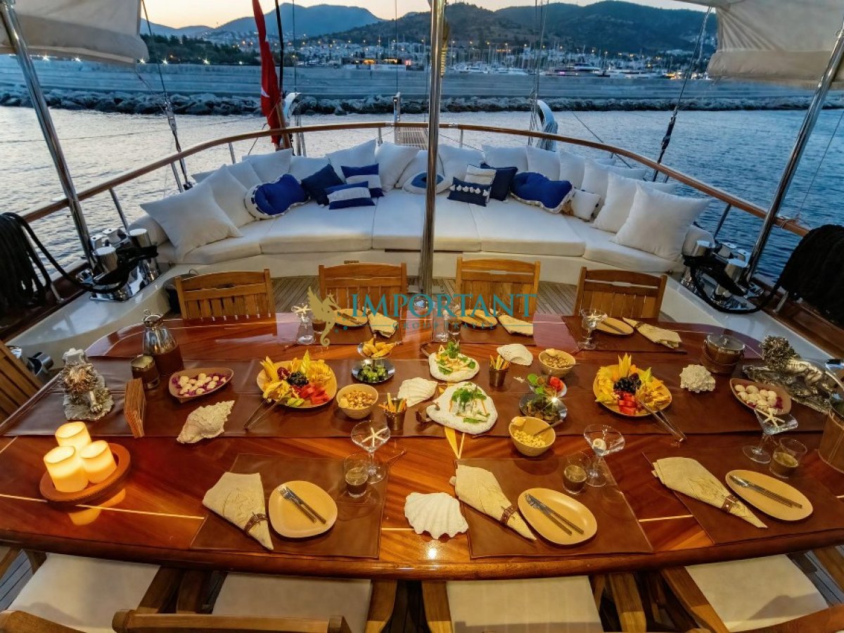 Yatımızın iç dizaynı siz değerli misafirlerimizin tüm ihtiyacını karşılayacak şekilde dekore edilmiş olup, salonda ve güvertede yemek masalarına ve tam teşekküllü bir mutfağa sahiptir. Her kabinde duş, wc ve klima bulunmaktadır. Bodrum çıkışlı mavi tur için Lüks Yat kiralamak isteyen kalabalık gruplar için son derece ideal bir gulettir.