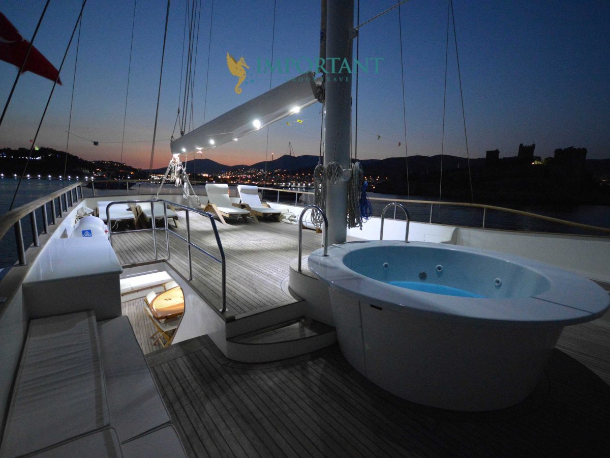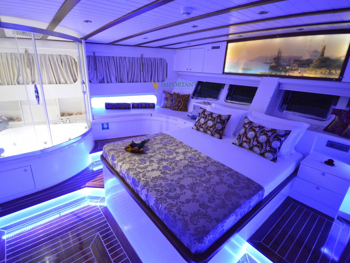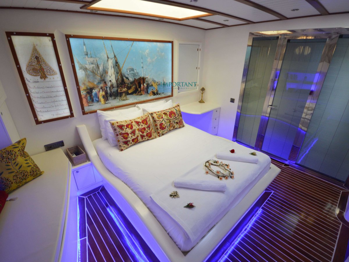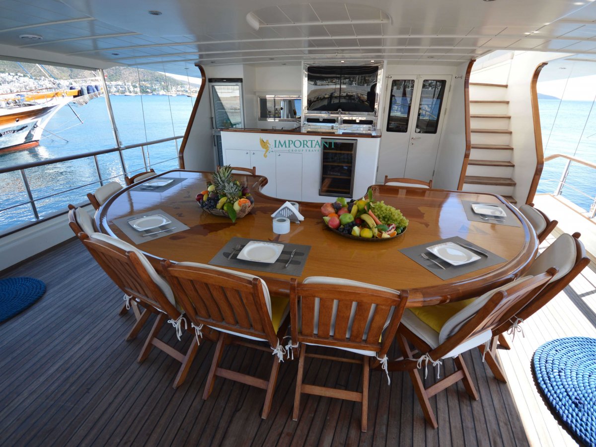 Yatımızın iç dizaynı siz değerli misafirlerimizin tüm ihtiyacını karşılayacak şekilde dekore edilmiş olup, salonda ve güvertede yemek masalarına ve tam teşekküllü bir mutfağa sahiptir. Her kabinde duş, wc ve klima bulunmaktadır. Bodrum çıkışlı mavi tur için Lüks Yat kiralamak isteyen kalabalık gruplar için son derece ideal bir gulettir.