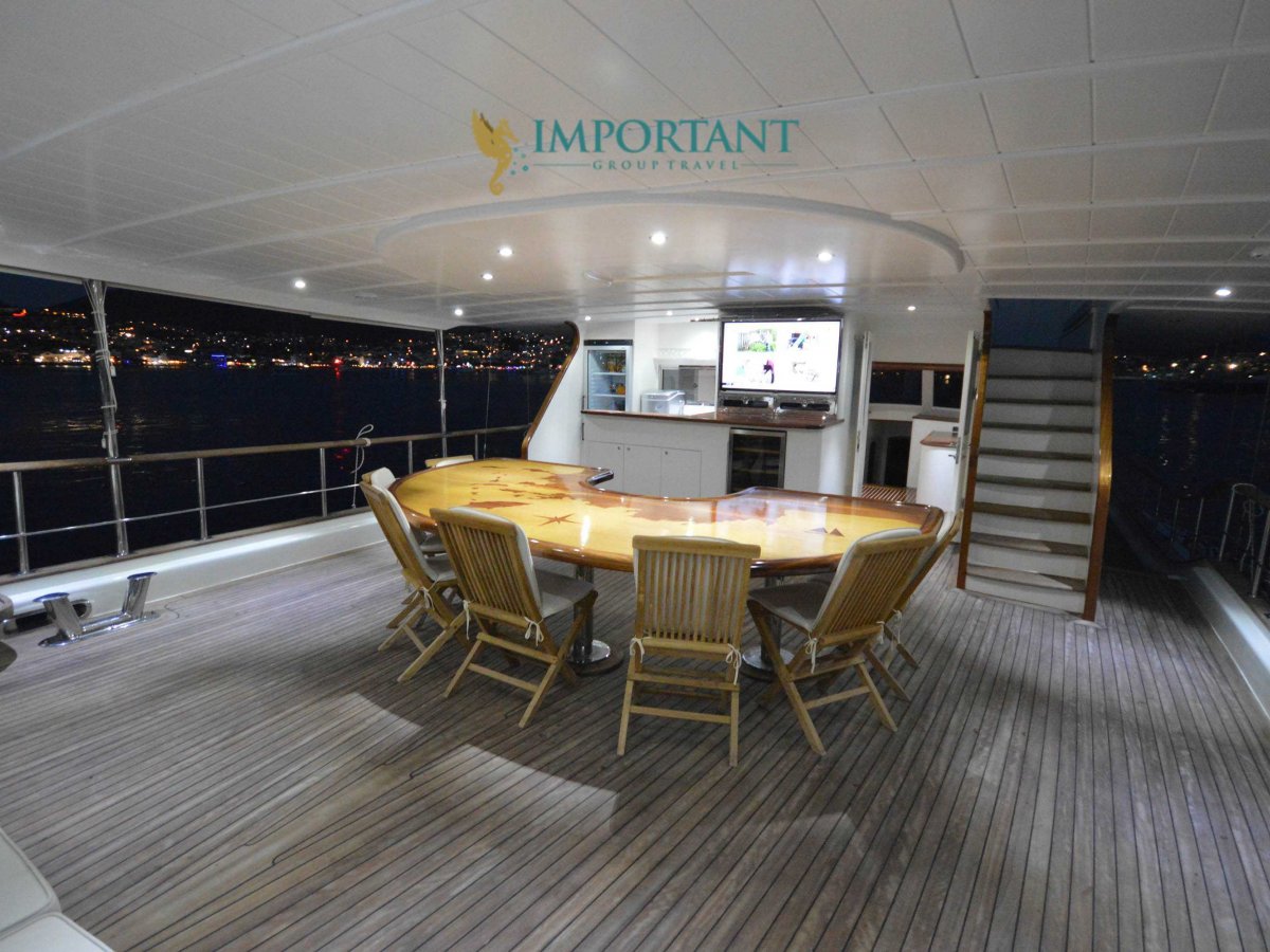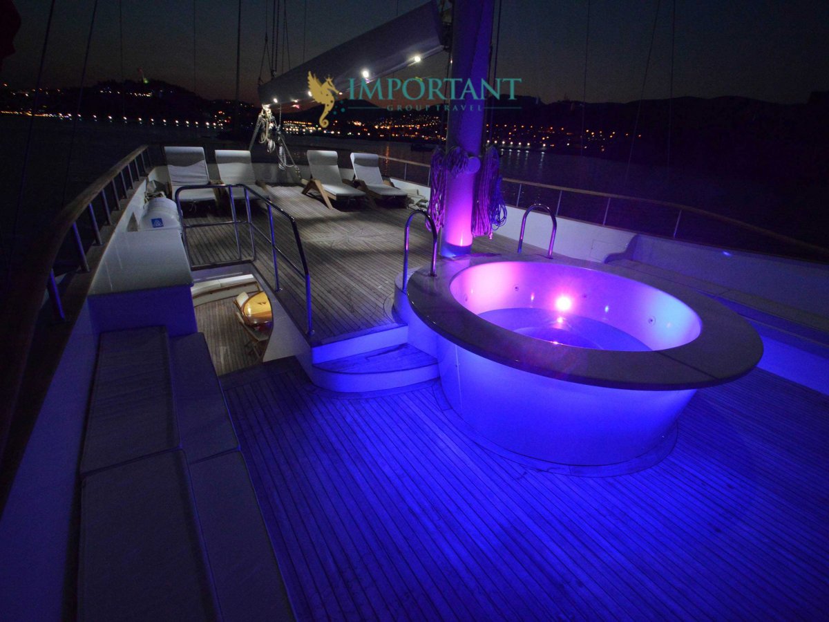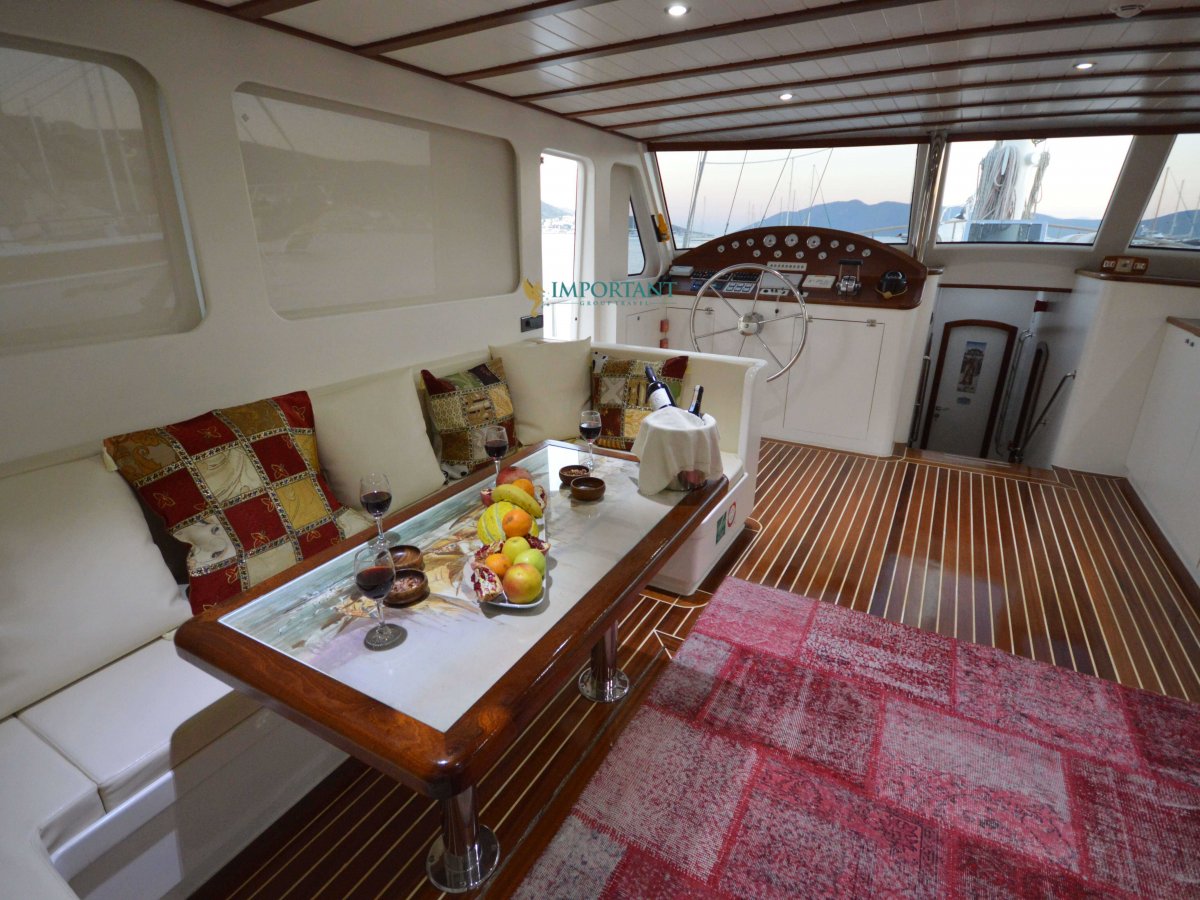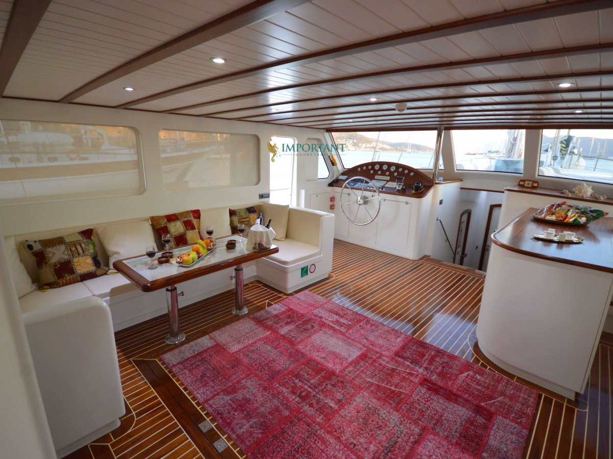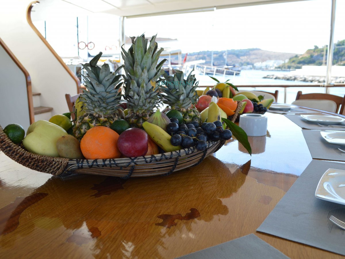 Yatımızın iç dizaynı siz değerli misafirlerimizin tüm ihtiyacını karşılayacak şekilde dekore edilmiş olup, salonda ve güvertede yemek masalarına ve tam teşekküllü bir mutfağa sahiptir. Her kabinde duş, wc ve klima bulunmaktadır. Bodrum çıkışlı mavi tur için Lüks Yat kiralamak isteyen kalabalık gruplar için son derece ideal bir gulettir.