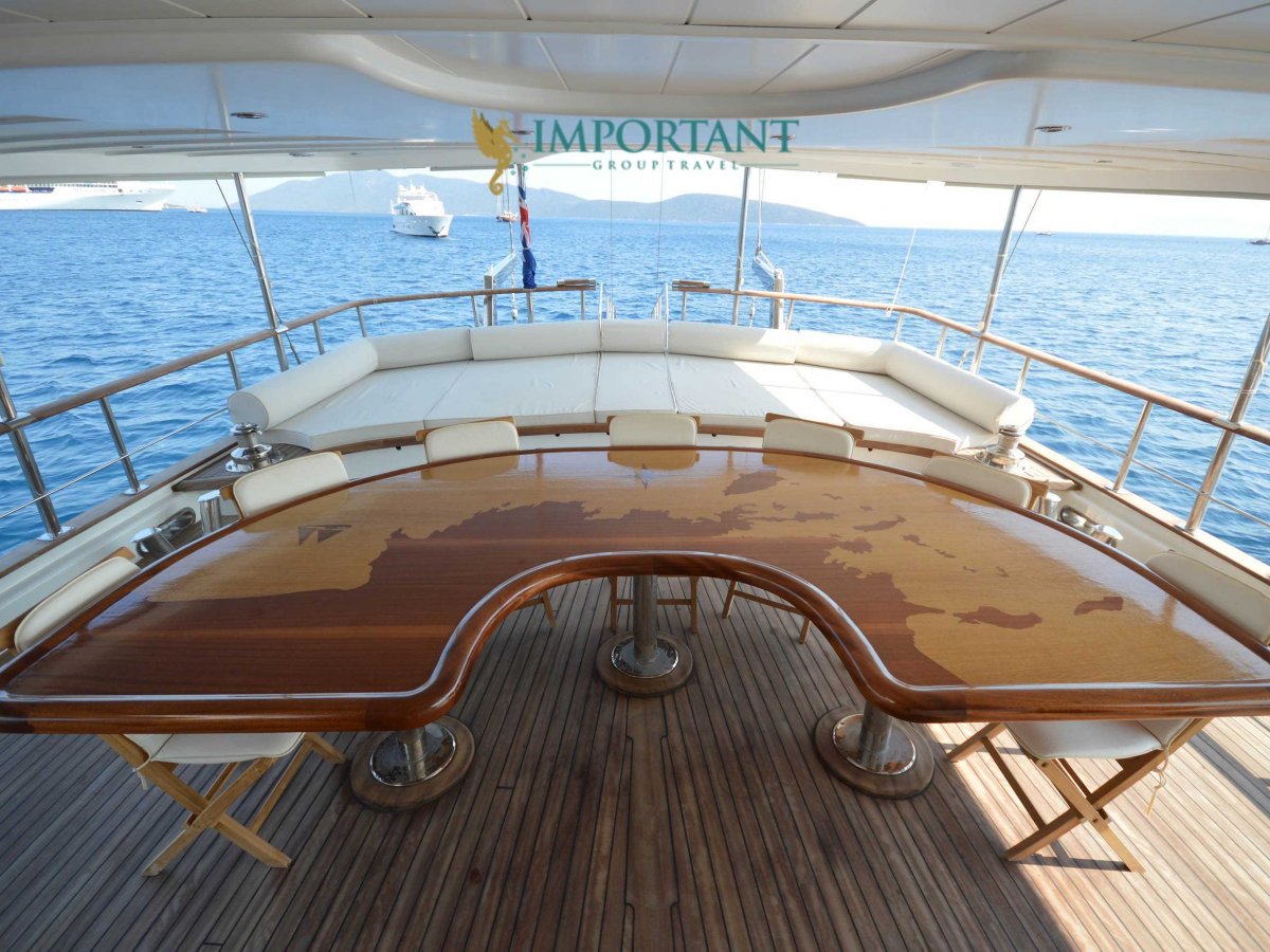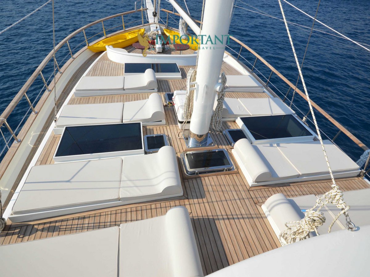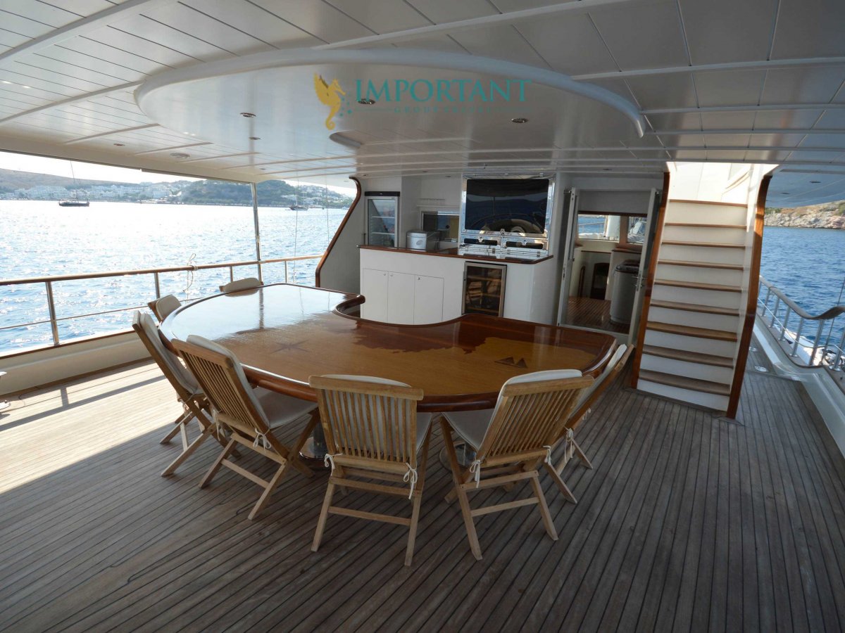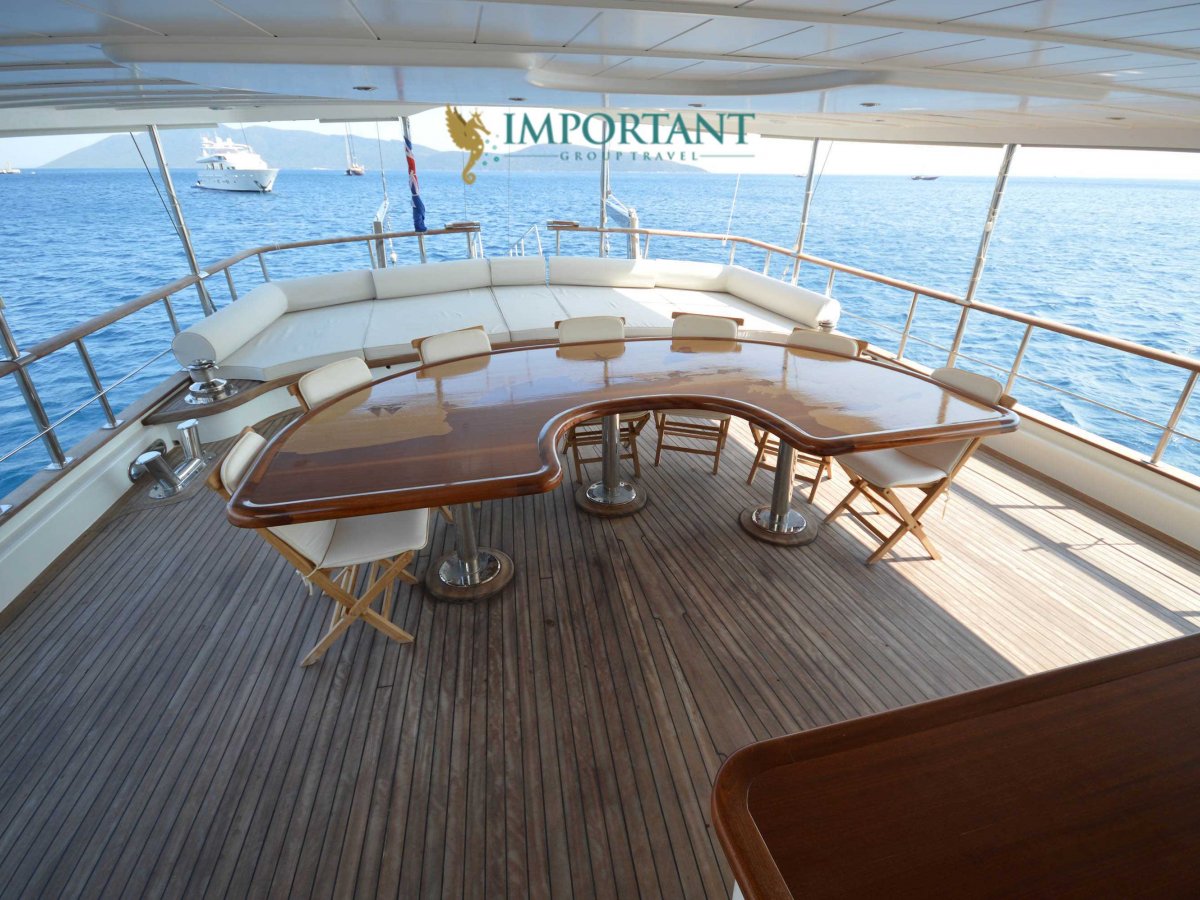 Yatımızın iç dizaynı siz değerli misafirlerimizin tüm ihtiyacını karşılayacak şekilde dekore edilmiş olup, salonda ve güvertede yemek masalarına ve tam teşekküllü bir mutfağa sahiptir. Her kabinde duş, wc ve klima bulunmaktadır. Bodrum çıkışlı mavi tur için Lüks Yat kiralamak isteyen kalabalık gruplar için son derece ideal bir gulettir.