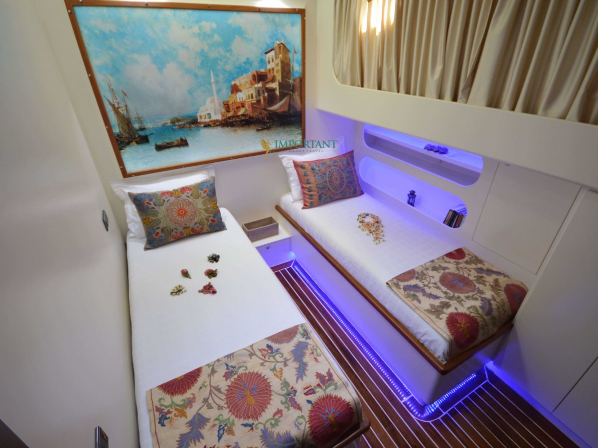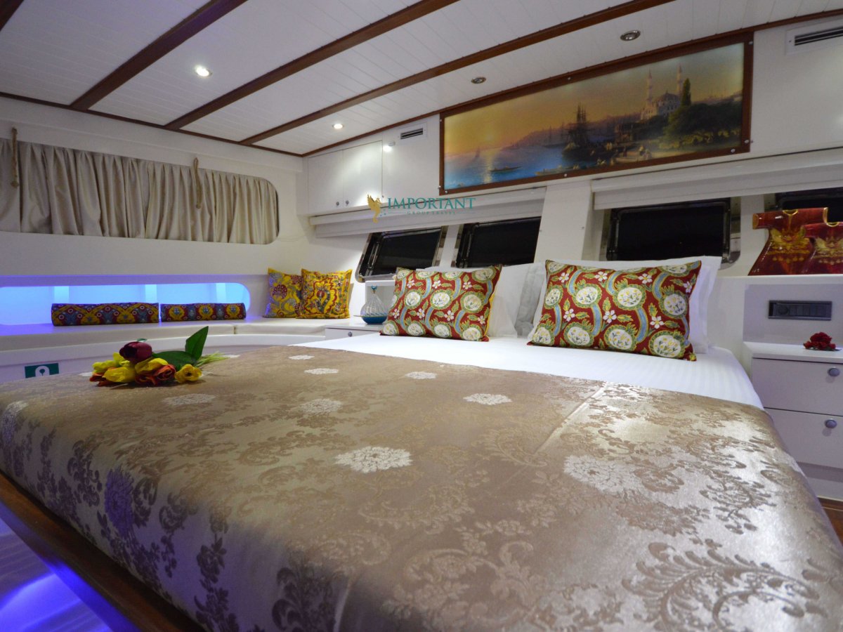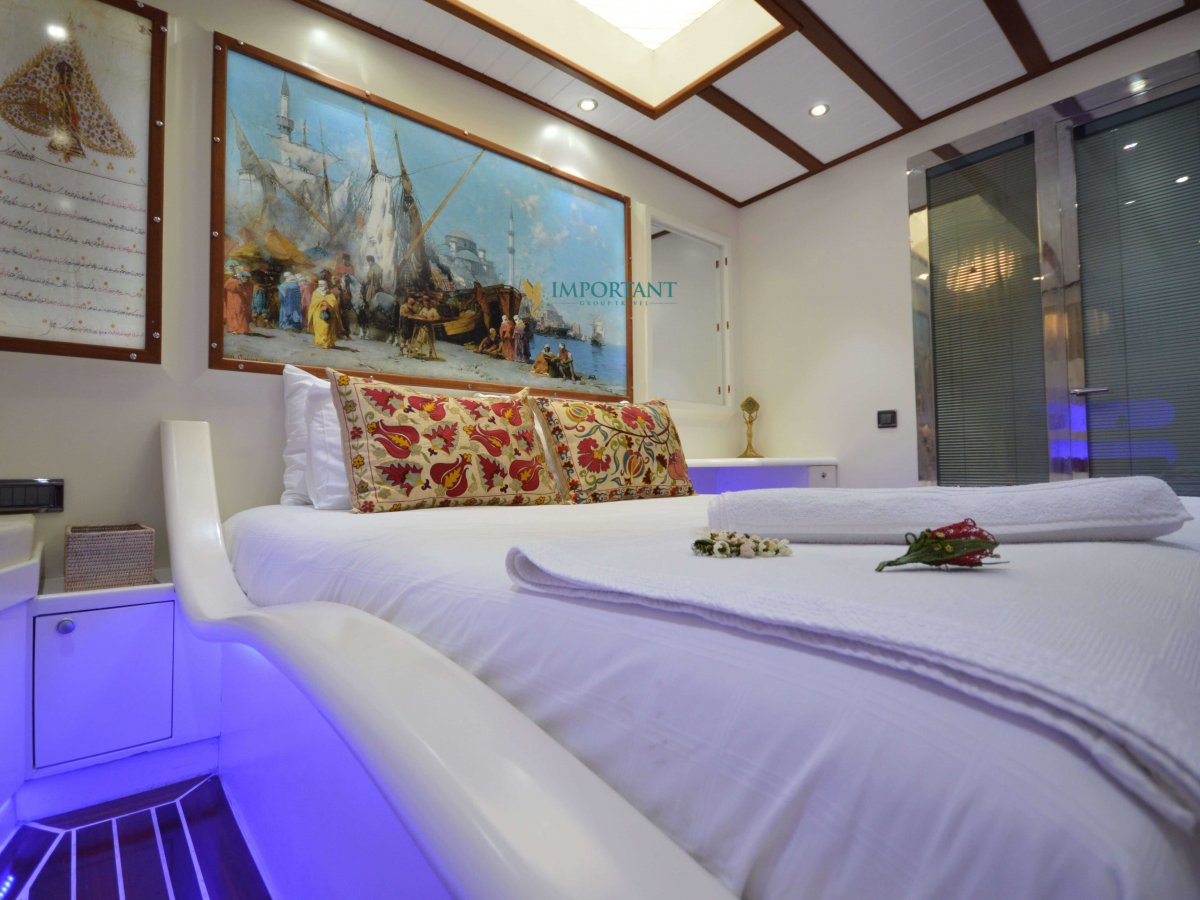 30 mt. uzunluğunda ve Bodrum merkez kalkışlı olan bu Delüks Kiralık Teknemiz 2 adet Master ve 4 adet Twin kabiniyle toplam 12 kişilik konaklama imkanı sunmaktadır.