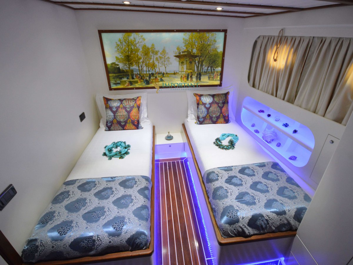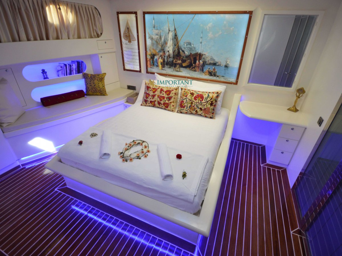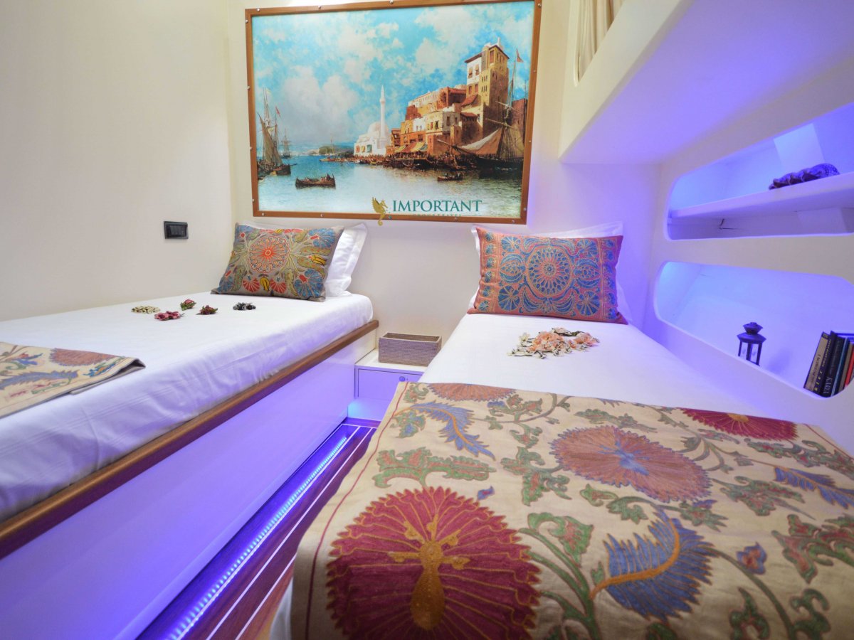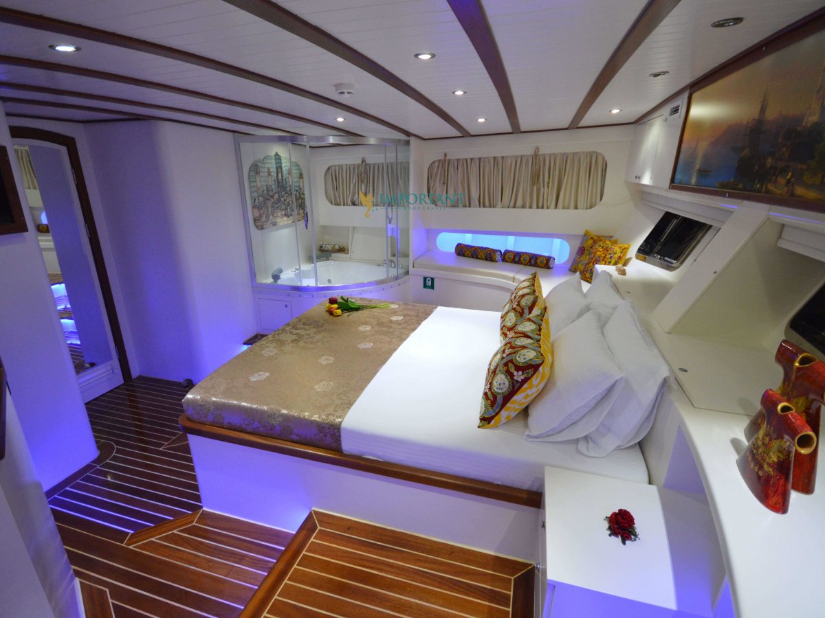 30 mt. uzunluğunda ve Bodrum merkez kalkışlı olan bu Delüks Kiralık Teknemiz 2 adet Master ve 4 adet Twin kabiniyle toplam 12 kişilik konaklama imkanı sunmaktadır.