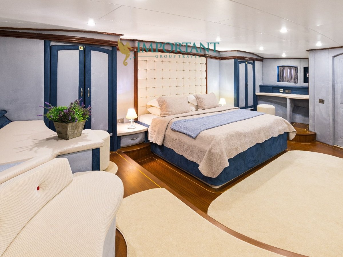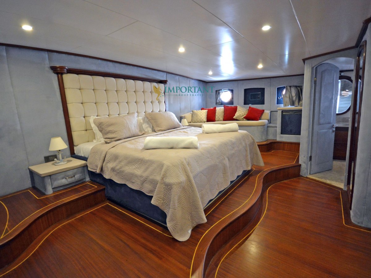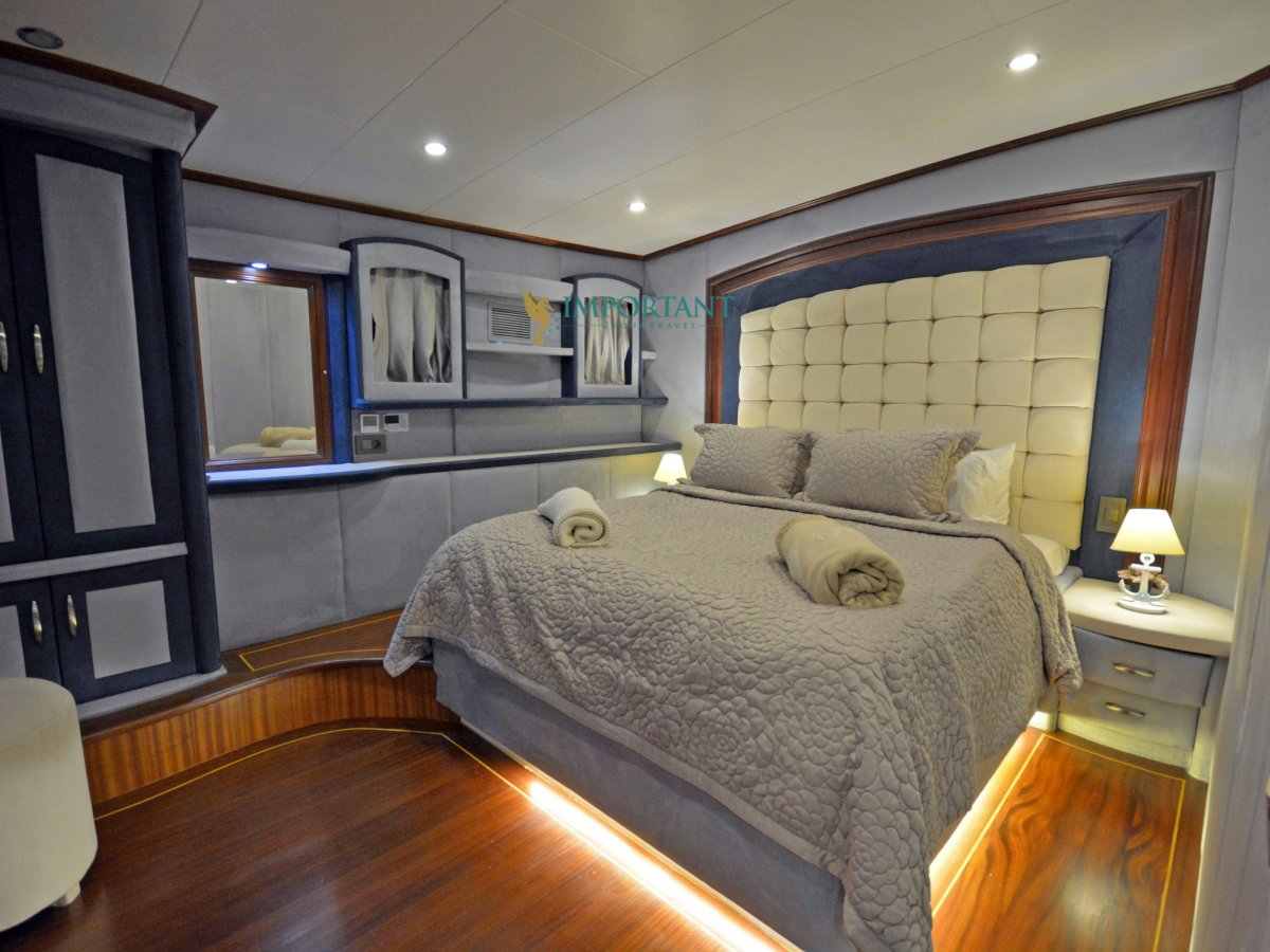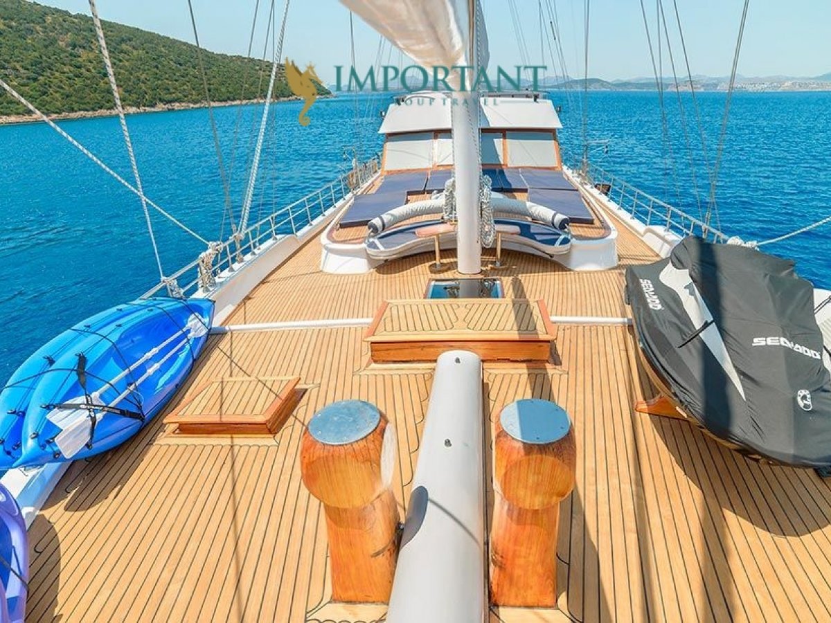 38 mt. uzunluğunda ve Bodrum merkez kalkışlı olan bu Delüks Kiralık Teknemiz 2 adet Master ve 4 adet Double kabiniyle toplam 12 kişilik konaklama imkanı sunmaktadır.