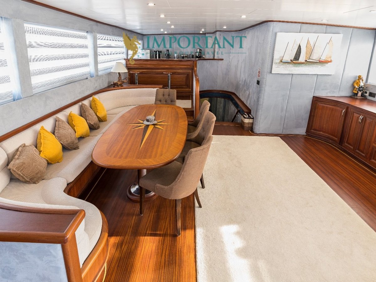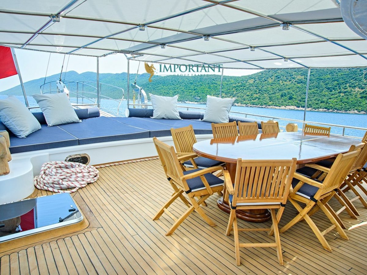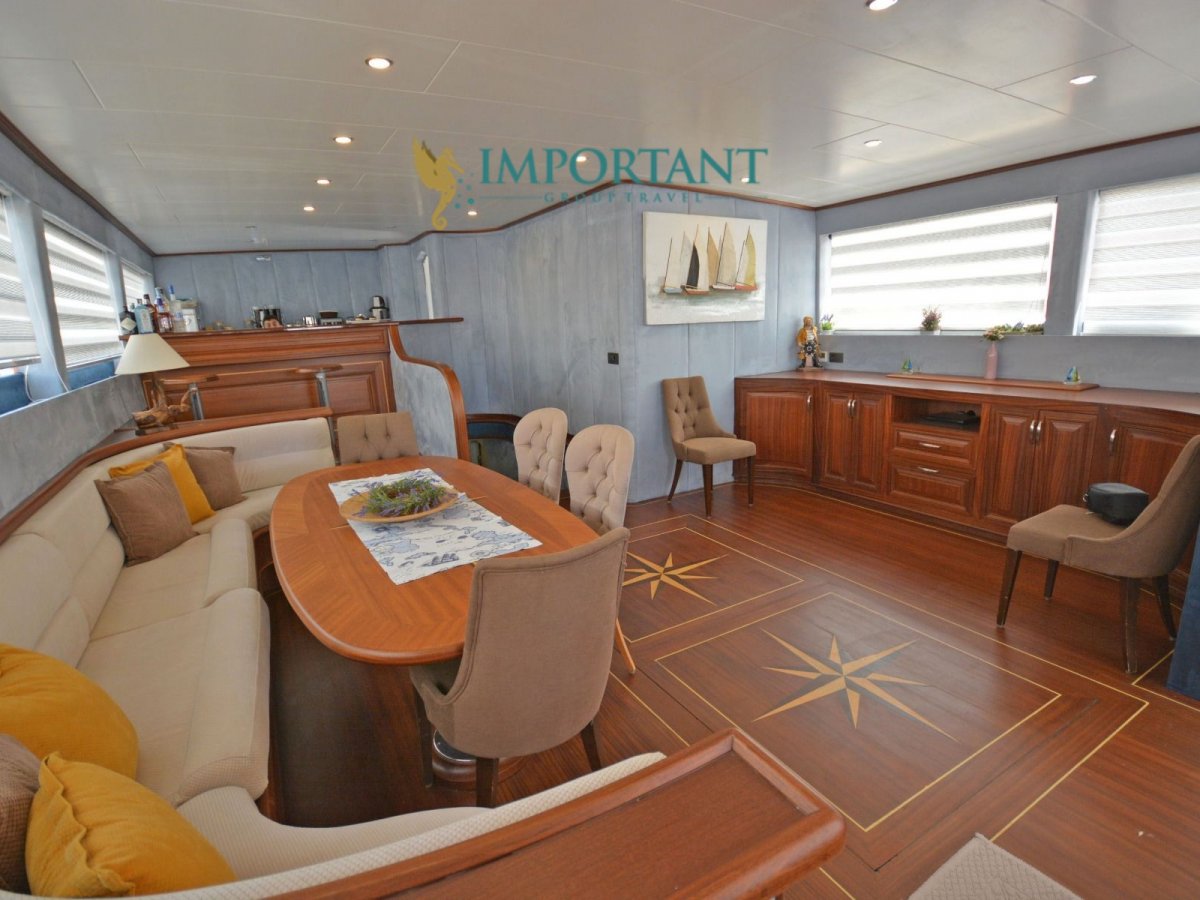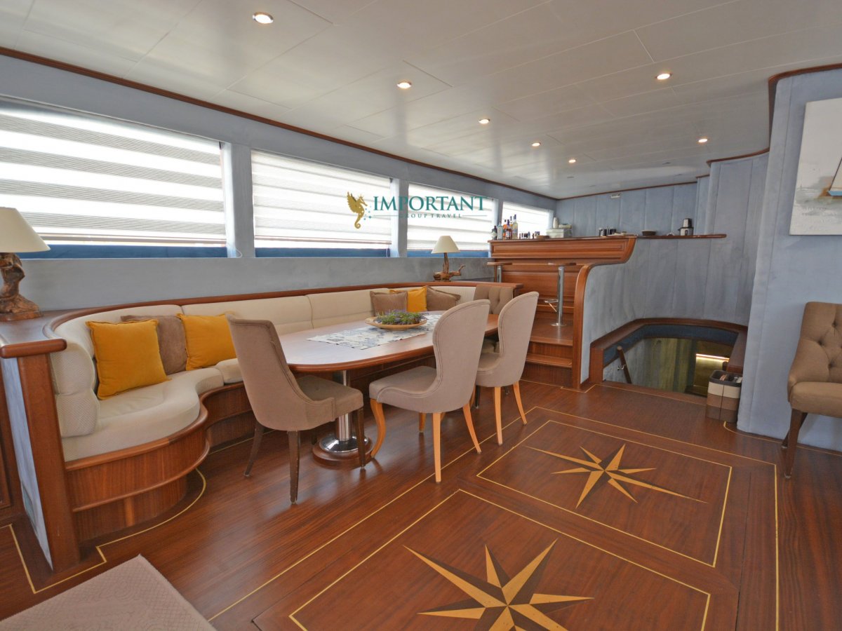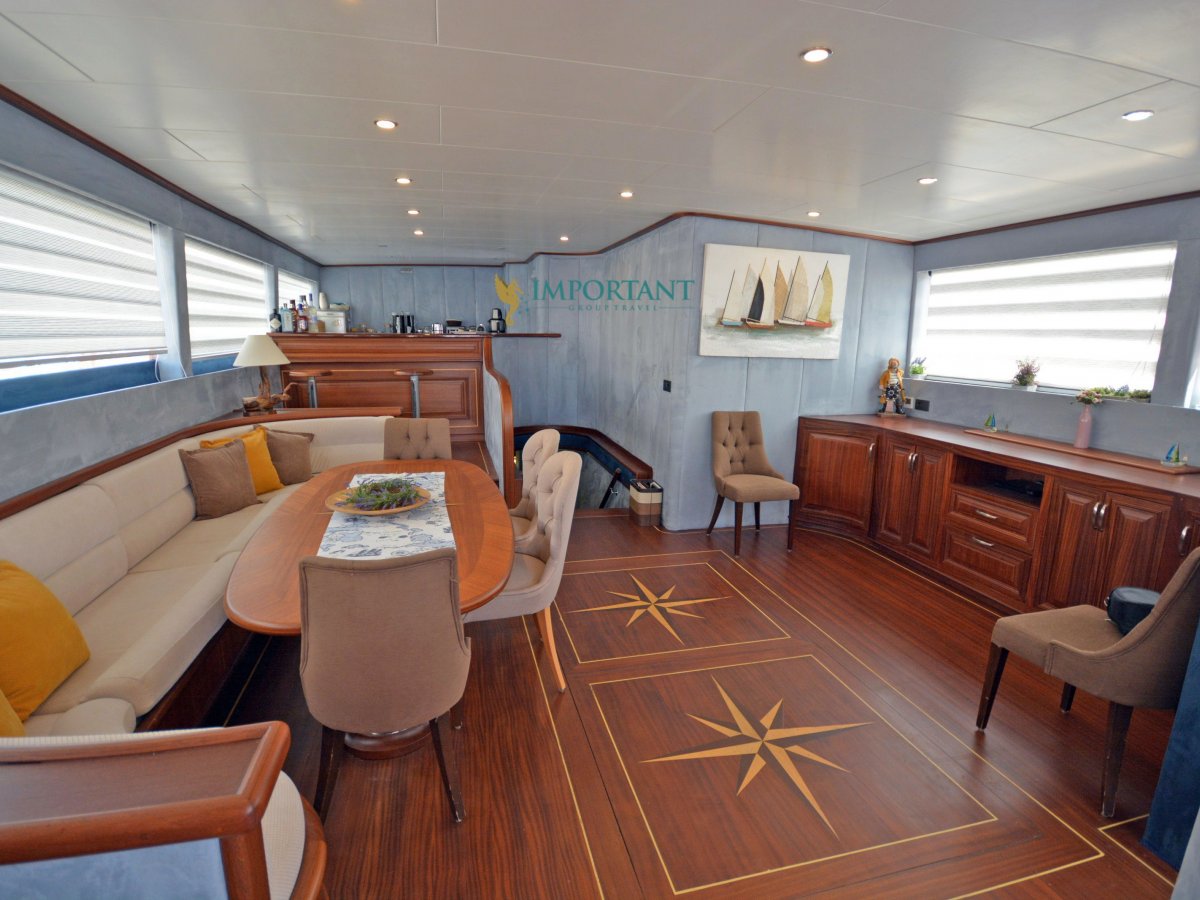Yatımızın iç dizaynı siz değerli misafirlerimizin tüm ihtiyacını karşılayacak şekilde dekore edilmiş olup, salonda ve güvertede yemek masalarına ve tam teşekküllü bir mutfağa sahiptir. Her kabinde duş, wc ve klima bulunmaktadır. Bodrum çıkışlı mavi tur için Lüks Yat kiralamak isteyen kalabalık gruplar için son derece ideal bir gulettir.