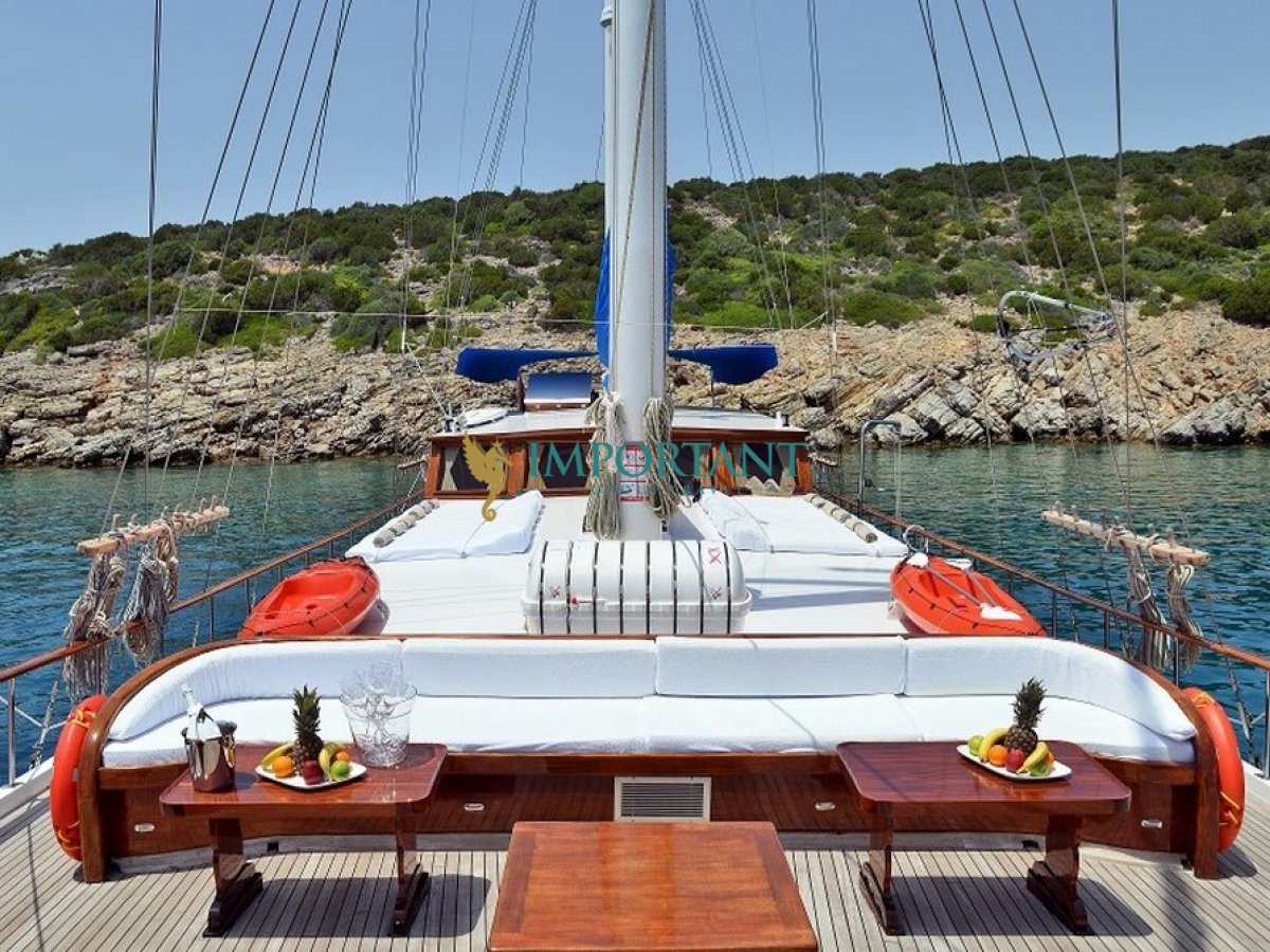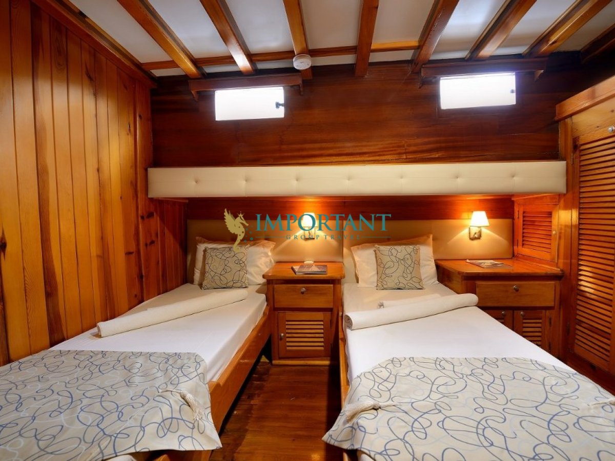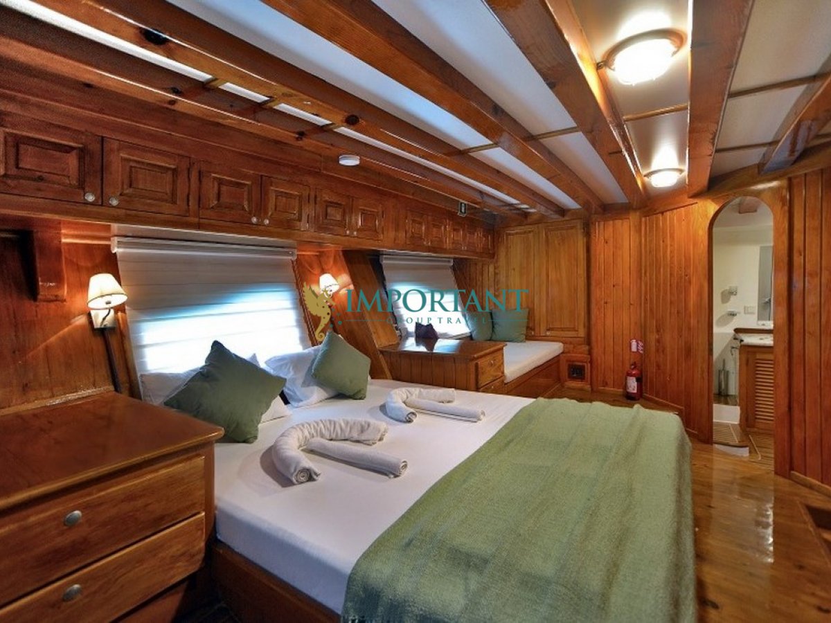 Bodrum çıkışlı 30 metre uzunluğundaki kiralık guletimiz, Ege Denizi’nin büyüleyici koylarını keşfetmeniz için harika bir fırsat sunuyor. Teknemiz, toplamda 12 kişilik konaklama kapasitesine sahip olup, 1 adet master, 3 adet çift kişilik yataklı Double ve 2 adet twin ile donatılmıştır.