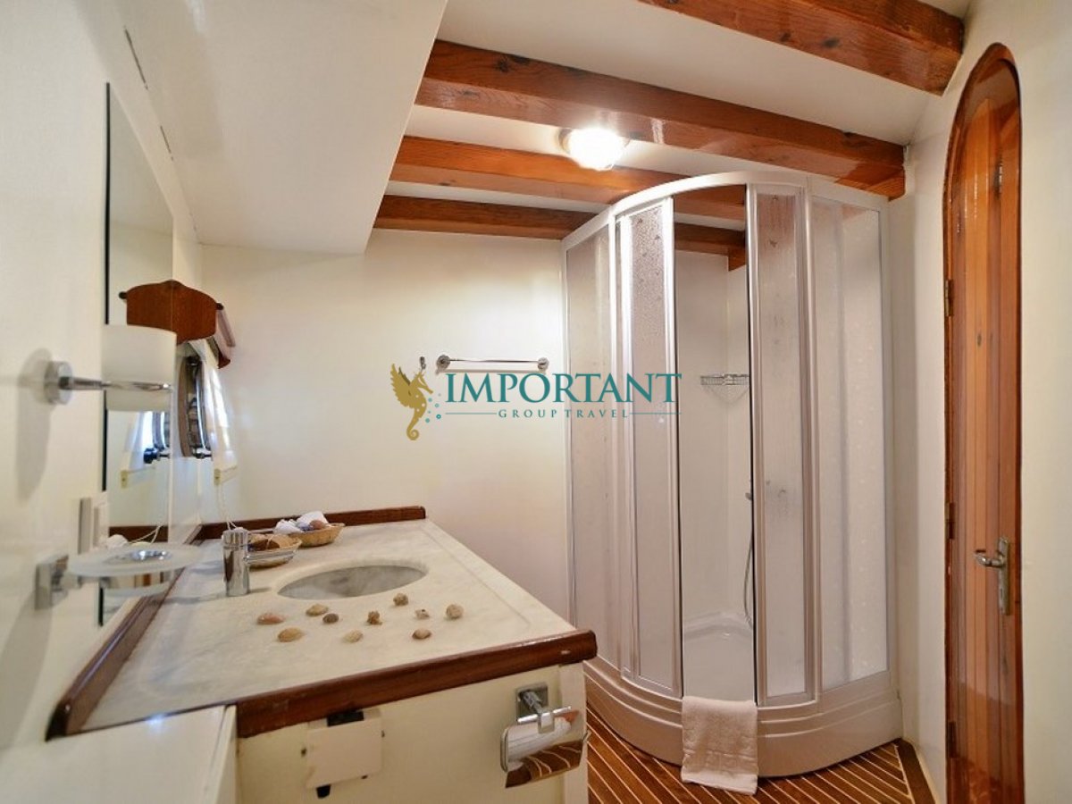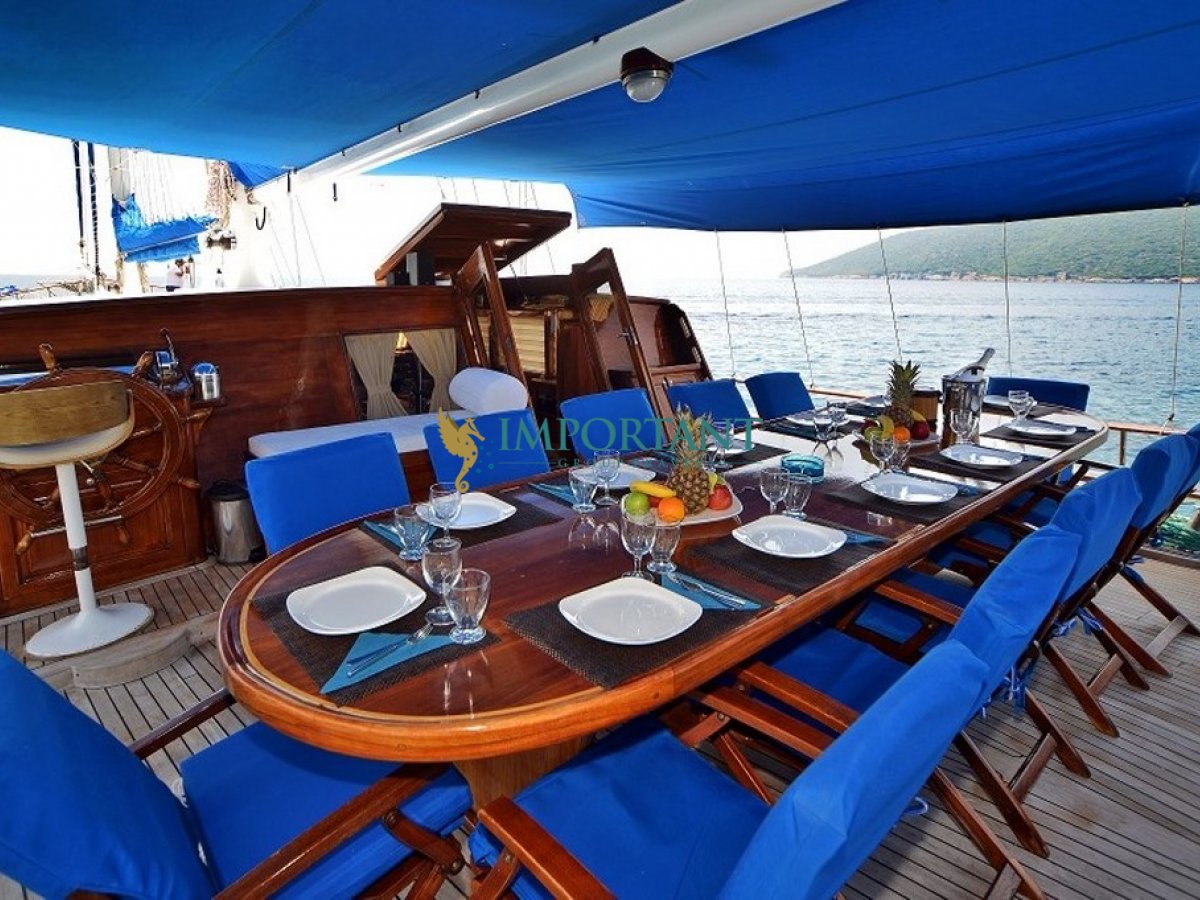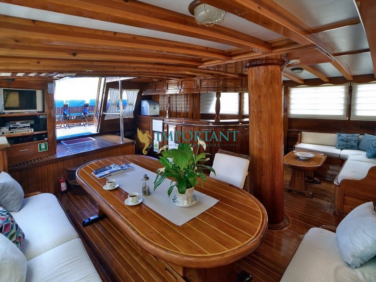 İç dizaynı, misafirlerimizin ihtiyaçlarını karşılamak üzere sade ve konforlu bir şekilde düzenlenmiştir. Geniş salonu ve güvertesinde yer alan yemek masaları ile sevdiklerinizle birlikte keyifli vakit geçirebileceğiniz alanlar sunmaktadır. Tam donanımlı mutfağımız, teknede geçirdiğiniz süre boyunca tüm gereksinimlerinizi karşılar. Her kabinde duş, wc ve klima bulunmaktadır. Bodrum çıkışlı bu guletimizle unutulmaz bir mavi yolculuğa çıkabilir, denizde de olsa evinizin rahatlığını hissedebilirsiniz.