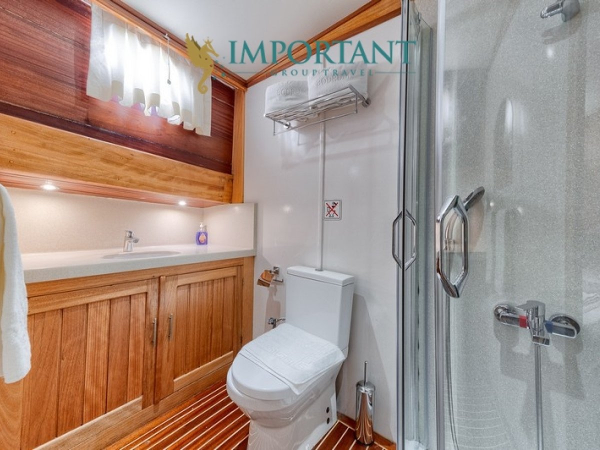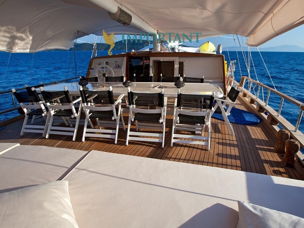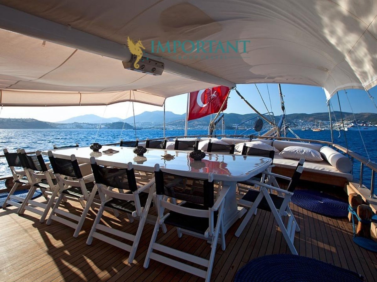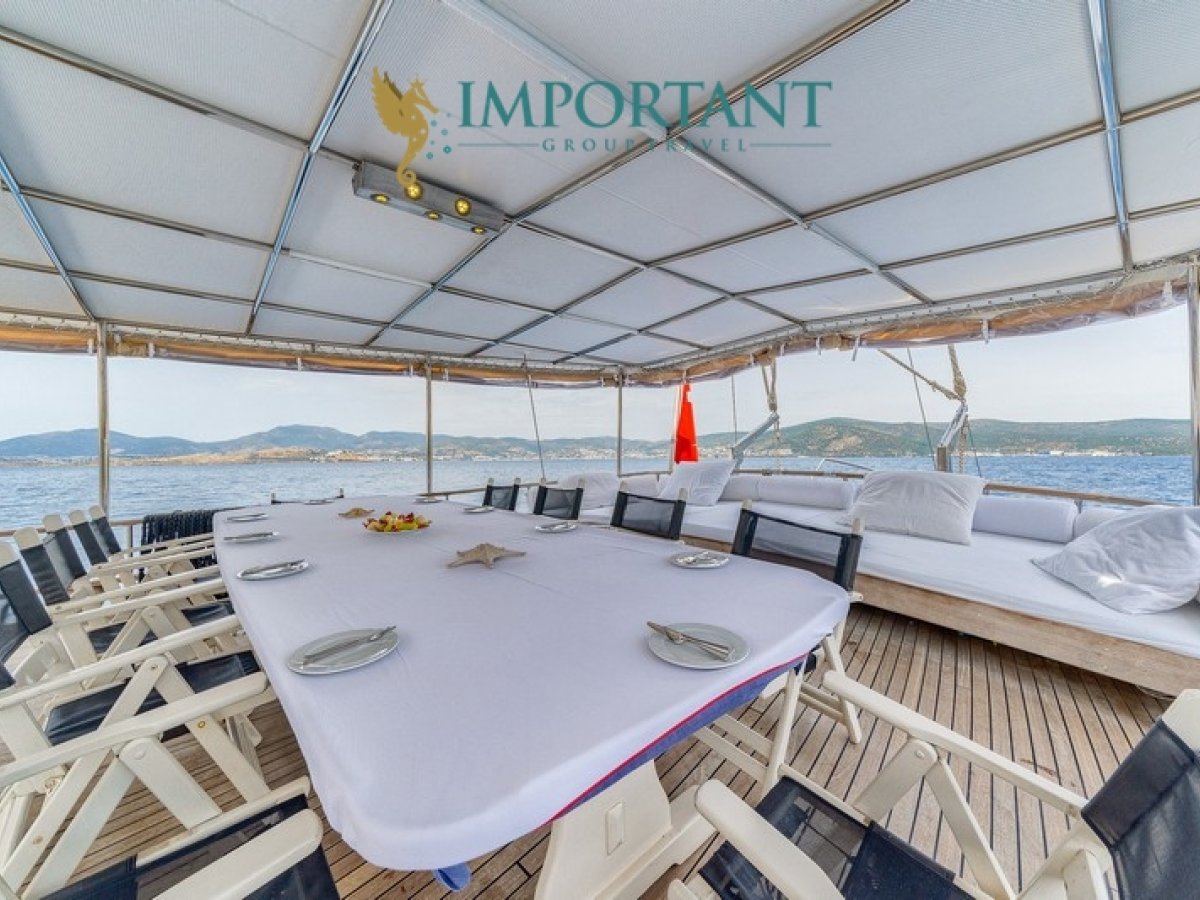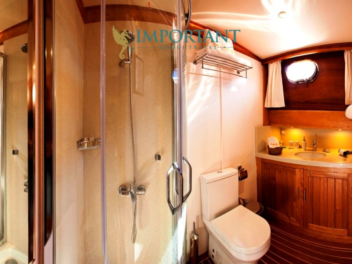 İç dizaynı, misafirlerimizin ihtiyaçlarını karşılamak üzere sade ve konforlu bir şekilde düzenlenmiştir. Geniş salonu ve güvertesinde yer alan yemek masaları ile sevdiklerinizle birlikte keyifli vakit geçirebileceğiniz alanlar sunmaktadır. Tam donanımlı mutfağımız, teknede geçirdiğiniz süre boyunca tüm gereksinimlerinizi karşılar. Her kabinde duş, wc ve klima bulunmaktadır. Bodrum çıkışlı bu guletimizle unutulmaz bir mavi yolculuğa çıkabilir, denizde de olsa evinizin rahatlığını hissedebilirsiniz.
