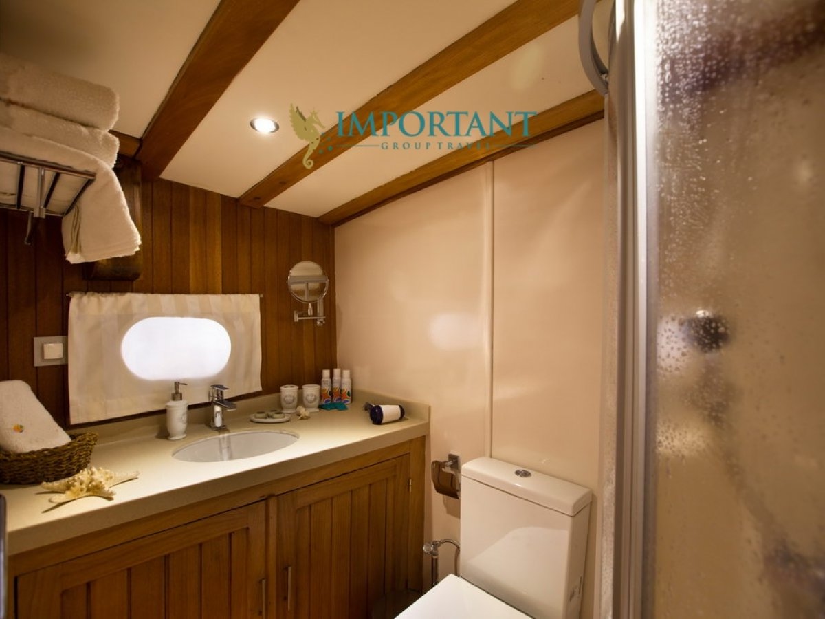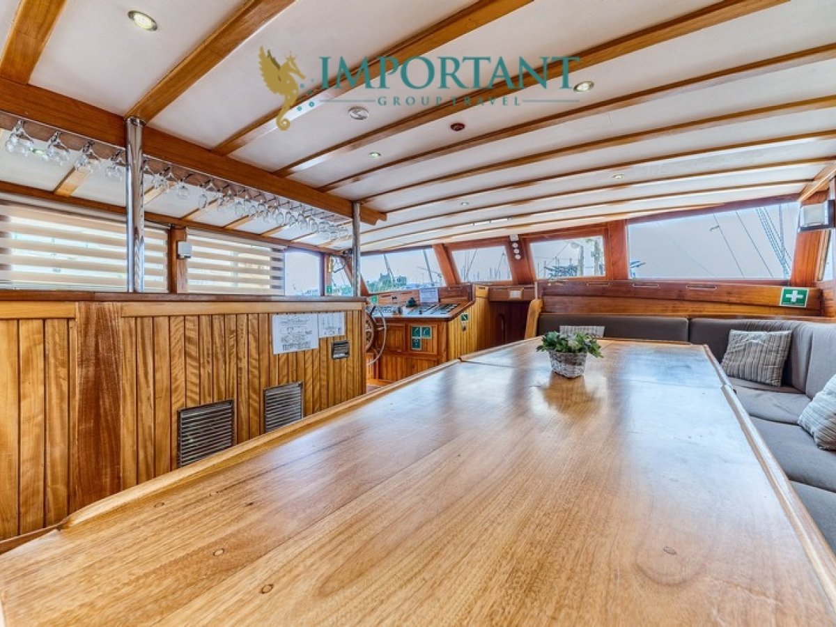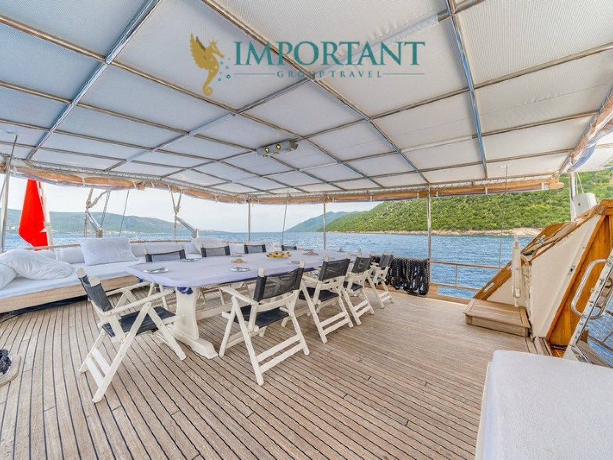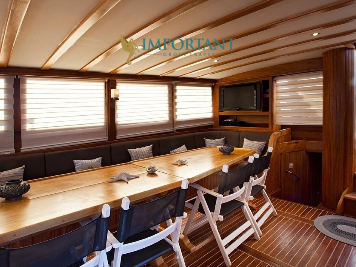 İç dizaynı, misafirlerimizin ihtiyaçlarını karşılamak üzere sade ve konforlu bir şekilde düzenlenmiştir. Geniş salonu ve güvertesinde yer alan yemek masaları ile sevdiklerinizle birlikte keyifli vakit geçirebileceğiniz alanlar sunmaktadır. Tam donanımlı mutfağımız, teknede geçirdiğiniz süre boyunca tüm gereksinimlerinizi karşılar. Her kabinde duş, wc ve klima bulunmaktadır. Bodrum çıkışlı bu guletimizle unutulmaz bir mavi yolculuğa çıkabilir, denizde de olsa evinizin rahatlığını hissedebilirsiniz.