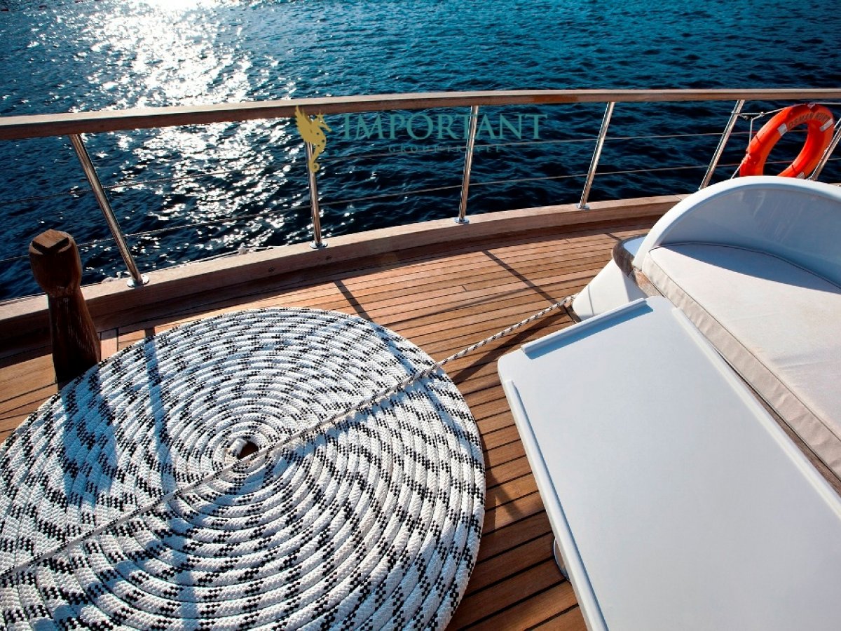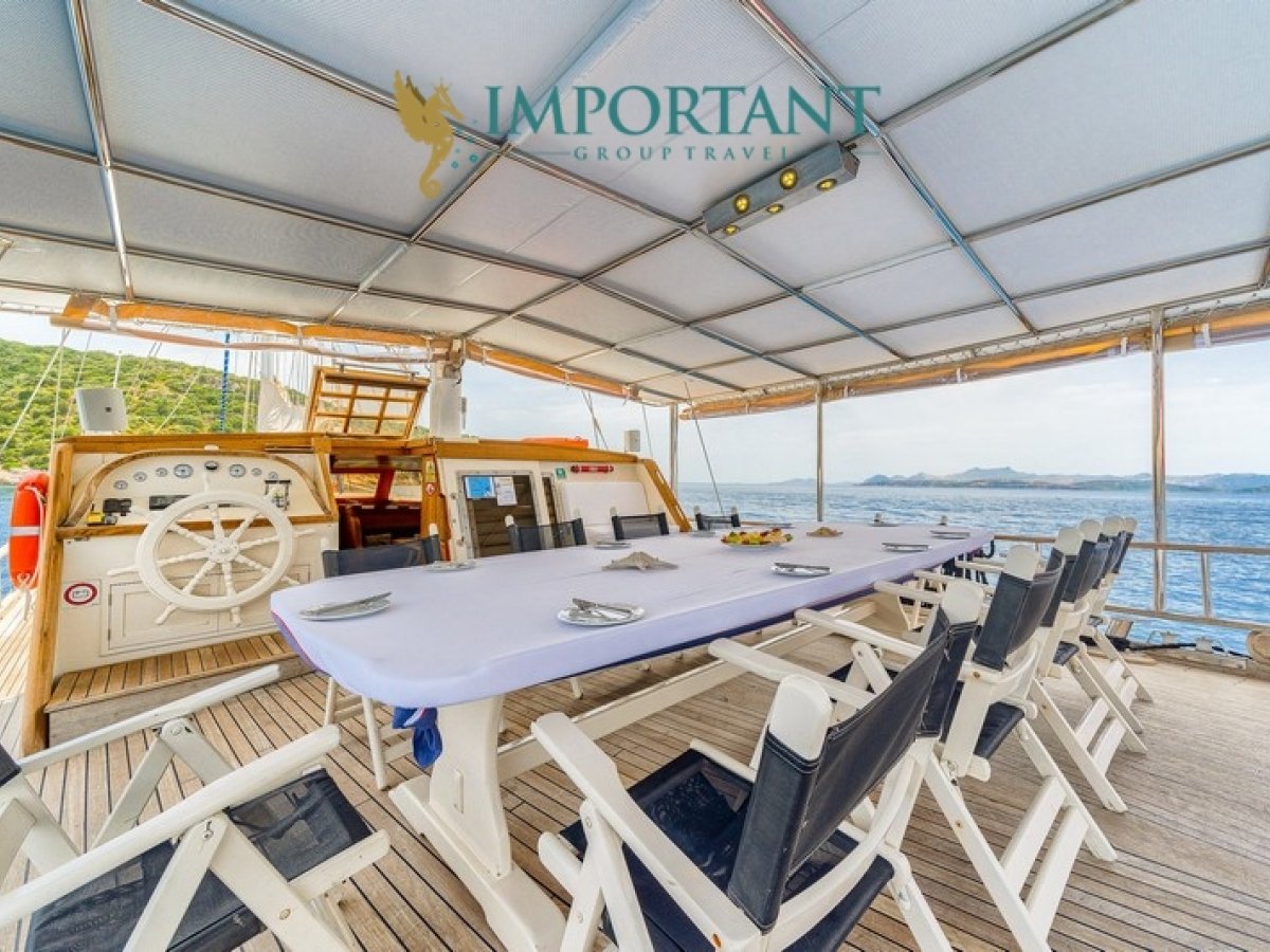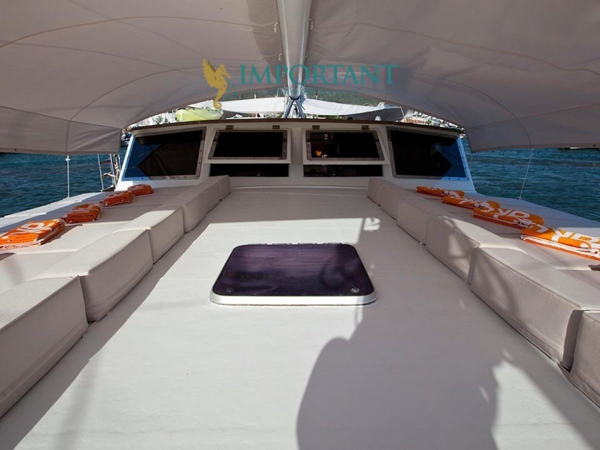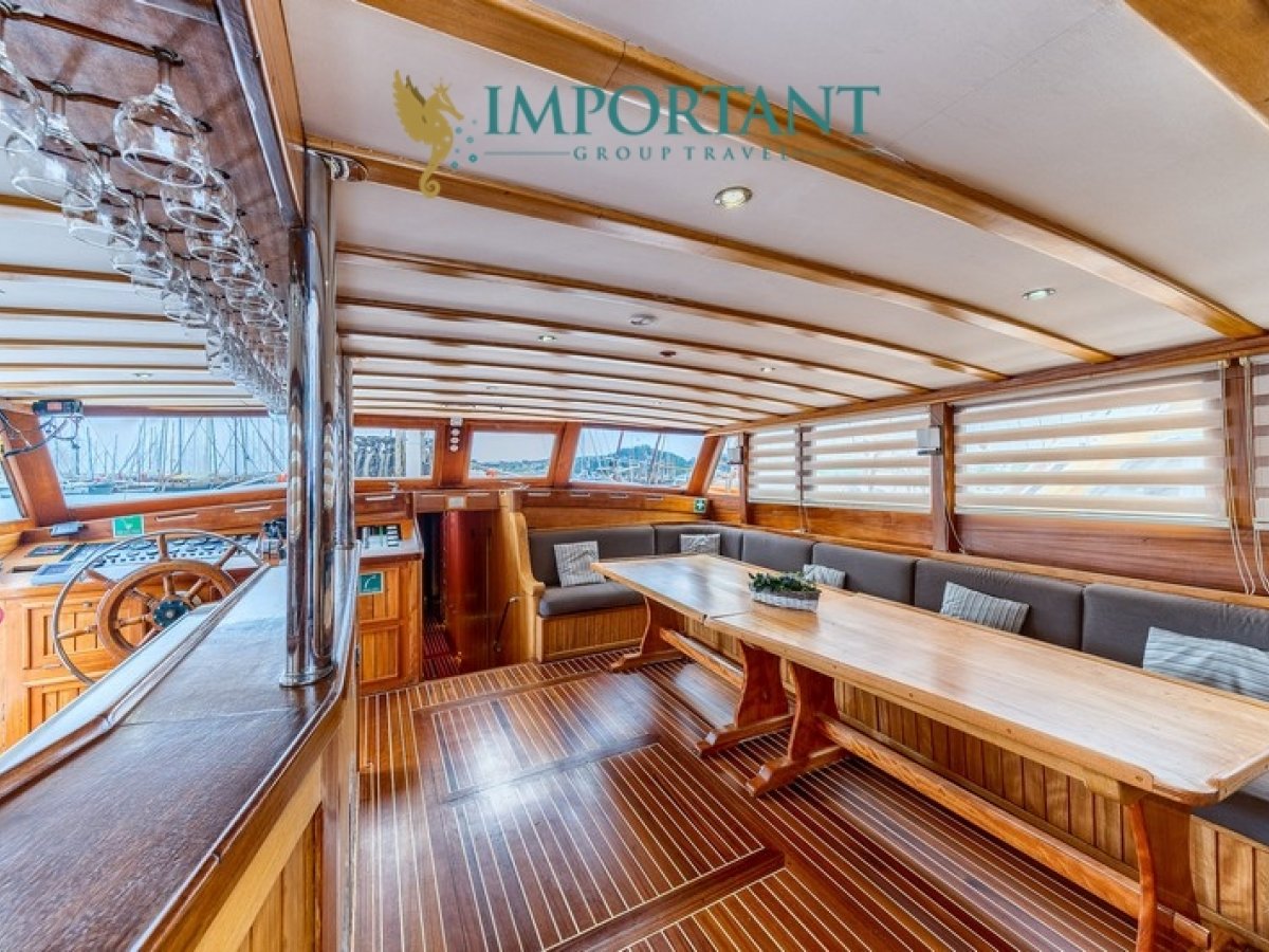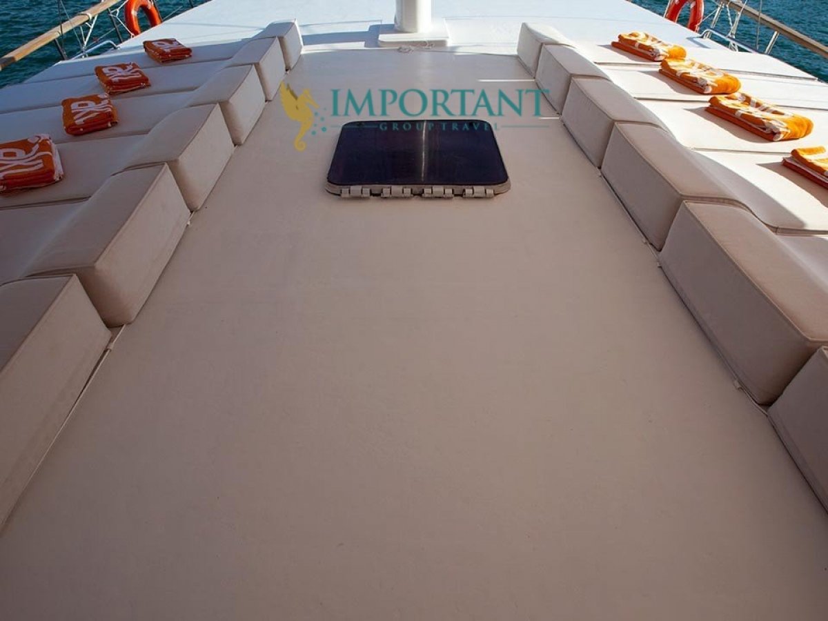 İç dizaynı, misafirlerimizin ihtiyaçlarını karşılamak üzere sade ve konforlu bir şekilde düzenlenmiştir. Geniş salonu ve güvertesinde yer alan yemek masaları ile sevdiklerinizle birlikte keyifli vakit geçirebileceğiniz alanlar sunmaktadır. Tam donanımlı mutfağımız, teknede geçirdiğiniz süre boyunca tüm gereksinimlerinizi karşılar. Her kabinde duş, wc ve klima bulunmaktadır. Bodrum çıkışlı bu guletimizle unutulmaz bir mavi yolculuğa çıkabilir, denizde de olsa evinizin rahatlığını hissedebilirsiniz.
