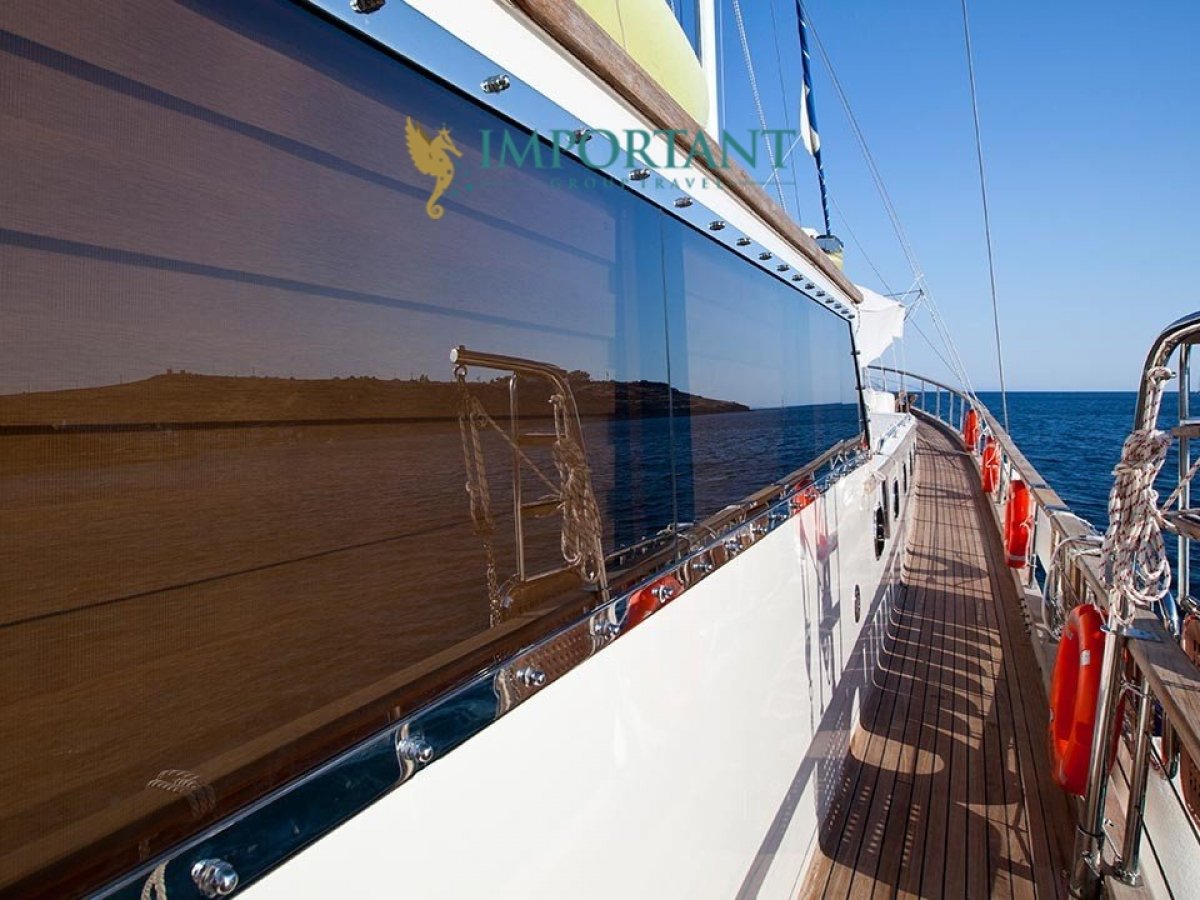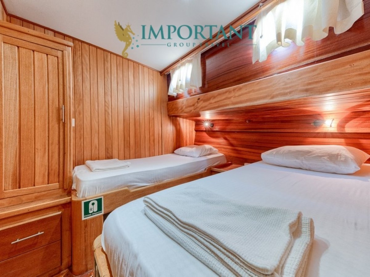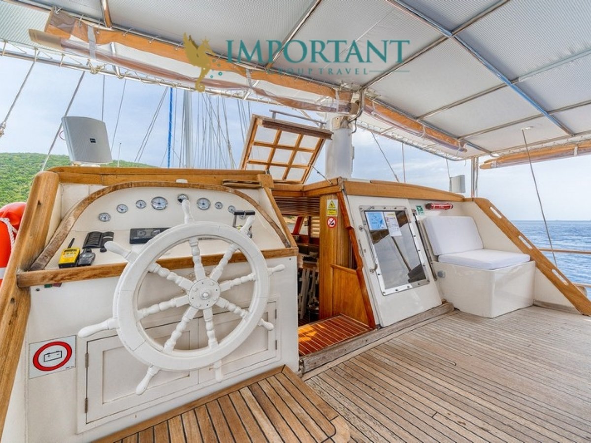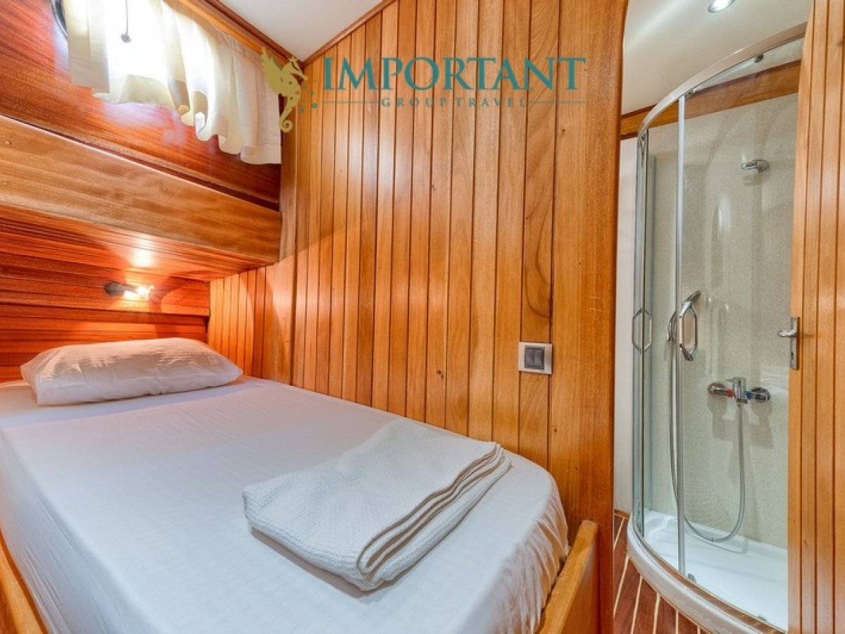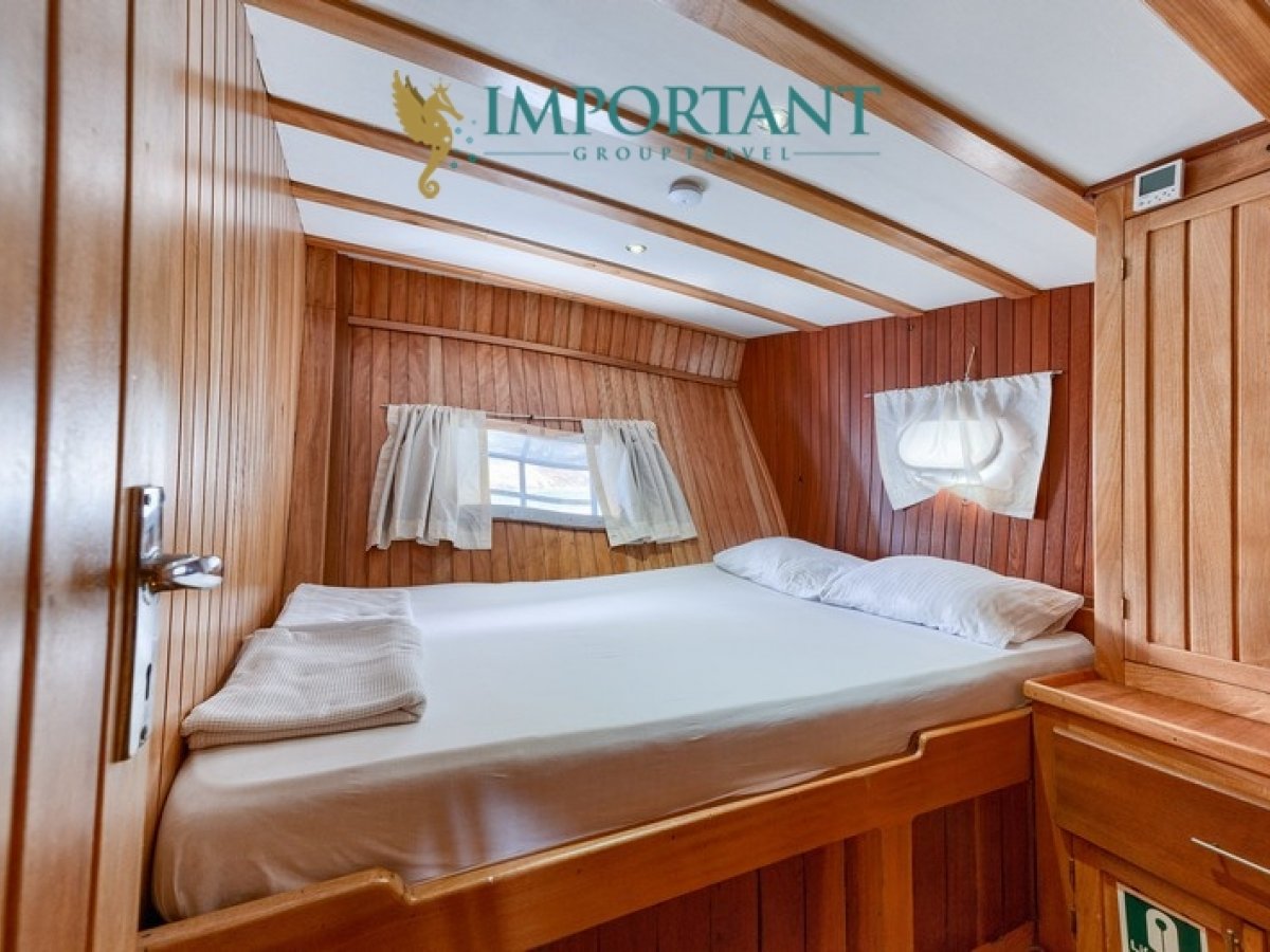 Bodrum çıkışlı 32 metre uzunluğundaki kiralık guletimiz, Ege Denizi’nin büyüleyici koylarını keşfetmeniz için harika bir fırsat sunuyor. Teknemiz, toplamda 16 kişilik konaklama kapasitesine sahip olup, 4 adet çift kişilik yataklı Double ve 4 adet tek kişilik ayrı yataklı Twin kabin ile donatılmıştır.