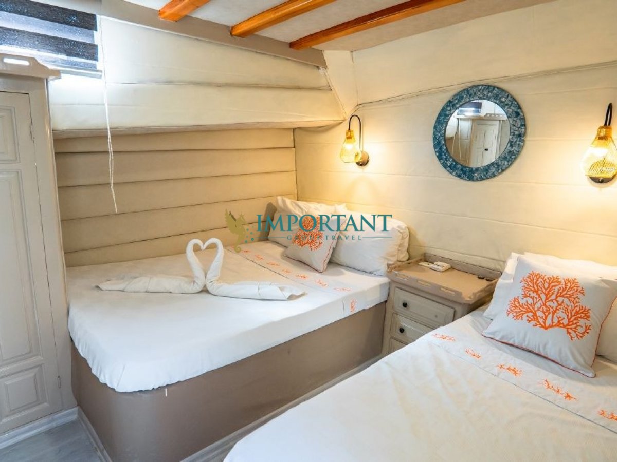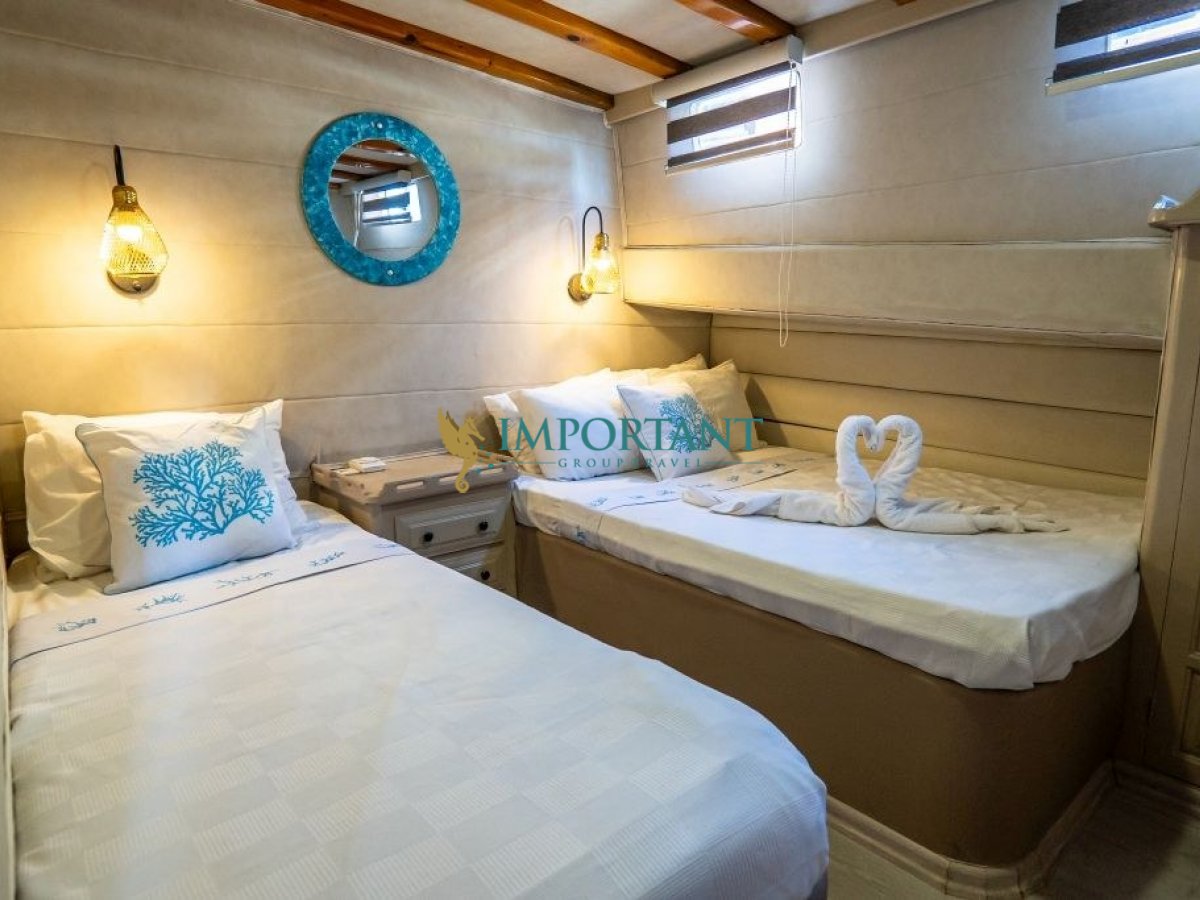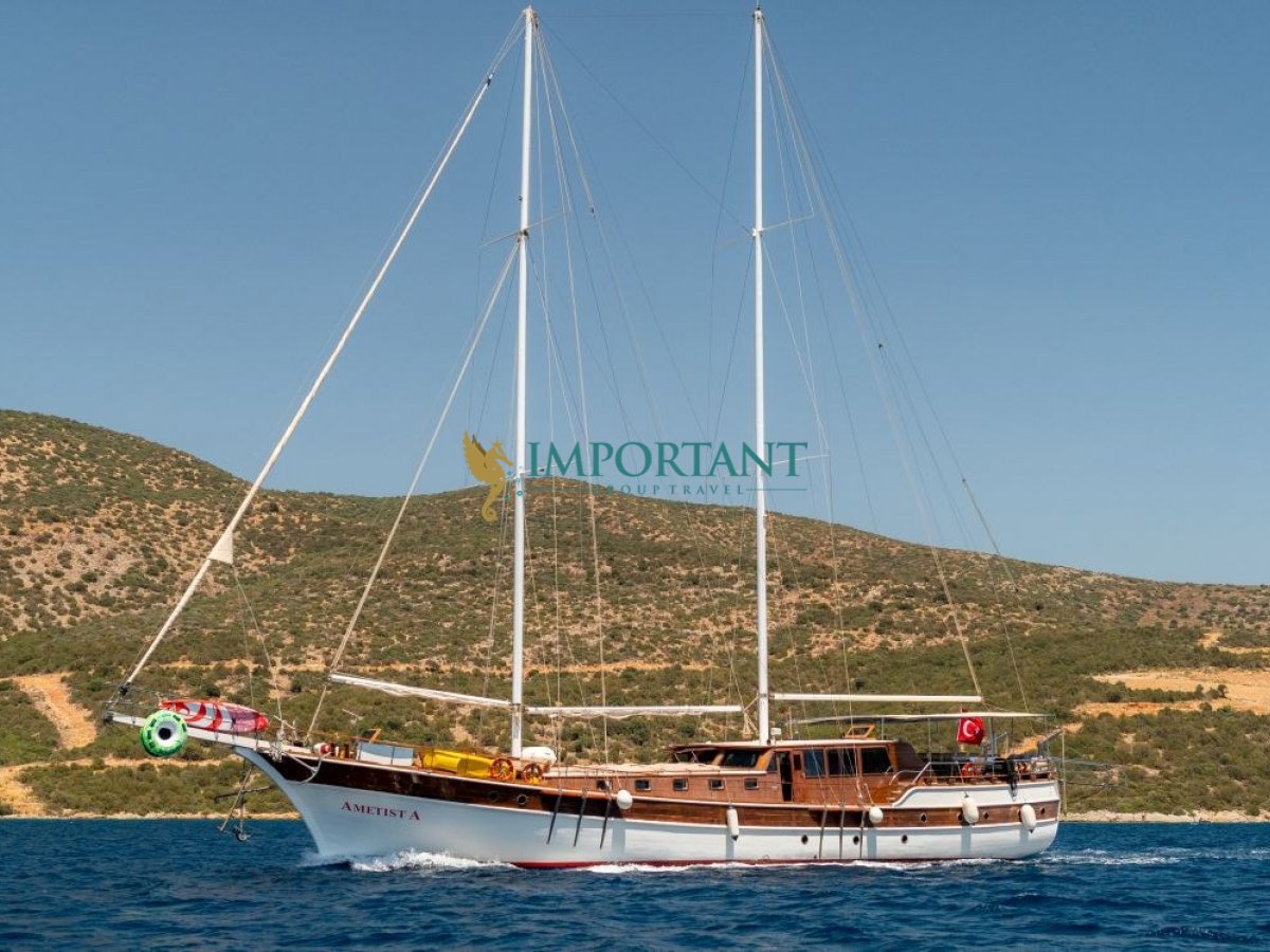 Bodrum çıkışlı bu lüks guletimizle unutulmaz bir mavi yolculuğa çıkabilirsiniz. Farklı destinasyonları tercih eden misafirlerimiz için Marmaris'in eşsiz doğal güzelliklerinin tadını çıkarabilir, Göcek’in gizli cennetlerini ziyaret edebilir veya Fethiye'nin kristal berraklığındaki sularında yüzebilir, Bozburun’un bozulmamış güzelliklerinde de zaman geçirebilirsiniz; ayrıca maceranızı Yunan Adaları’na kadar uzatabilirsiniz (Yunan Adaları için ekstra ücretler hakkında bilgi almak için bizimle iletişime geçin). Bu unutulmaz deneyimde hem evinizdeymiş gibi huzurlu hissedecek hem de Ege’nin masmavi sularında özgürlüğün tadını çıkaracaksınız.