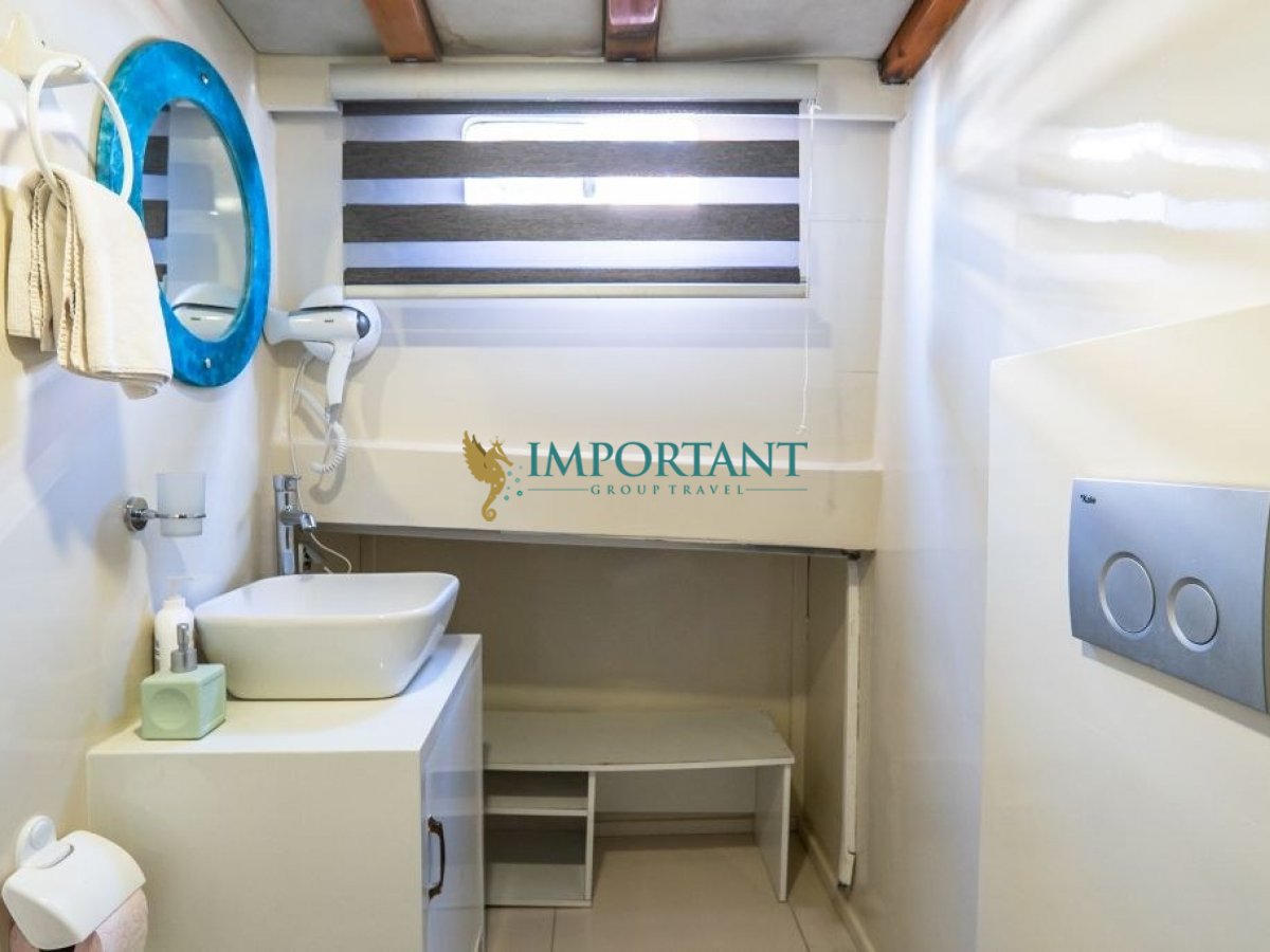 İç dizaynı, misafirlerimizin ihtiyaçlarını karşılamak üzere özenle dekore edilmiştir. Geniş salonunda ve güvertesinde yer alan yemek masaları, sevdiklerinizle birlikte keyifli yemekler yiyebileceğiniz alanlar sunmaktadır. Tam donanımlı mutfağı, teknede geçirdiğiniz süre boyunca tüm gereksinimlerinizi karşılar. Her kabinde duş, wc ve klima bulunmaktadır; böylece denizde bile evinizin rahatlığını hissedebilirsiniz.