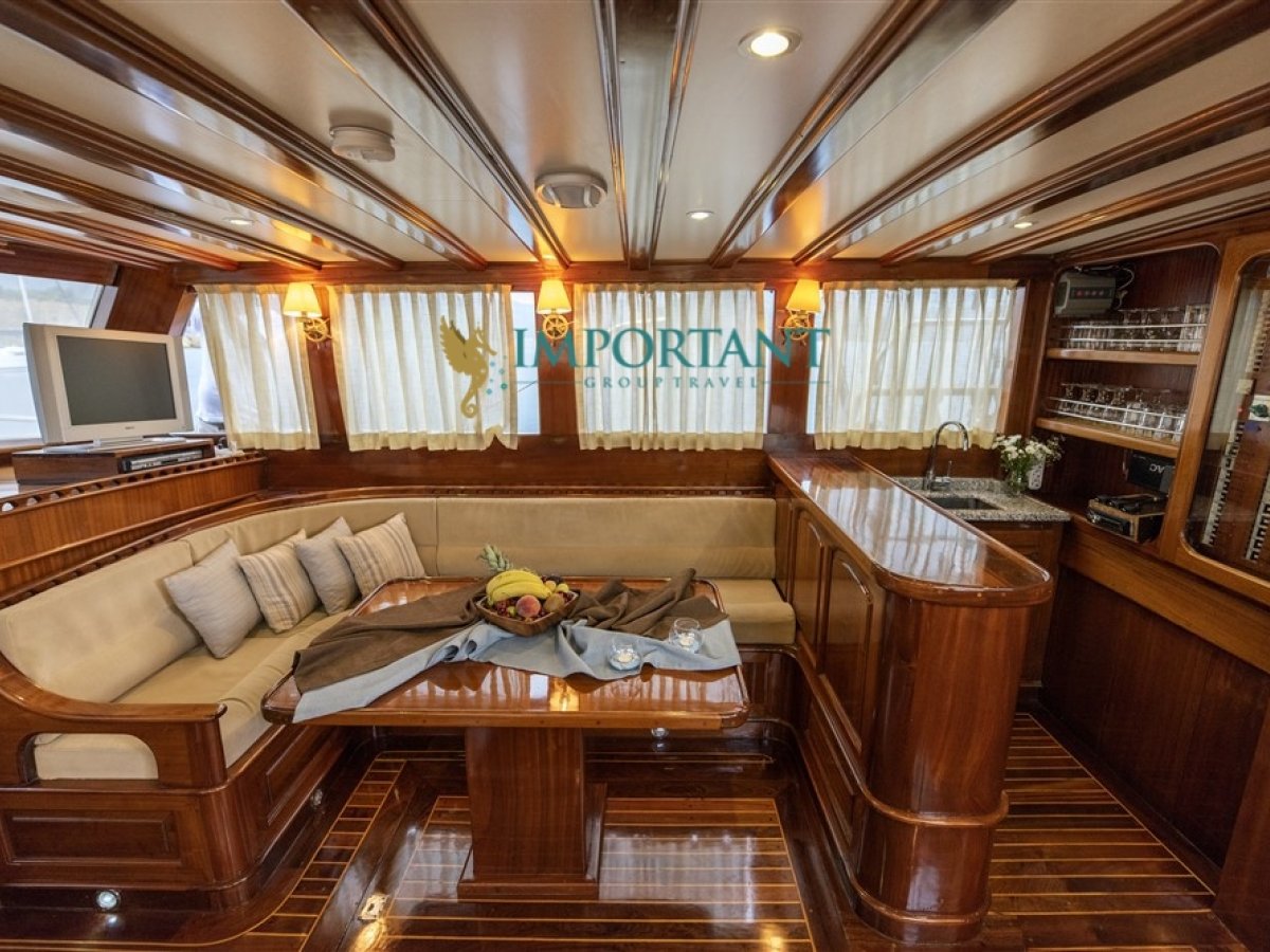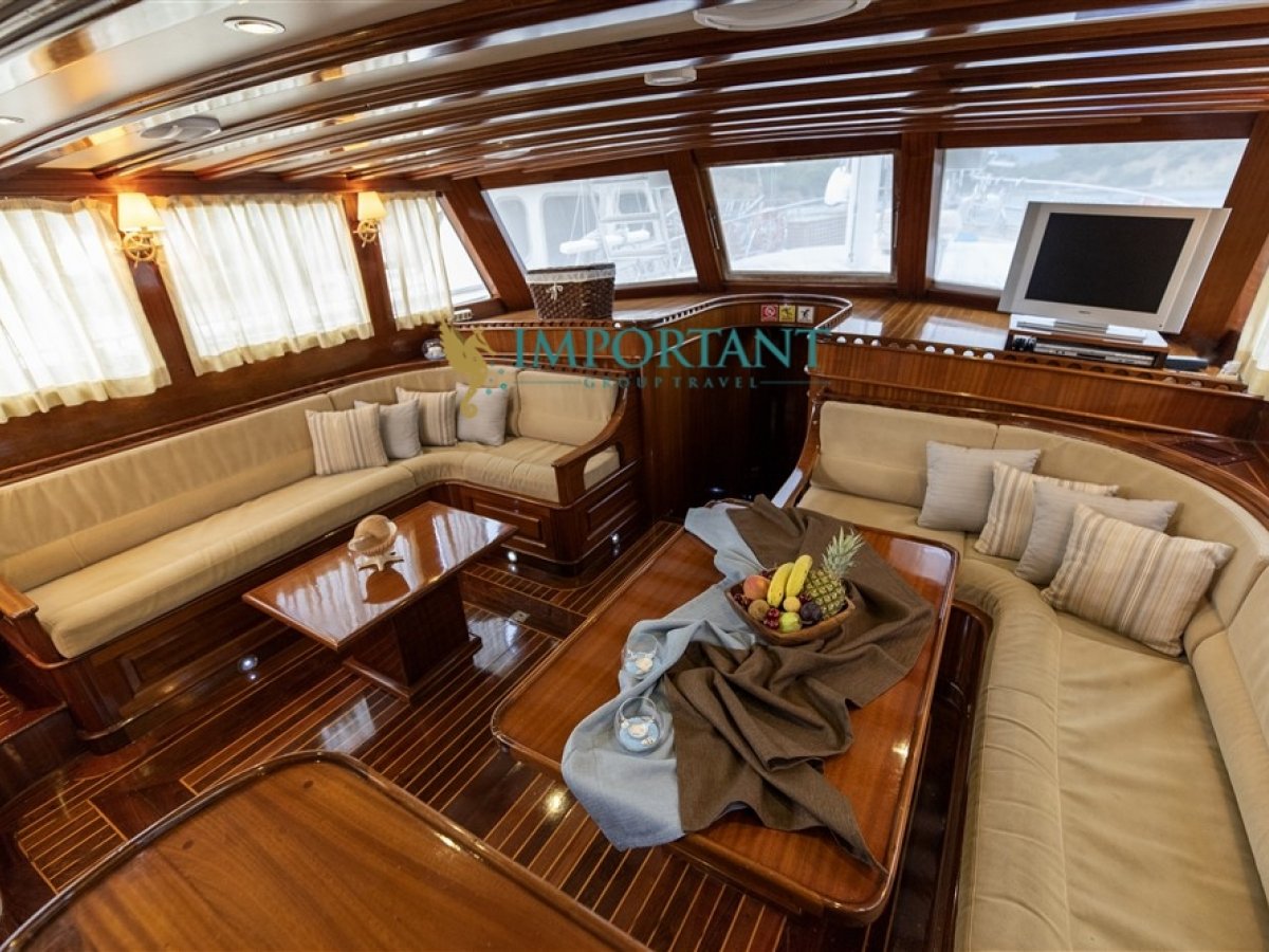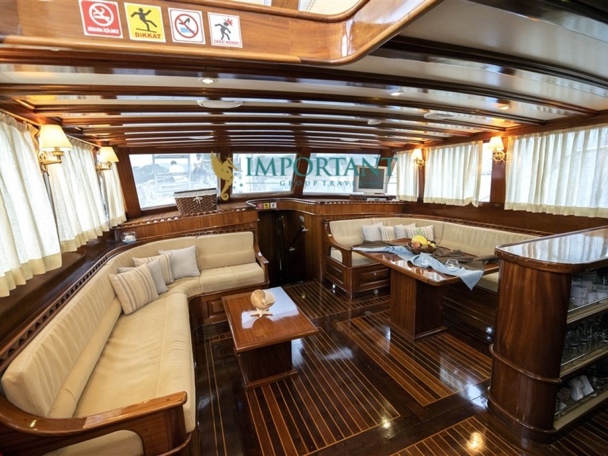 İç dizaynı, misafirlerimizin ihtiyaçlarını karşılamak üzere sade ve konforlu bir şekilde düzenlenmiştir. Geniş salonu ve güvertesinde yer yemek masaları ile sevdiklerinizle birlikte keyifli vakit geçirebileceğiniz alanlar sunmaktadır. Tam donanımlı mutfağımız, teknede geçirdiğiniz süre boyunca tüm gereksinimlerinizi karşılar. Her kabinde duş ve WC bulunmaktadır. Fethiye çıkışlı bu guletimizle unutulmaz bir mavi yolculuğa çıkabilir, denizde de olsa evinizin rahatlığını hissedebilirsiniz.
