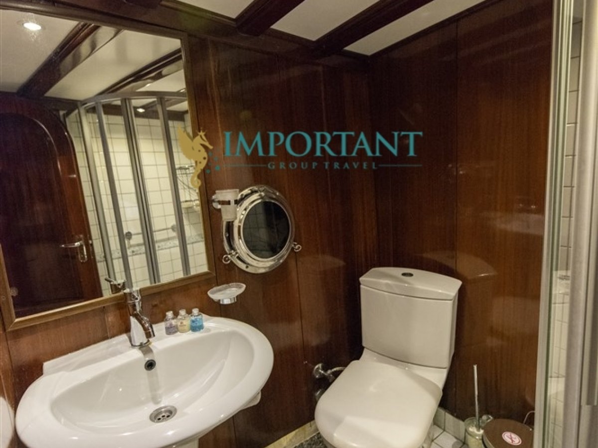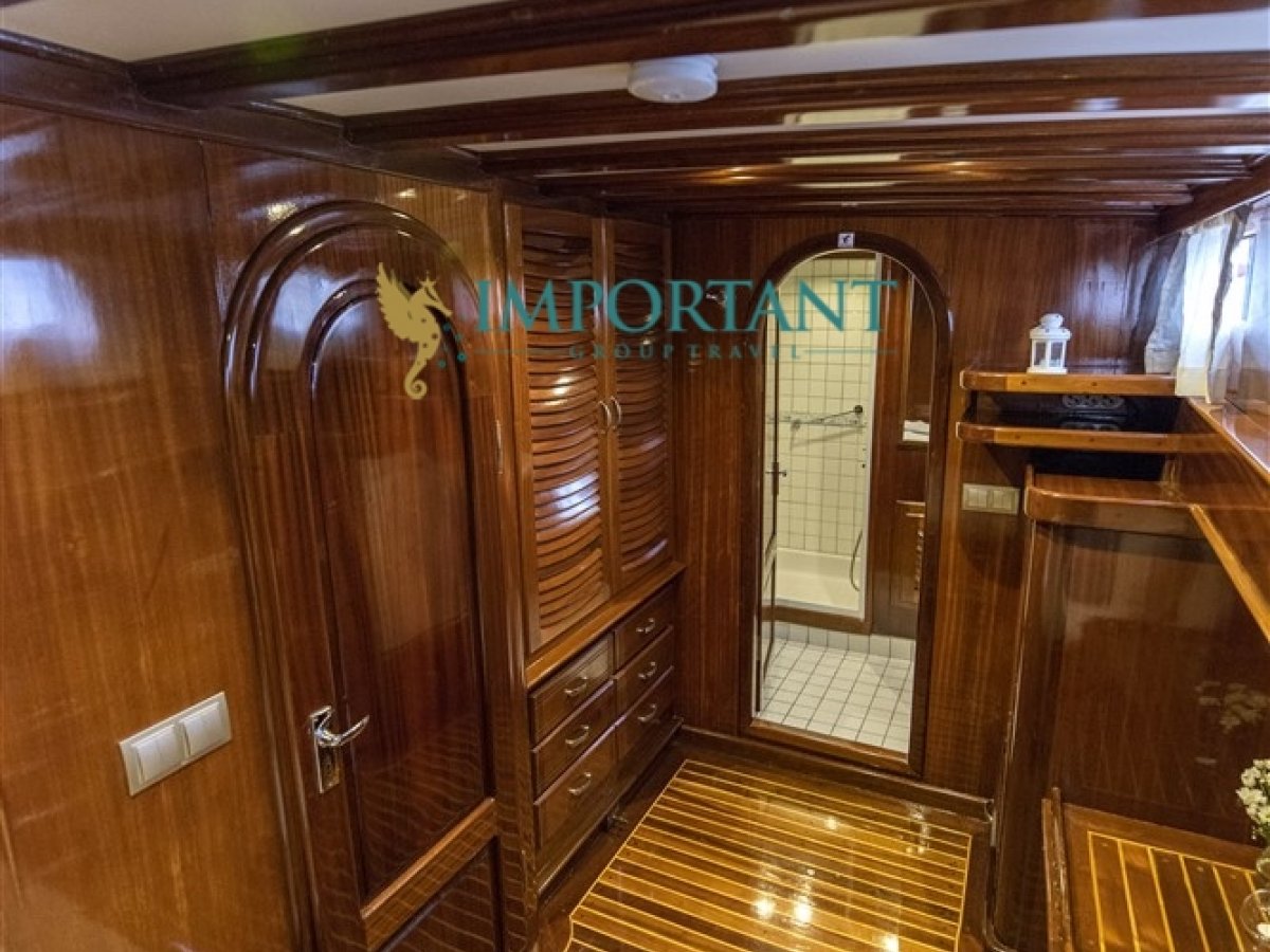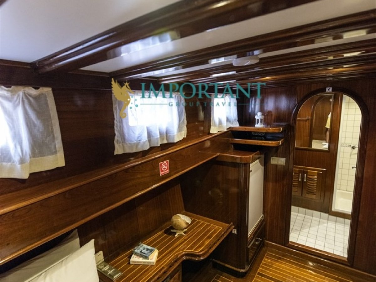 İç dizaynı, misafirlerimizin ihtiyaçlarını karşılamak üzere sade ve konforlu bir şekilde düzenlenmiştir. Geniş salonu ve güvertesinde yer yemek masaları ile sevdiklerinizle birlikte keyifli vakit geçirebileceğiniz alanlar sunmaktadır. Tam donanımlı mutfağımız, teknede geçirdiğiniz süre boyunca tüm gereksinimlerinizi karşılar. Her kabinde duş ve WC bulunmaktadır. Fethiye çıkışlı bu guletimizle unutulmaz bir mavi yolculuğa çıkabilir, denizde de olsa evinizin rahatlığını hissedebilirsiniz.