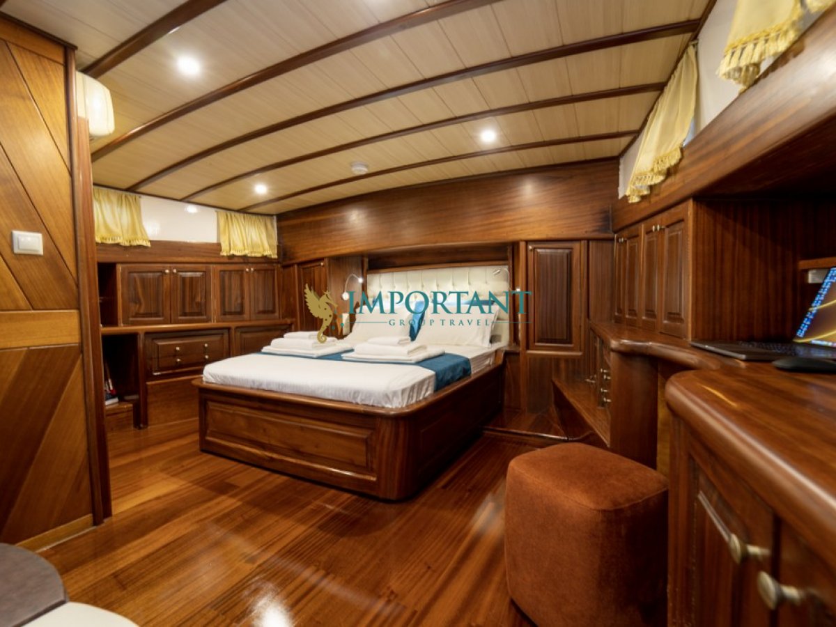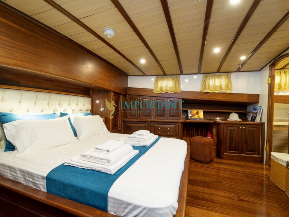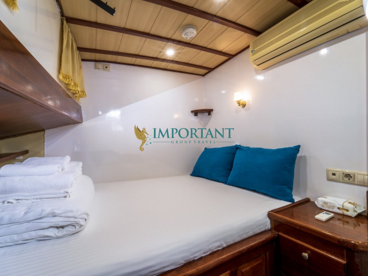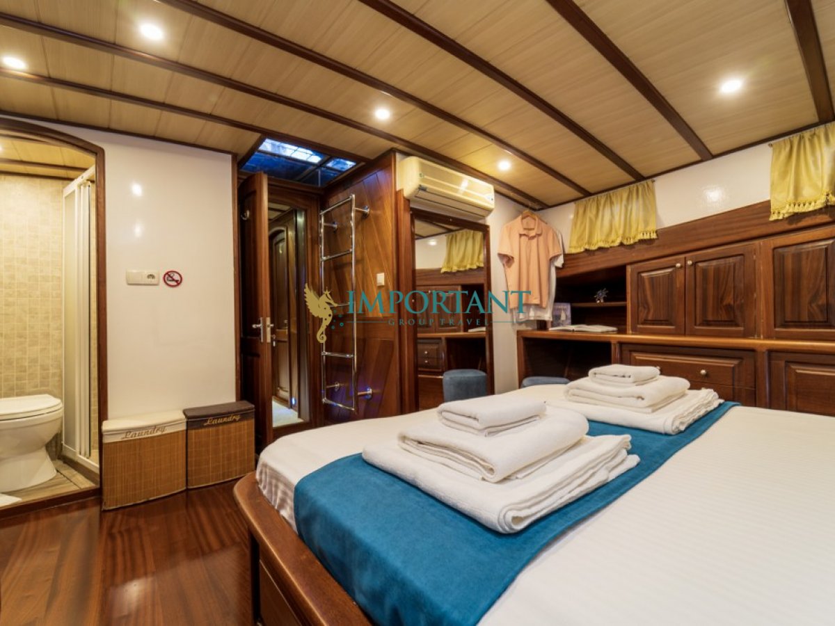 İç dizaynı, misafirlerimizin ihtiyaçlarını karşılamak üzere sade ve konforlu bir şekilde düzenlenmiştir. Geniş salonu ve güvertesinde yer yemek masaları ile sevdiklerinizle birlikte keyifli vakit geçirebileceğiniz alanlar sunmaktadır. Tam donanımlı mutfağımız, teknede geçirdiğiniz süre boyunca tüm gereksinimlerinizi karşılar. Her kabinde duş, WC ve klima bulunmaktadır. Fethiye çıkışlı bu guletimizle unutulmaz bir mavi yolculuğa çıkabilir, denizde de olsa evinizin rahatlığını hissedebilirsiniz.