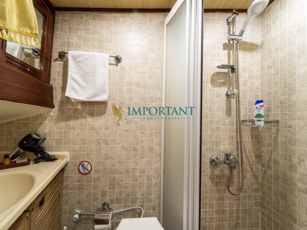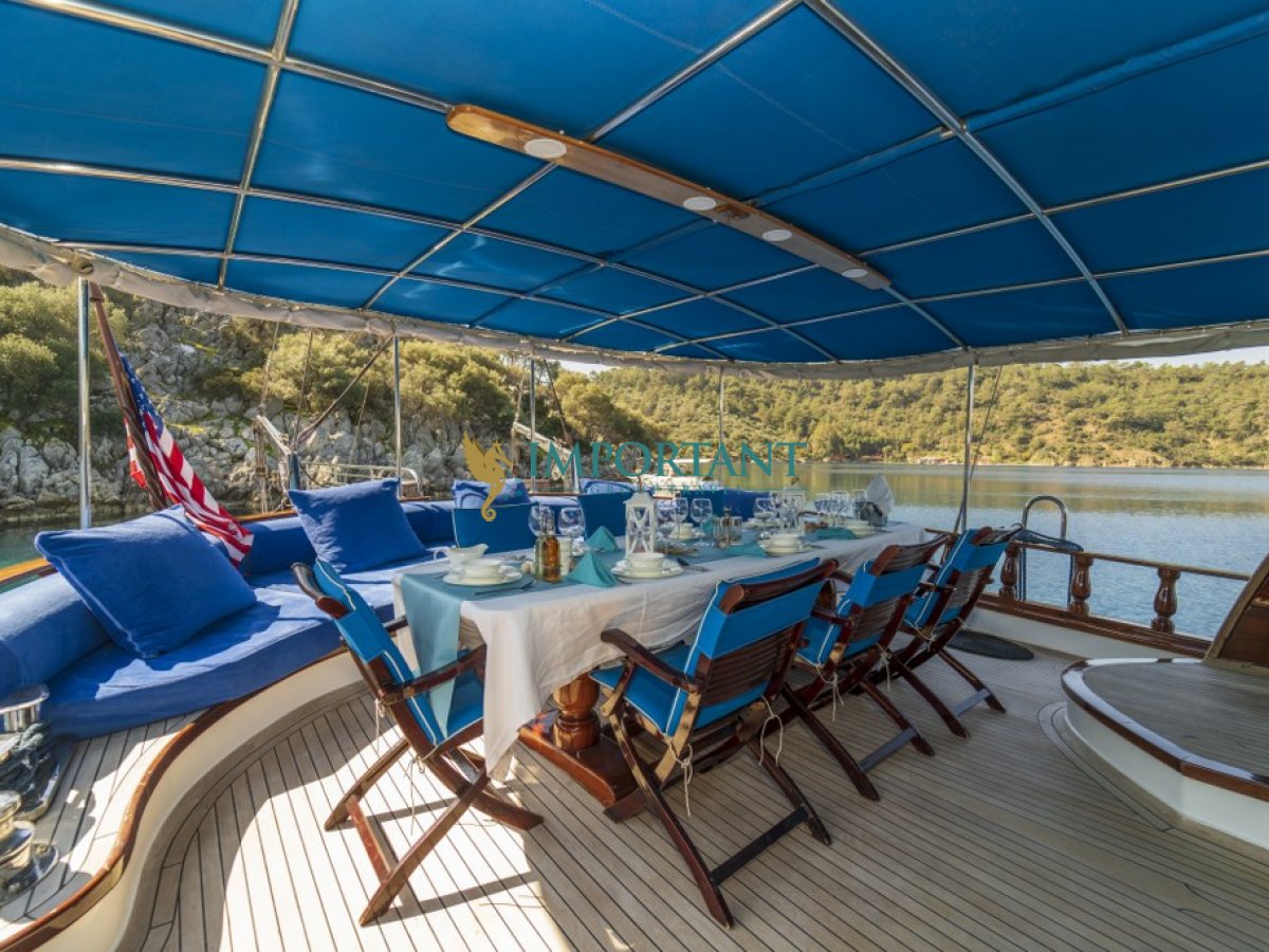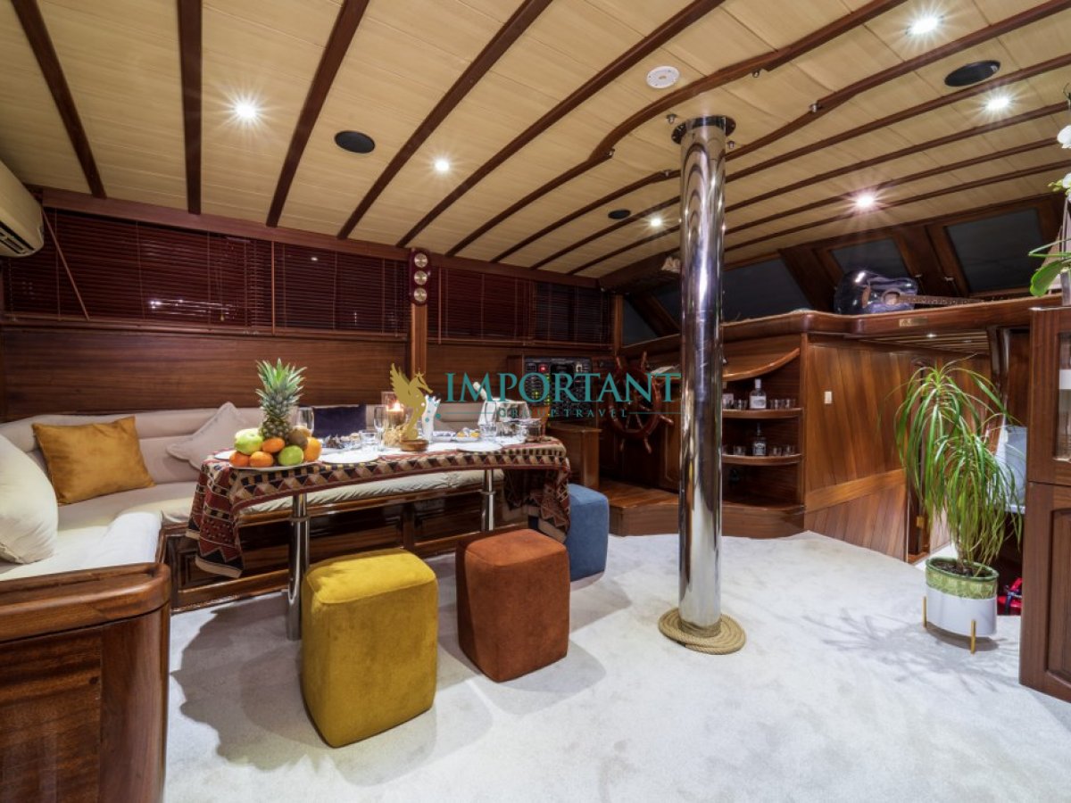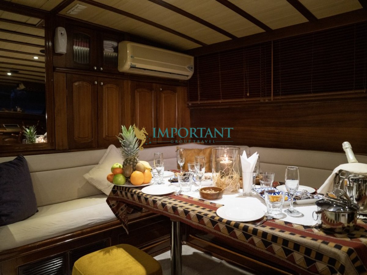 İç dizaynı, misafirlerimizin ihtiyaçlarını karşılamak üzere sade ve konforlu bir şekilde düzenlenmiştir. Geniş salonu ve güvertesinde yer yemek masaları ile sevdiklerinizle birlikte keyifli vakit geçirebileceğiniz alanlar sunmaktadır. Tam donanımlı mutfağımız, teknede geçirdiğiniz süre boyunca tüm gereksinimlerinizi karşılar. Her kabinde duş, WC ve klima bulunmaktadır. Fethiye çıkışlı bu guletimizle unutulmaz bir mavi yolculuğa çıkabilir, denizde de olsa evinizin rahatlığını hissedebilirsiniz.