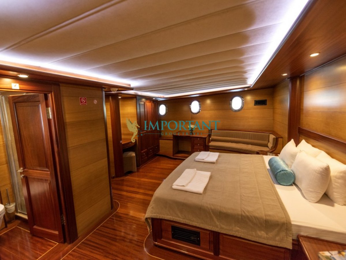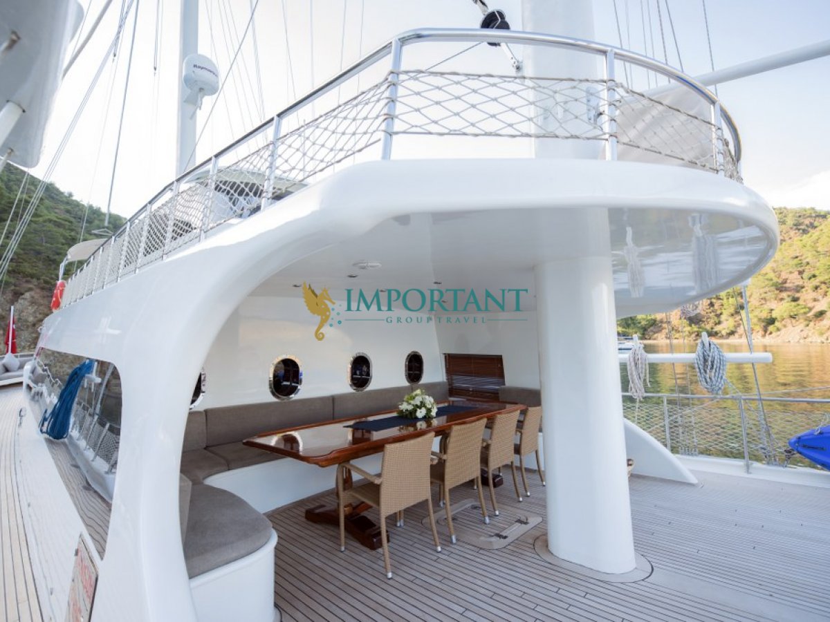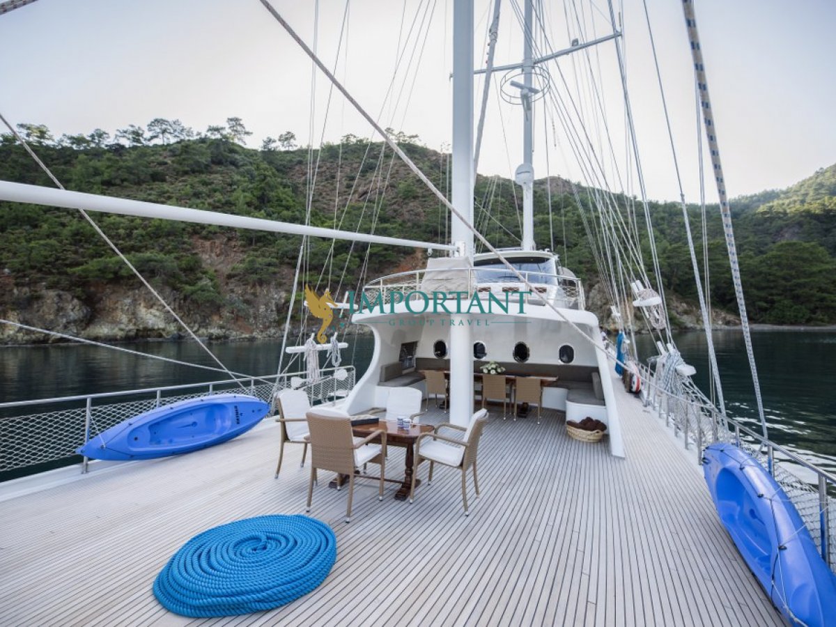 Fethiye çıkışlı bu lüks guletimizle unutulmaz bir mavi yolculuğa çıkabilirsiniz. Farklı destinasyonları tercih eden misafirlerimiz için Bodrum' un tarihi koylarını keşfedin, Göcek ’in gizli cennetlerini ziyaret edin veya Marmaris' in eşsiz doğal güzelliklerinin tadını çıkartın, Bozburun’ un bozulmamış güzelliklerinde ; ayrıca maceranızı Yunan Adaları’ na kadar uzanabilirsiniz (Yunan Adaları için ekstra ücretler hakkında bilgi almak için bizimle iletişime geçin). Bu unutulmaz deneyimde hem evinizdeymiş gibi huzurlu hissedecek hem de Ege’nin masmavi sularında özgürlüğün tadını çıkaracaksınız