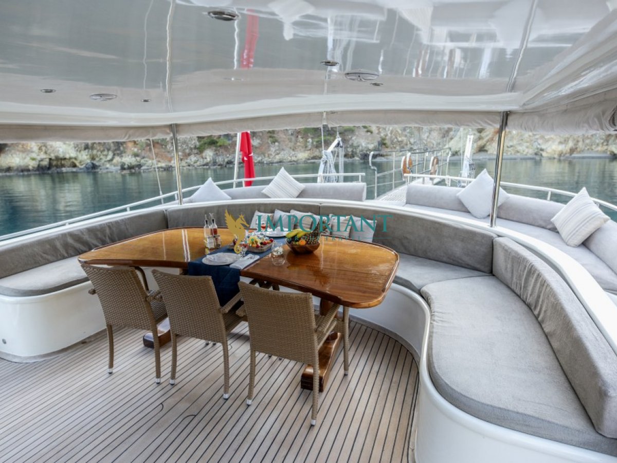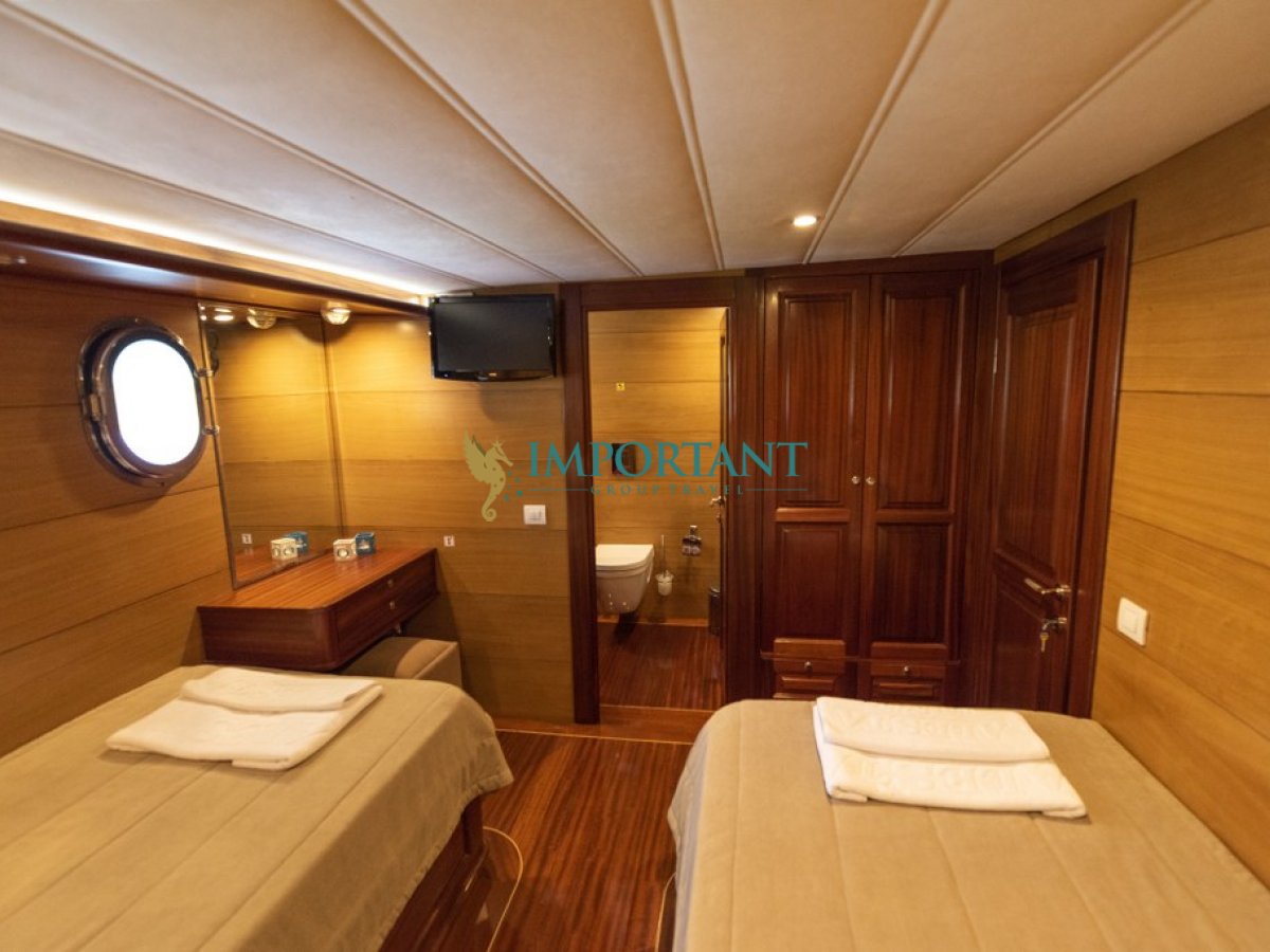 28 metre uzunluğundaki bu lüks gulet, Fethiye çıkışlı olarak Ege Denizi’nin büyüleyici koylarını ve masmavi sularını keşfetmeniz için eşsiz bir fırsat sunuyor. 2 adet master, 2 adet twin ve 1 adet double kabin ile toplamda 10 kişilik konaklama kapasitesine sahip olan teknemiz, konfor ve lüksü bir arada sunmak üzere tasarlanmıştır.