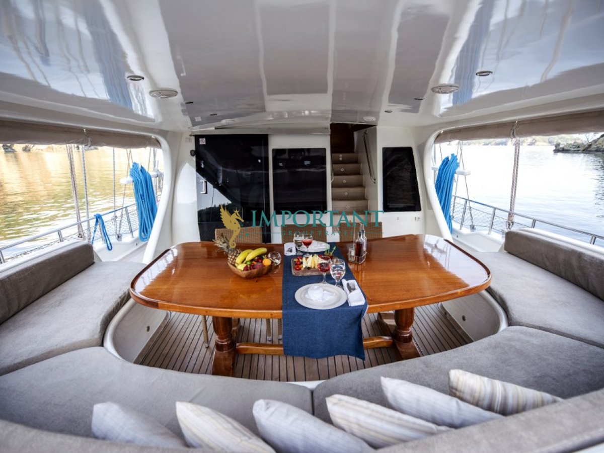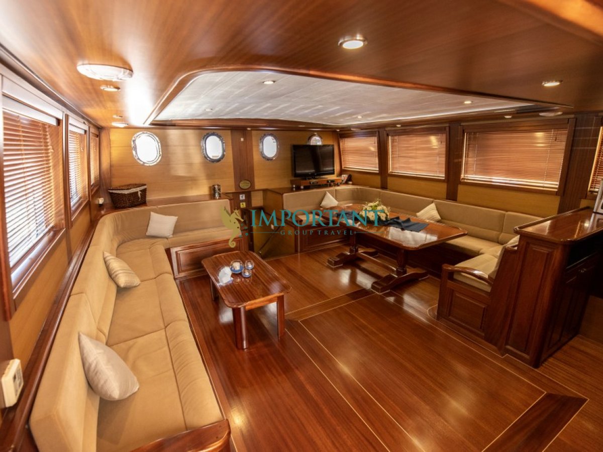 İç dizaynı, misafirlerimizin ihtiyaçlarını karşılamak üzere özenle dekore edilmiştir. Geniş salonunda ve güvertesinde yer alan yemek masaları, sevdiklerinizle birlikte keyifli yemekler yiyebileceğiniz alanlar sunmaktadır. Tam donanımlı mutfağı, teknede geçirdiğiniz süre boyunca tüm gereksinimlerinizi karşılar. Her kabinde duş, wc ve klima bulunmaktadır; böylece denizde bile evinizin rahatlığını hissedebilirsiniz.
