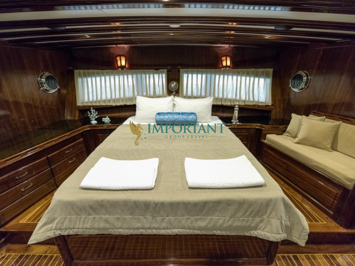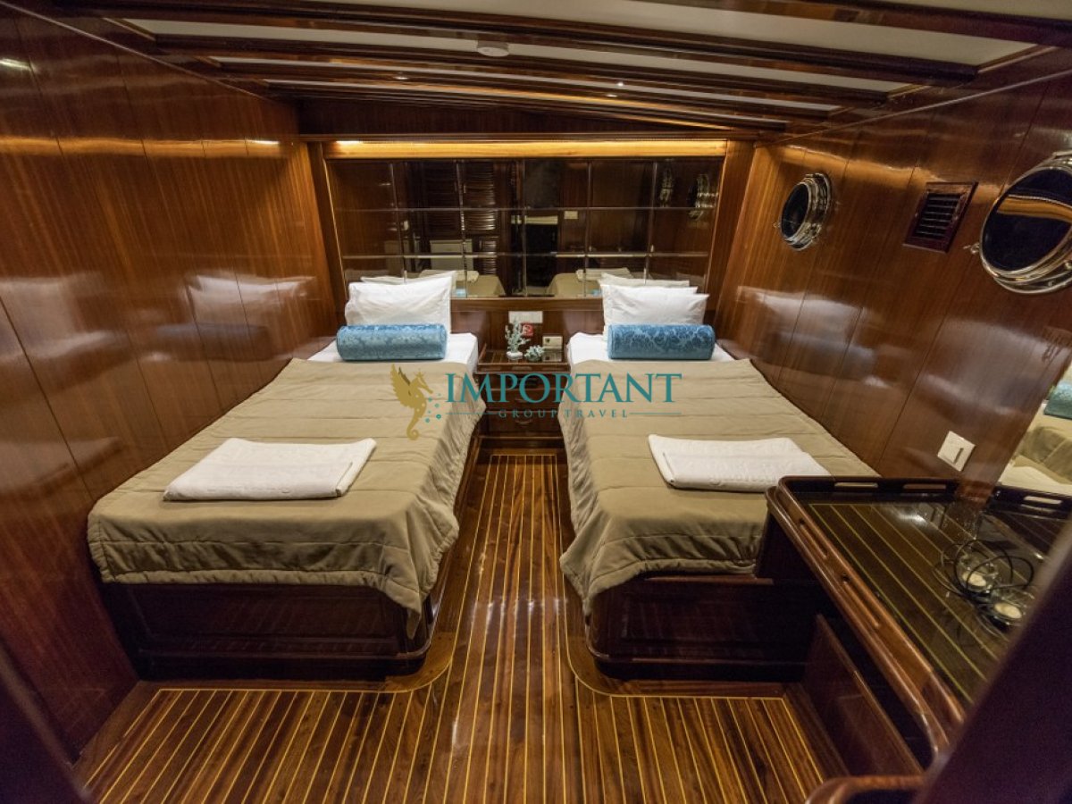 30 metre uzunluğundaki bu lüks gulet, Fethiye çıkışlı olarak Ege Denizi’nin büyüleyici koylarını ve masmavi sularını keşfetmeniz için eşsiz bir fırsat sunuyor. 2 adet master, 2 adet çift kişilik yataklı Double ve 2 adet tek kişilik ayrı yataklı Twin ile toplamda 12 kişilik konaklama kapasitesine sahip olan teknemiz, konfor ve lüksü bir arada sunmak üzere tasarlanmıştır.