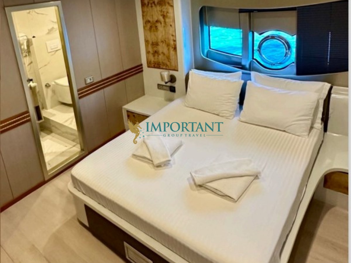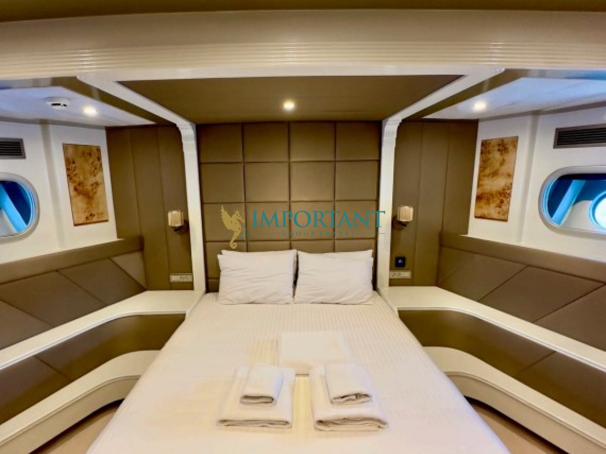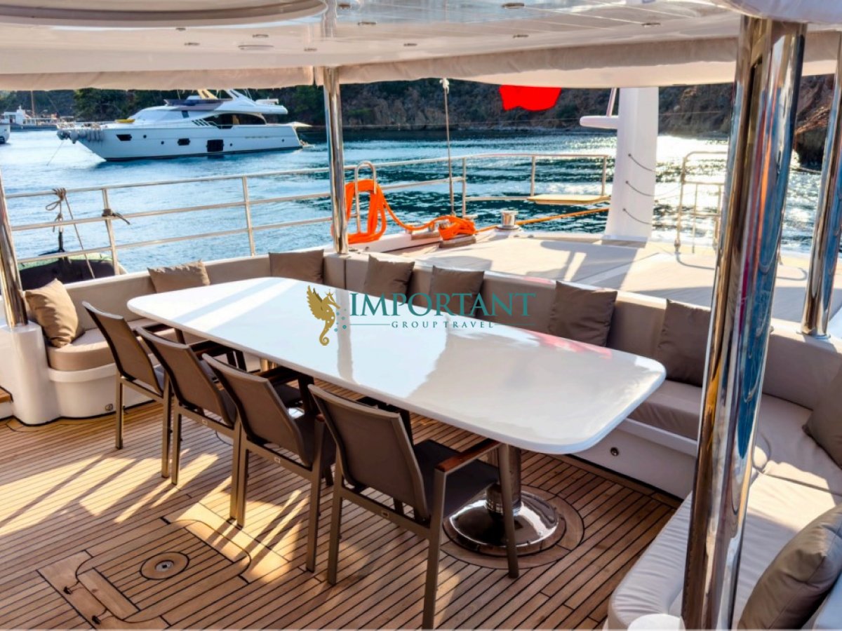 35 metre uzunluğundaki, Göcek çıkışlı bu özel gulet, Ege Denizi’nin büyüleyici koylarını ve masmavi sularını keşfetmeniz için eşsiz bir fırsat sunuyor. 2 adet Vip, 1 adet master ve 2 adet twin kabini ile toplamda 10 kişilik konaklama kapasitesine sahip olan teknemiz, konfor ve lüksü bir arada sunmak üzere tasarlanmıştır.