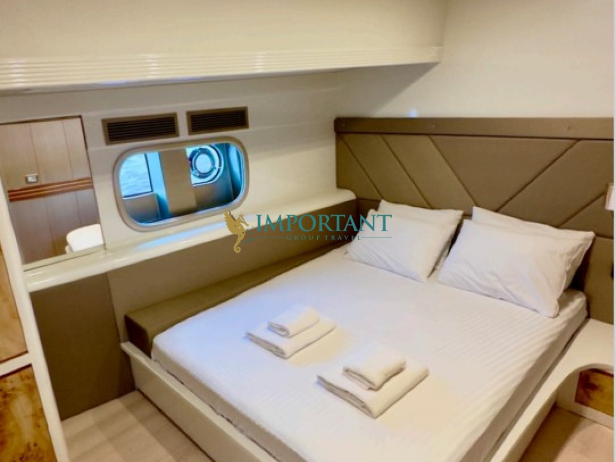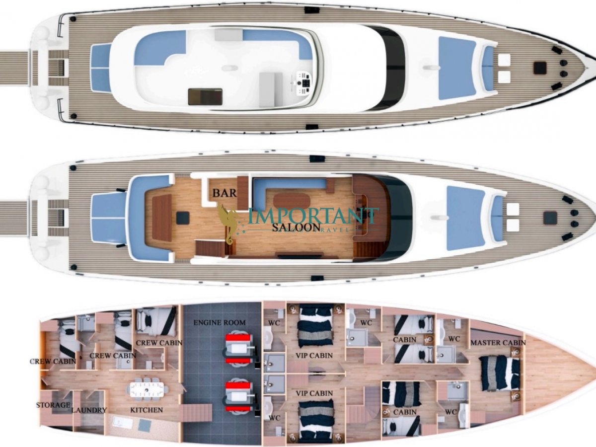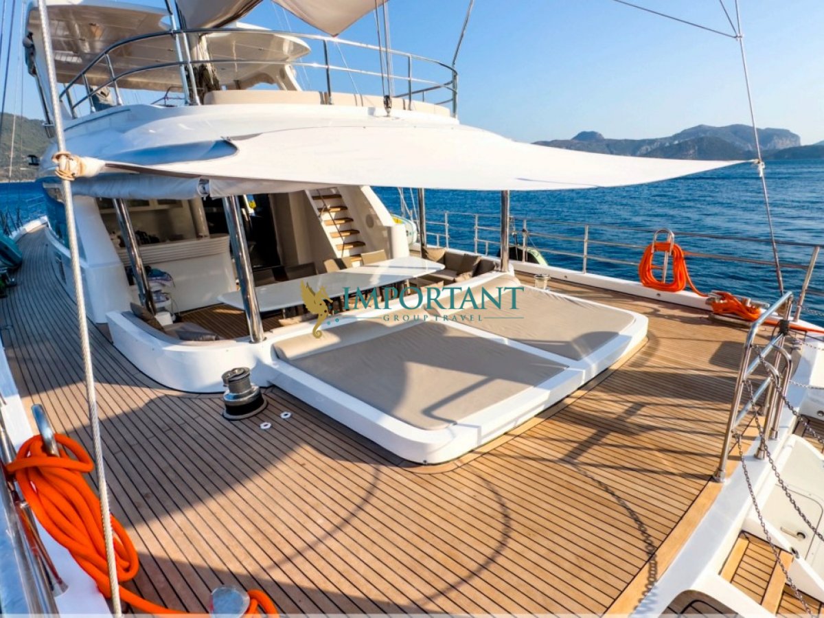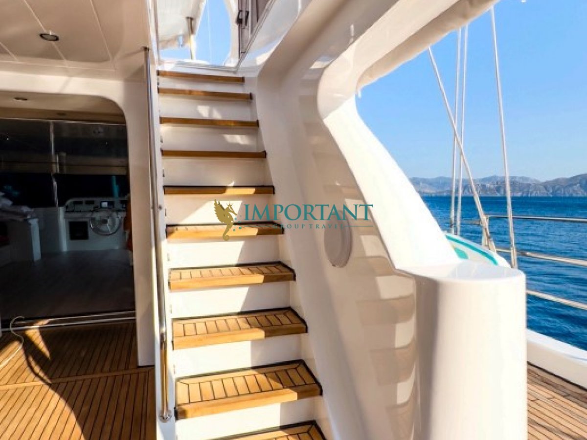 35 metre uzunluğundaki, Göcek çıkışlı bu özel gulet, Ege Denizi’nin büyüleyici koylarını ve masmavi sularını keşfetmeniz için eşsiz bir fırsat sunuyor. 2 adet Vip, 1 adet master ve 2 adet twin kabini ile toplamda 10 kişilik konaklama kapasitesine sahip olan teknemiz, konfor ve lüksü bir arada sunmak üzere tasarlanmıştır.