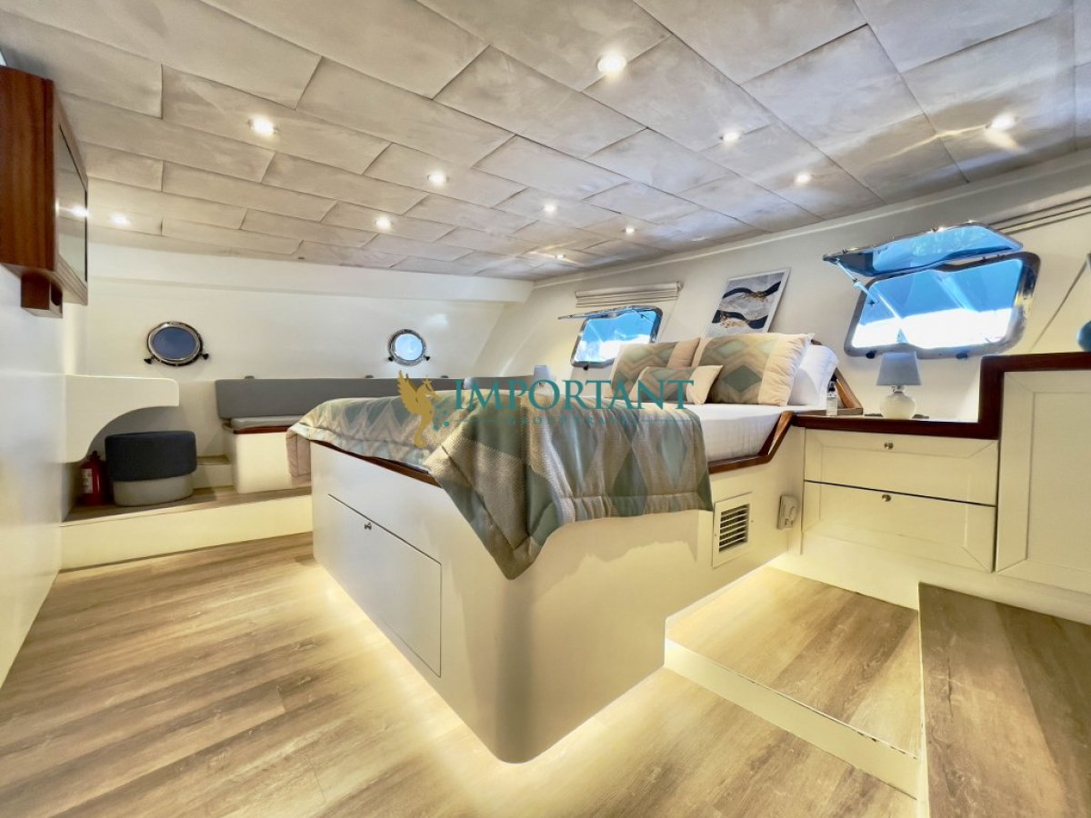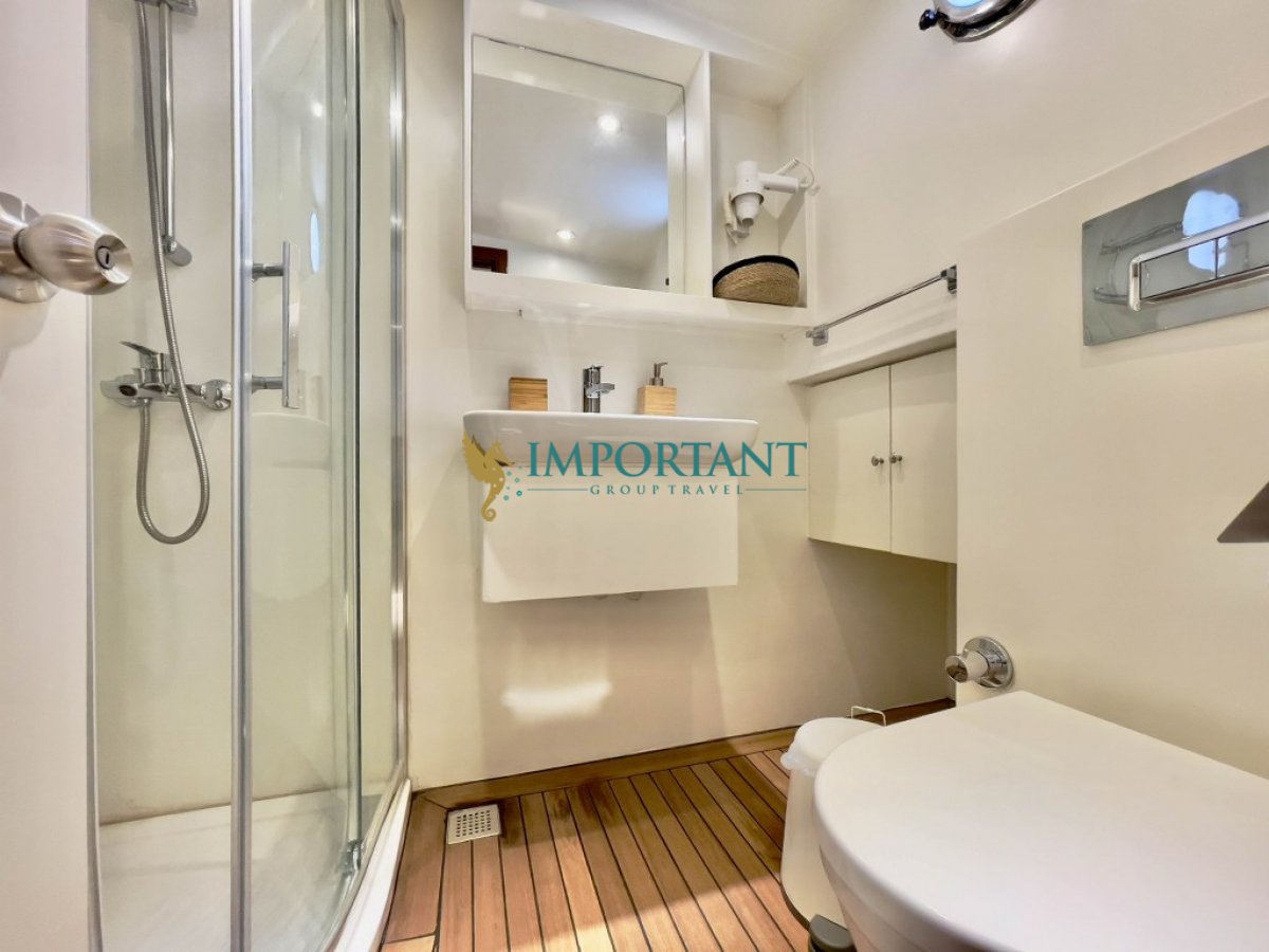 İç dizaynı, misafirlerimizin ihtiyaçlarını karşılamak üzere özenle dekore edilmiştir. Geniş salonunda ve güvertesinde yer alan yemek masaları, sevdiklerinizle birlikte keyifli yemekler yiyebileceğiniz alanlar sunmaktadır. Tam donanımlı mutfağı, teknede geçirdiğiniz süre boyunca tüm gereksinimlerinizi karşılar. Her kabinde duş, wc ve klima (10 saat kullanım), akıllı TV ile uydu sistemi bulunmaktadır; böylece denizde bile evinizin rahatlığını hissedebilirsiniz.